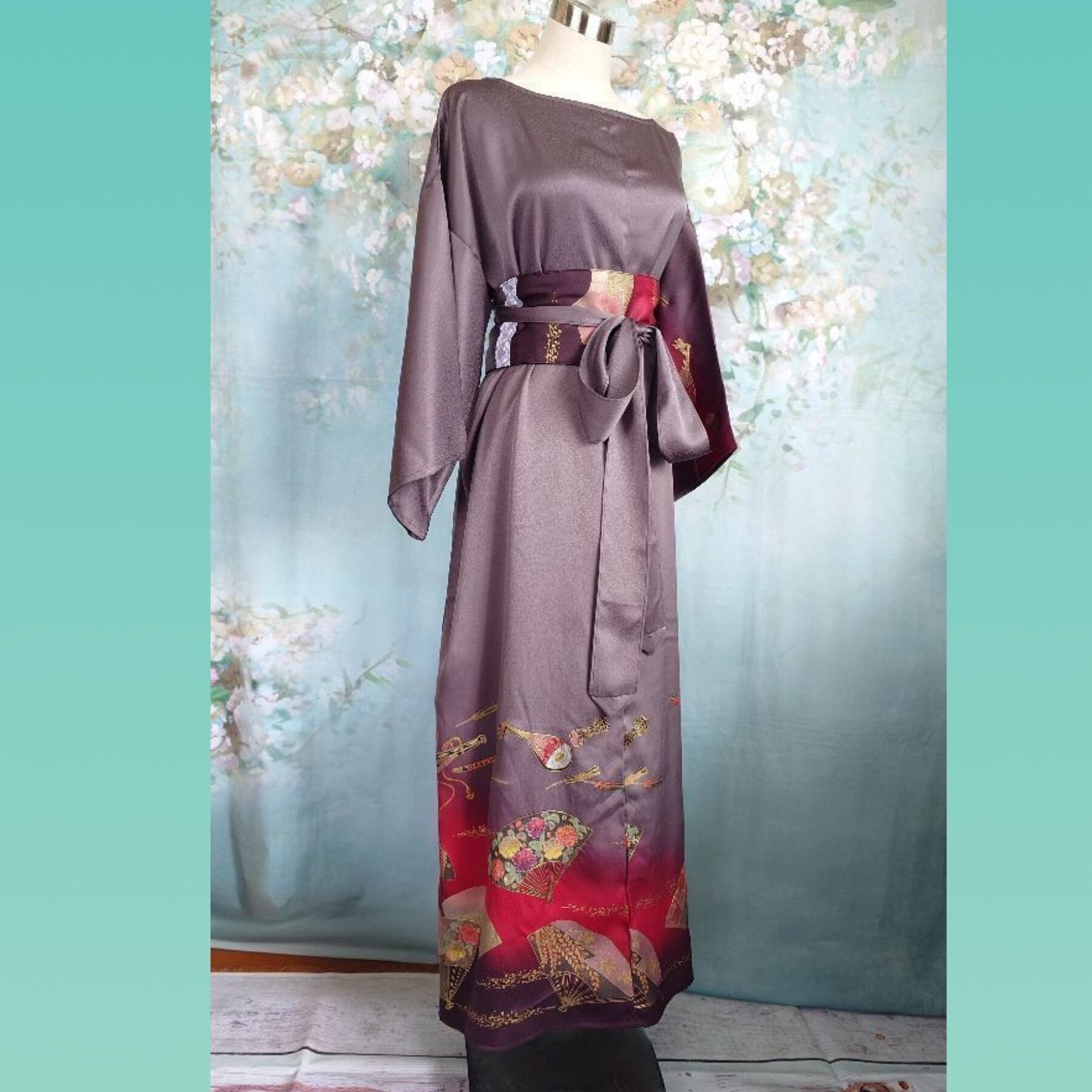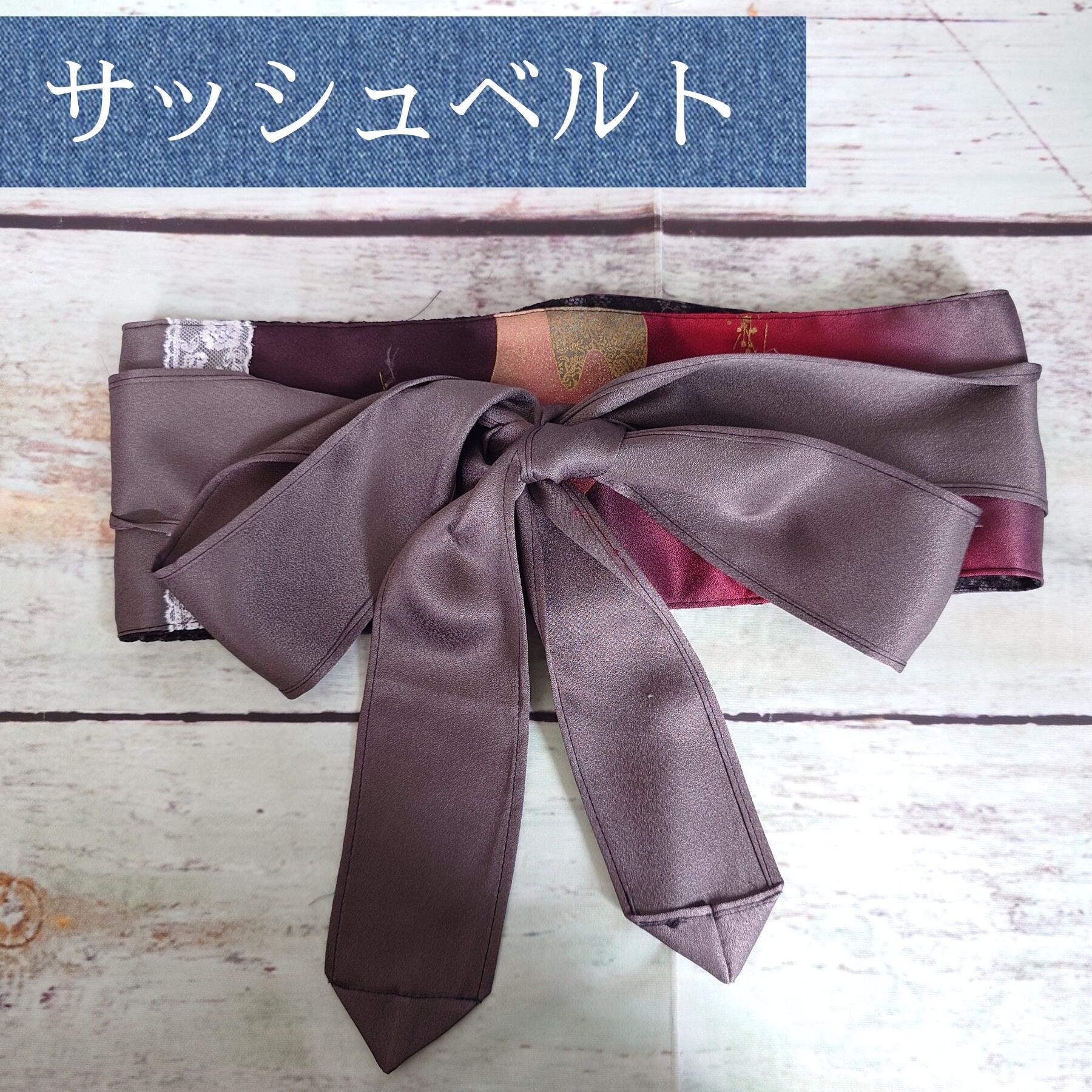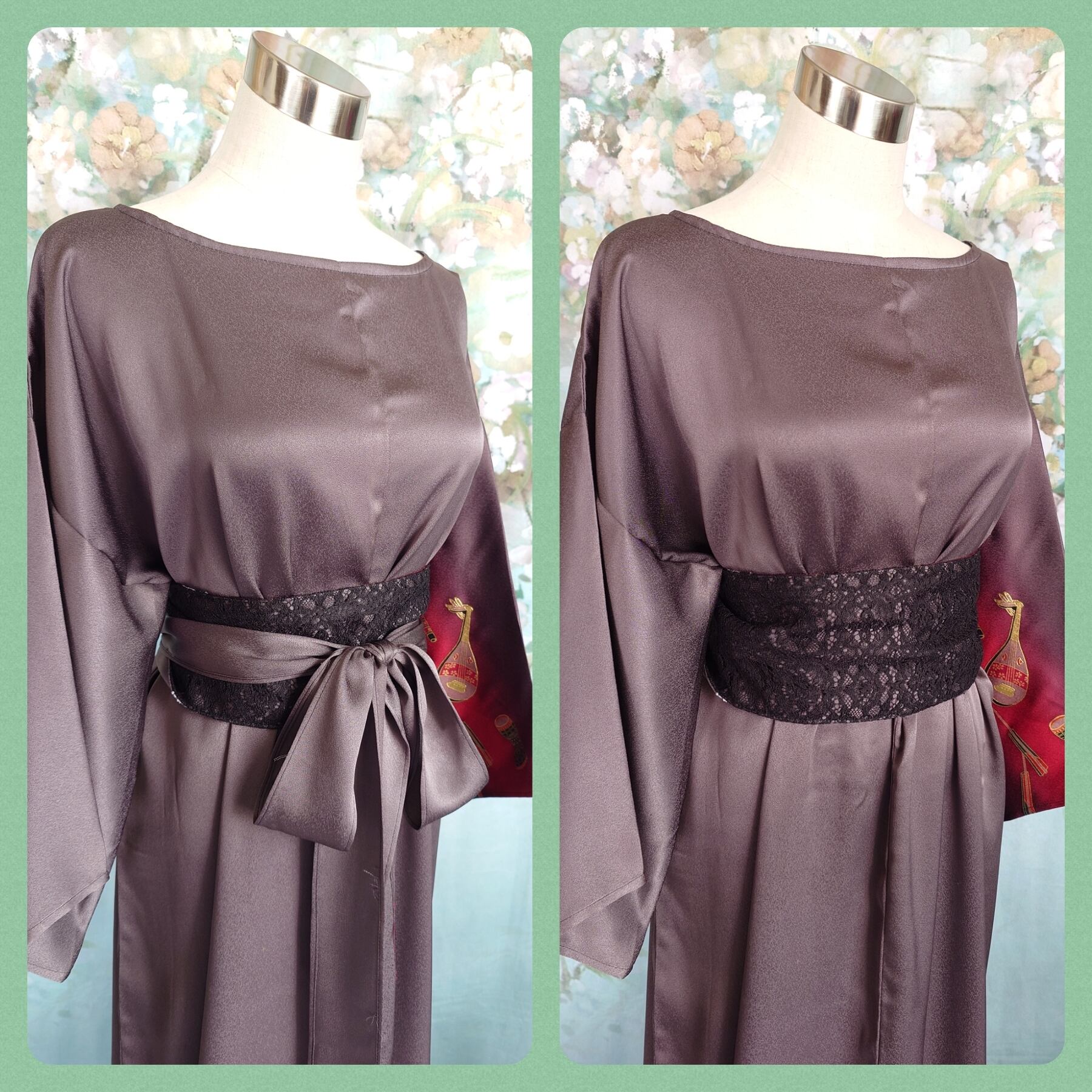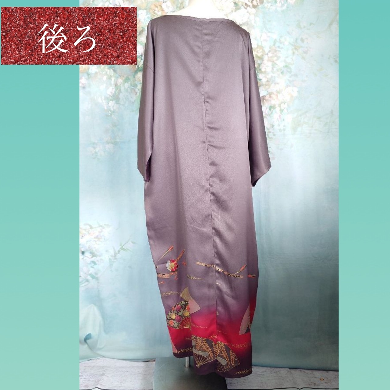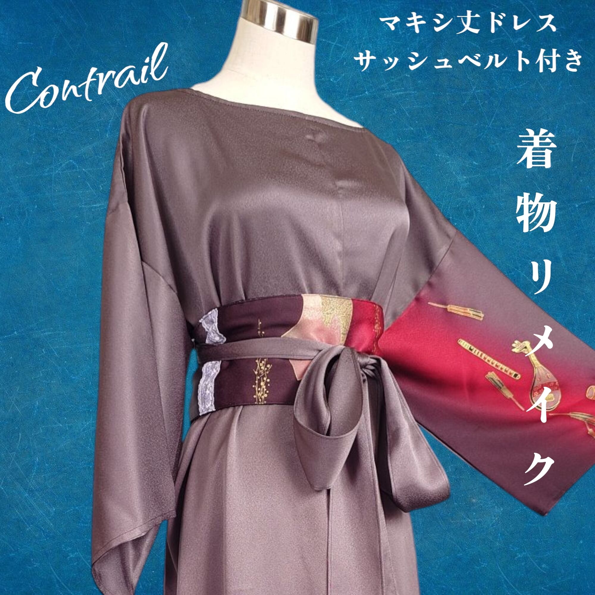 d70 L〜LLサイズ マキシ丈ワンピース ウエストリボン付き 着物リメイク マキシ丈 正絹