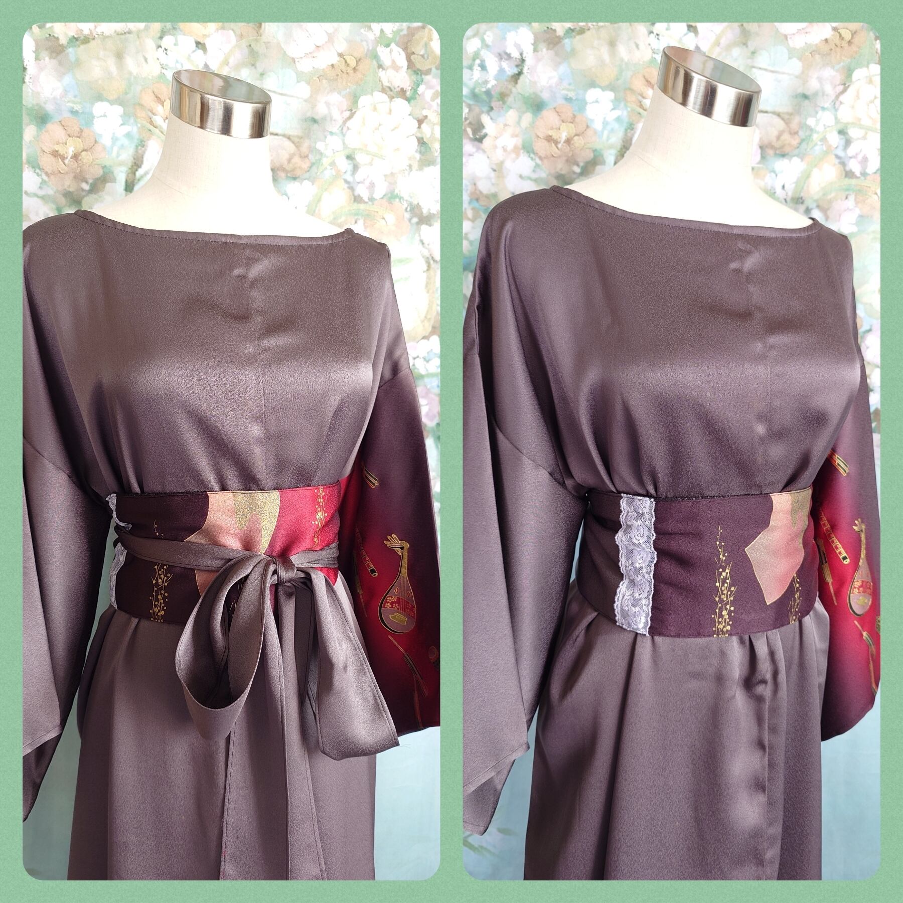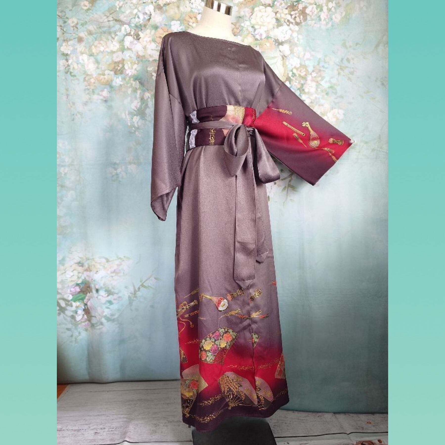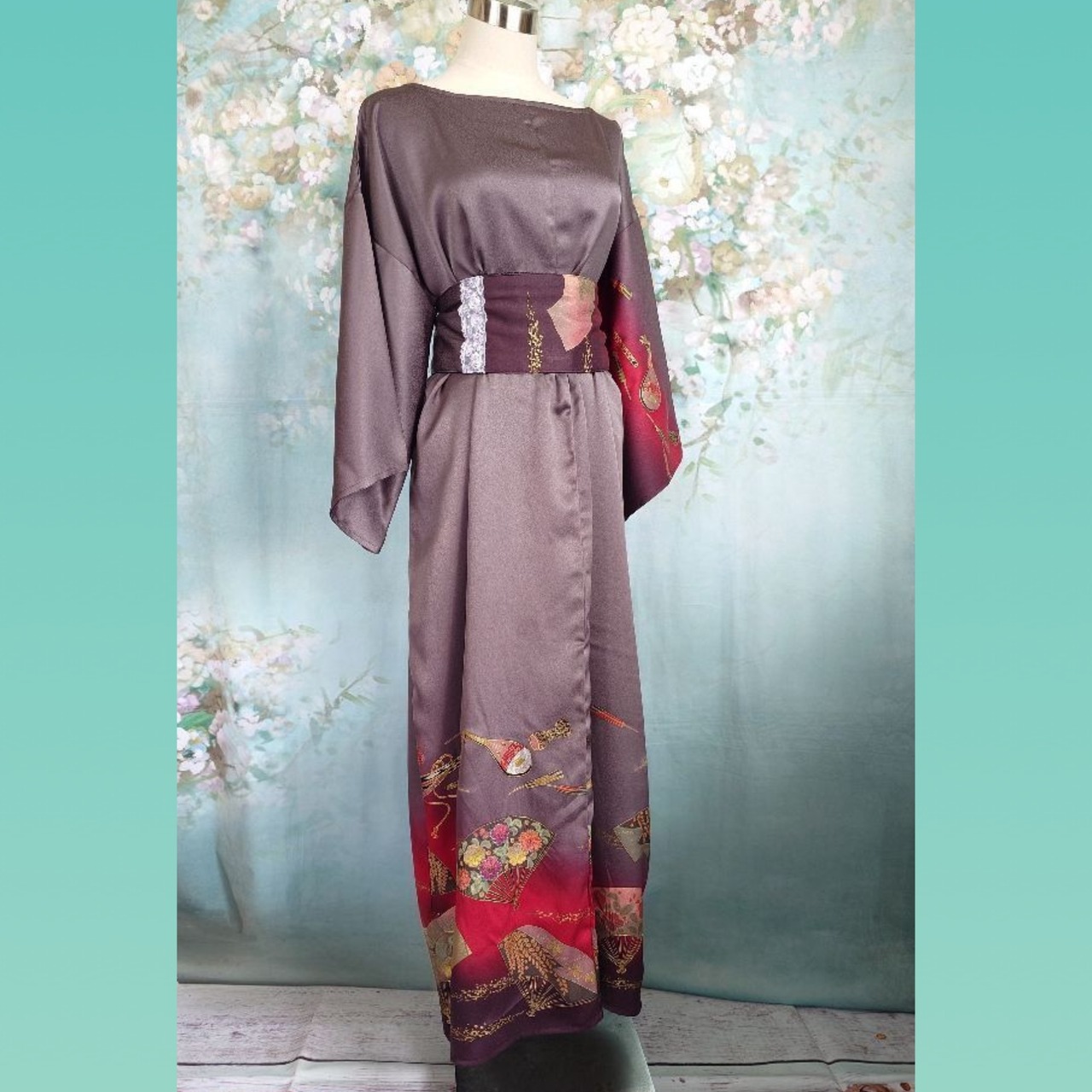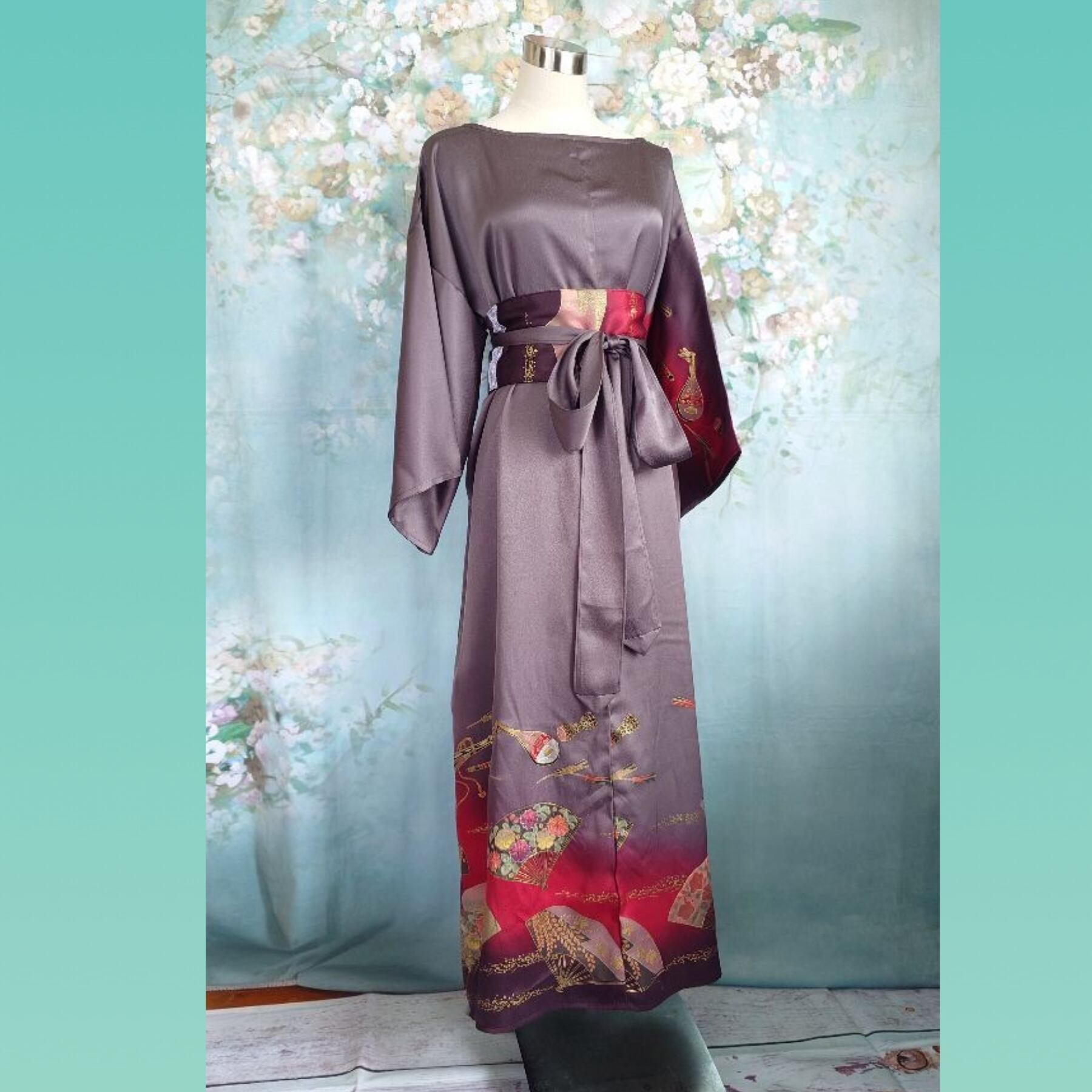 d70 L〜LLサイズ マキシ丈ワンピース ウエストリボン付き 着物リメイク マキシ丈 正絹