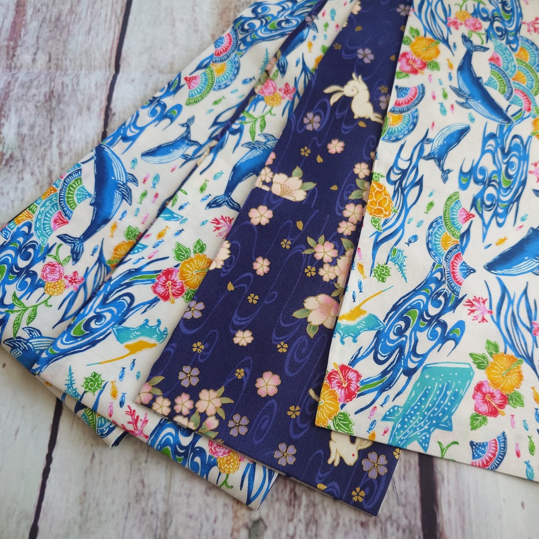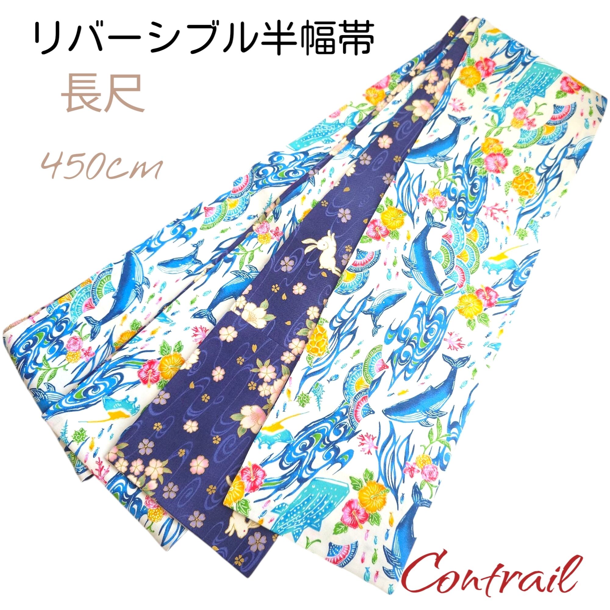 ho152 長尺 4.5m 大人の半幅帯 細帯 リバーシブル ハンドメイド 紅型風 クジラ