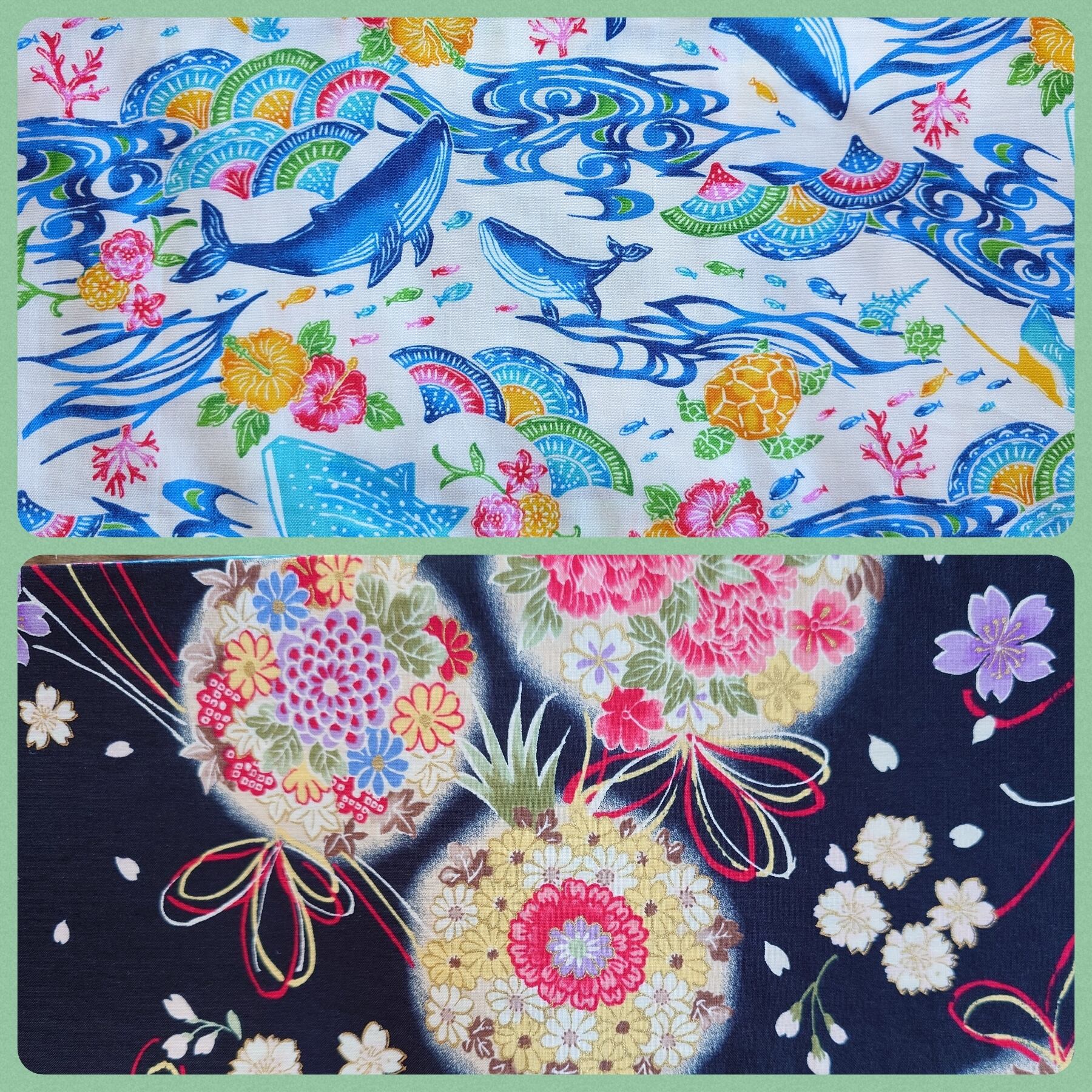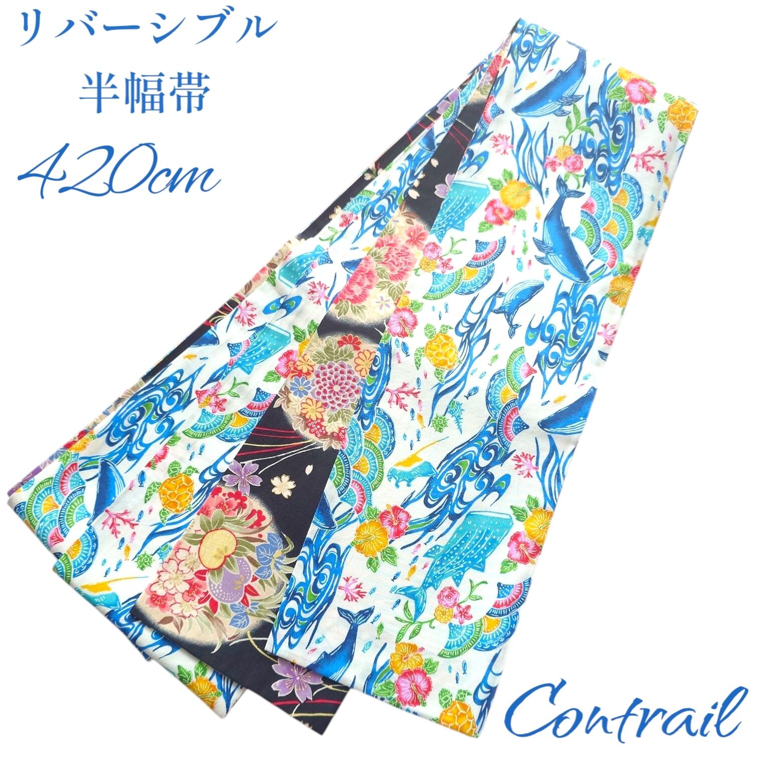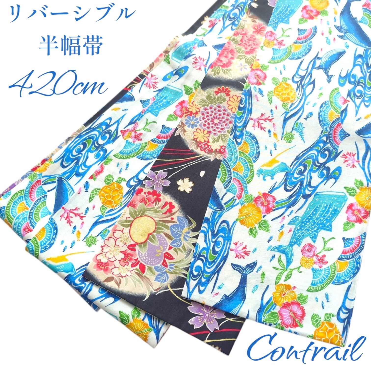 ho161 長尺 4.2m 大人の半幅帯 細帯 リバーシブル ハンドメイド 紅型風 クジラ