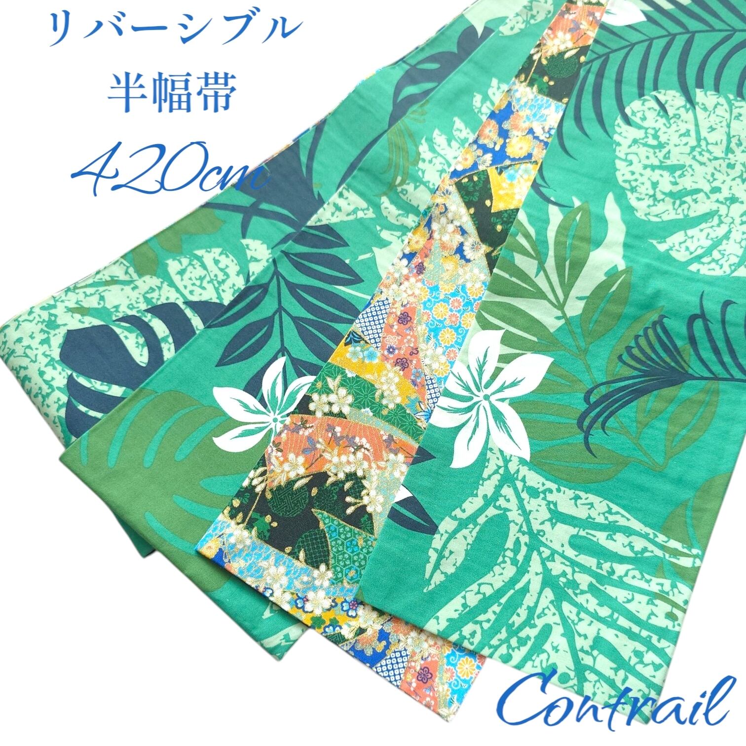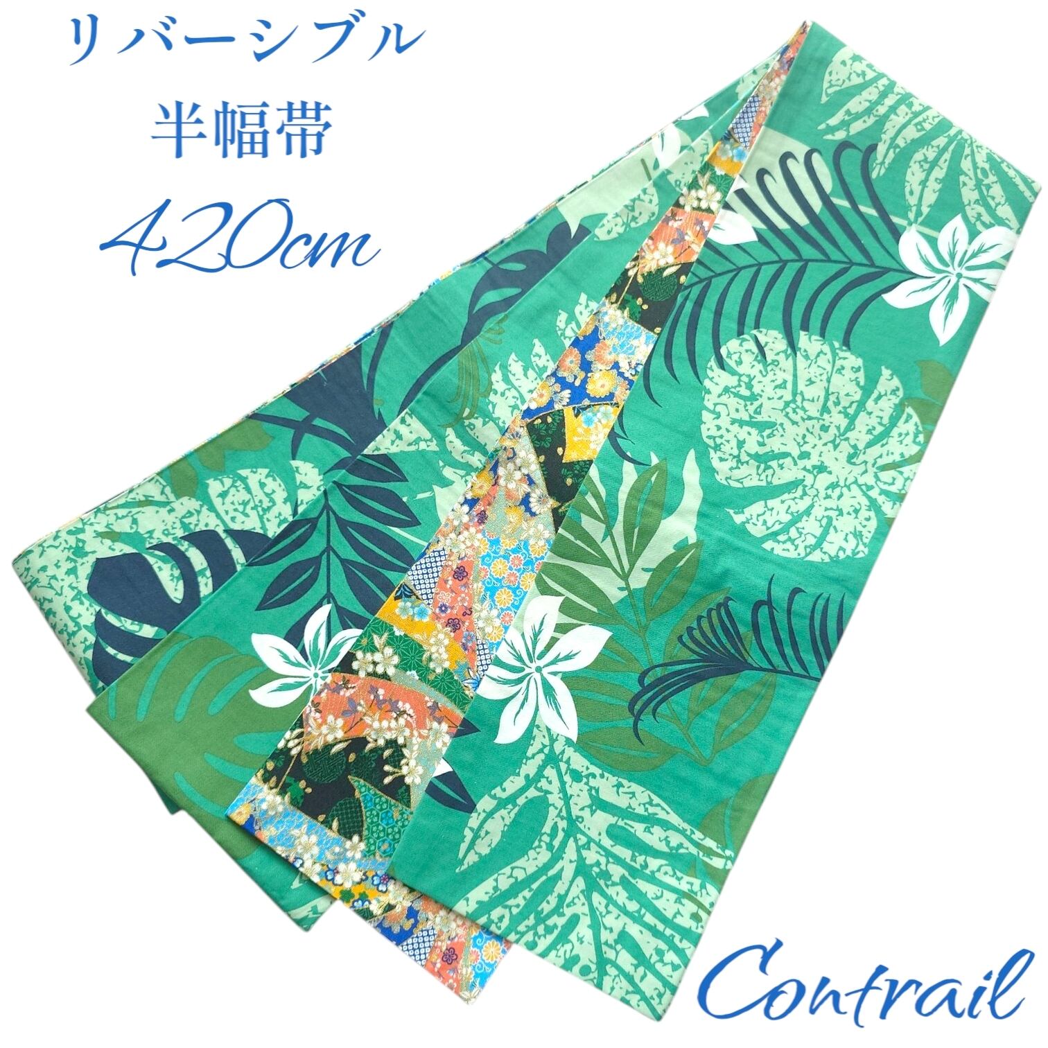 ho160 長尺 4.2m 大人の半幅帯 細帯 リバーシブル ハンドメイド モンステラ ハワイアン 和洋折衷