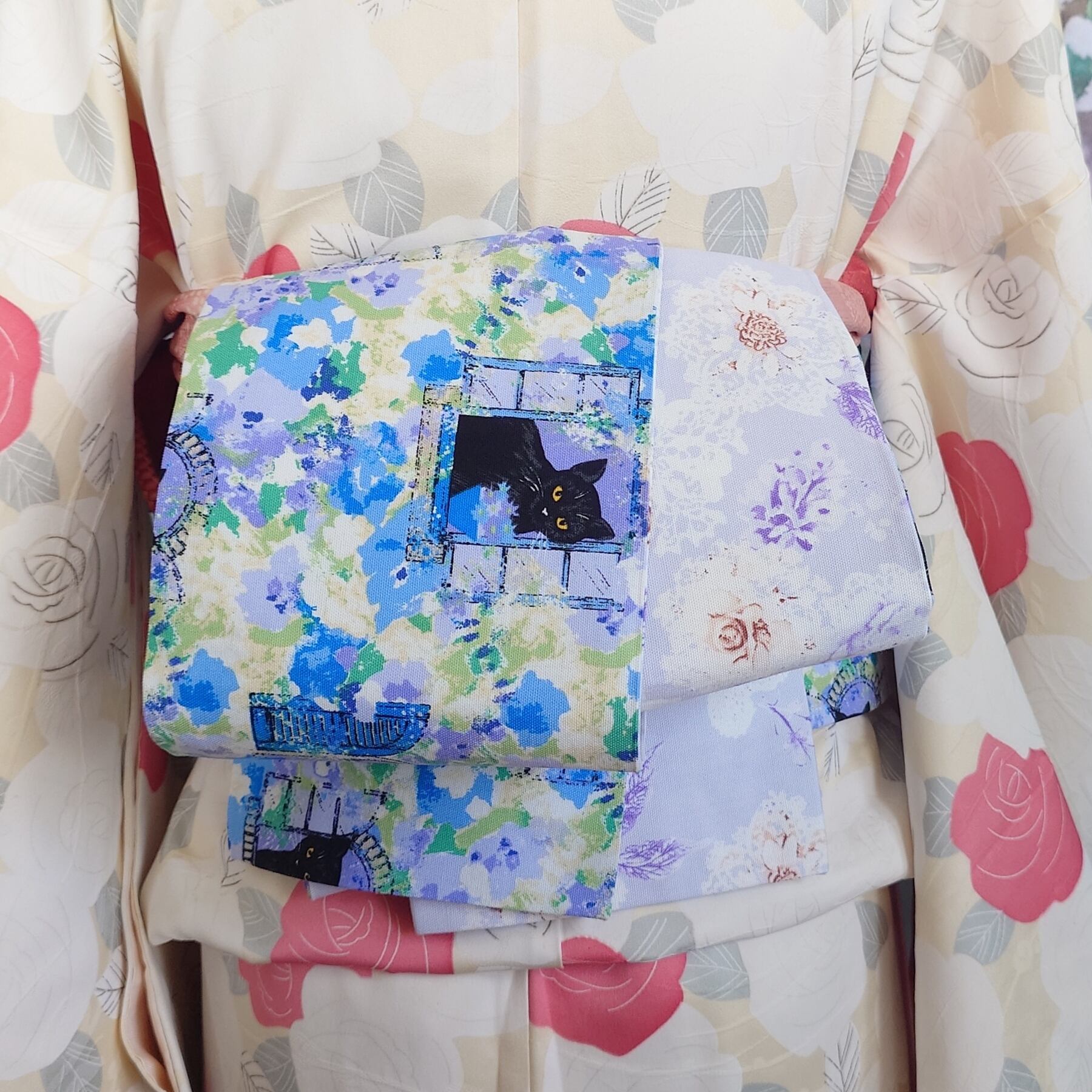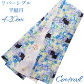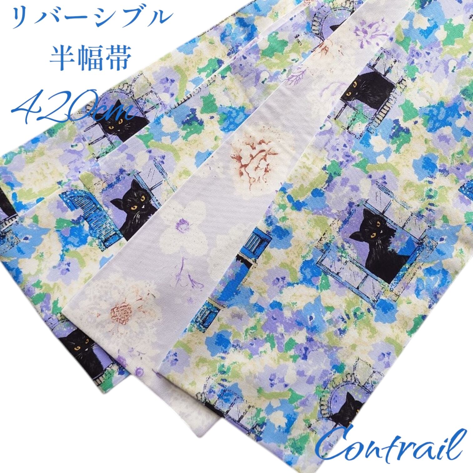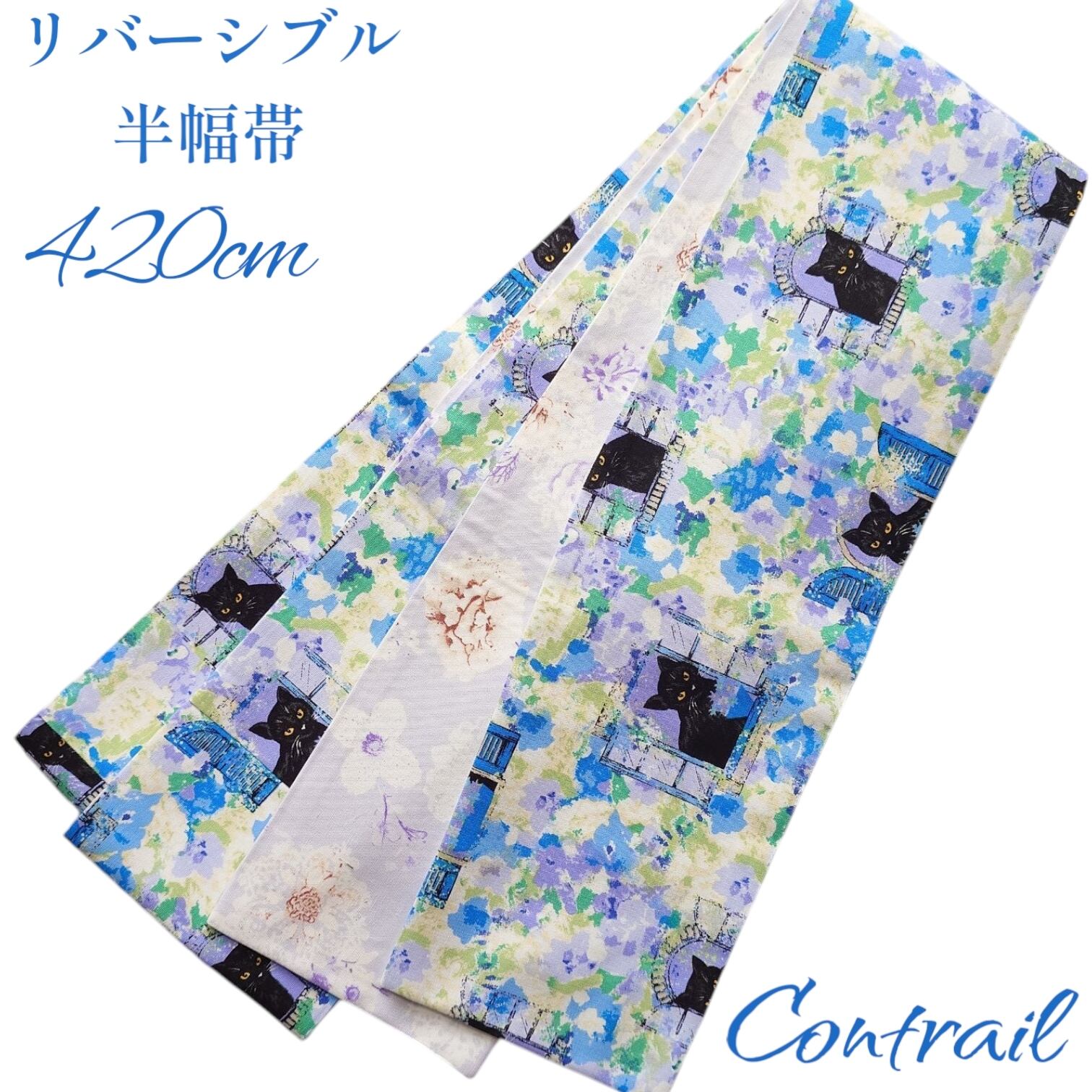 hob166 長尺 4.2m 大人の半幅帯 細帯 リバーシブル ハンドメイド 浴衣 着物 猫