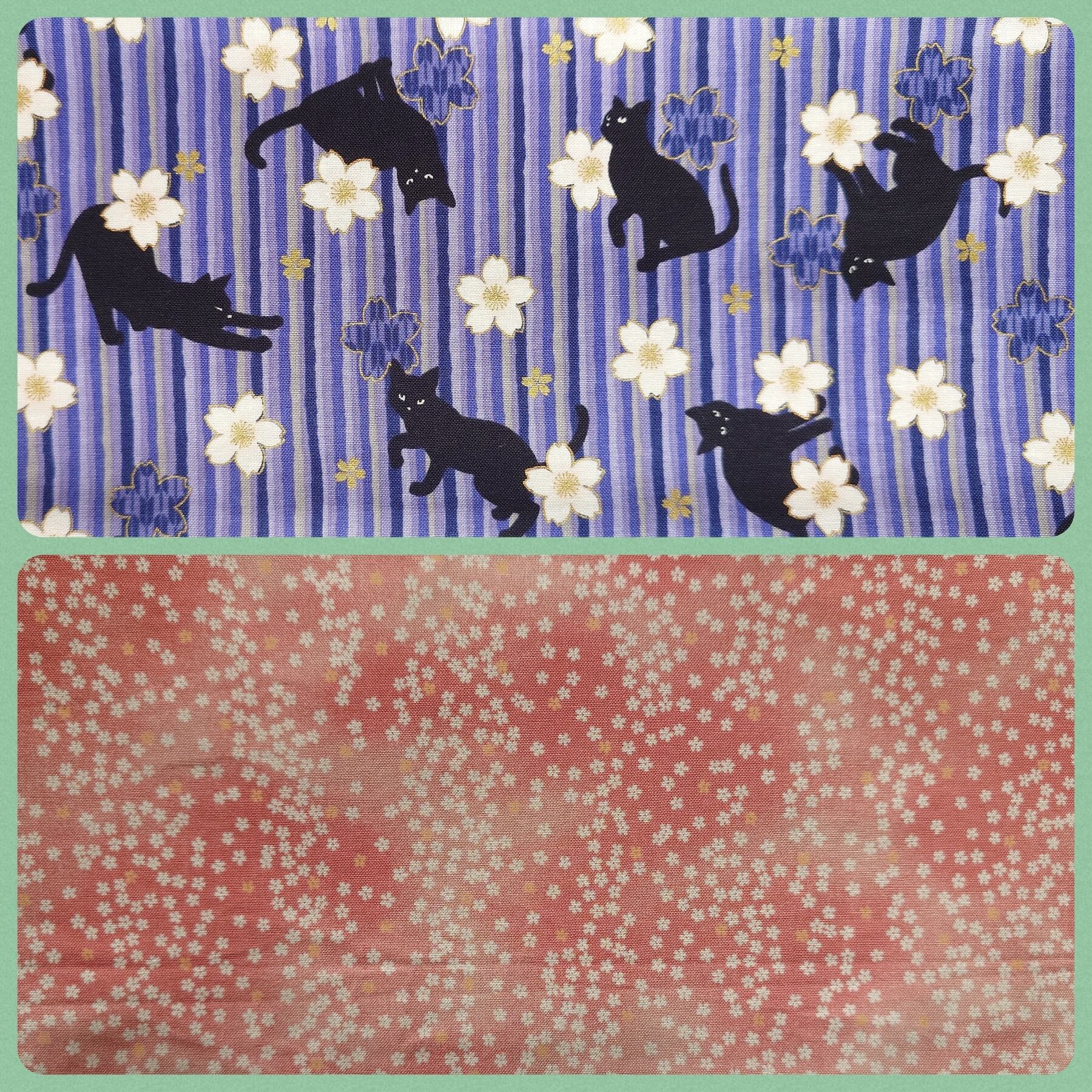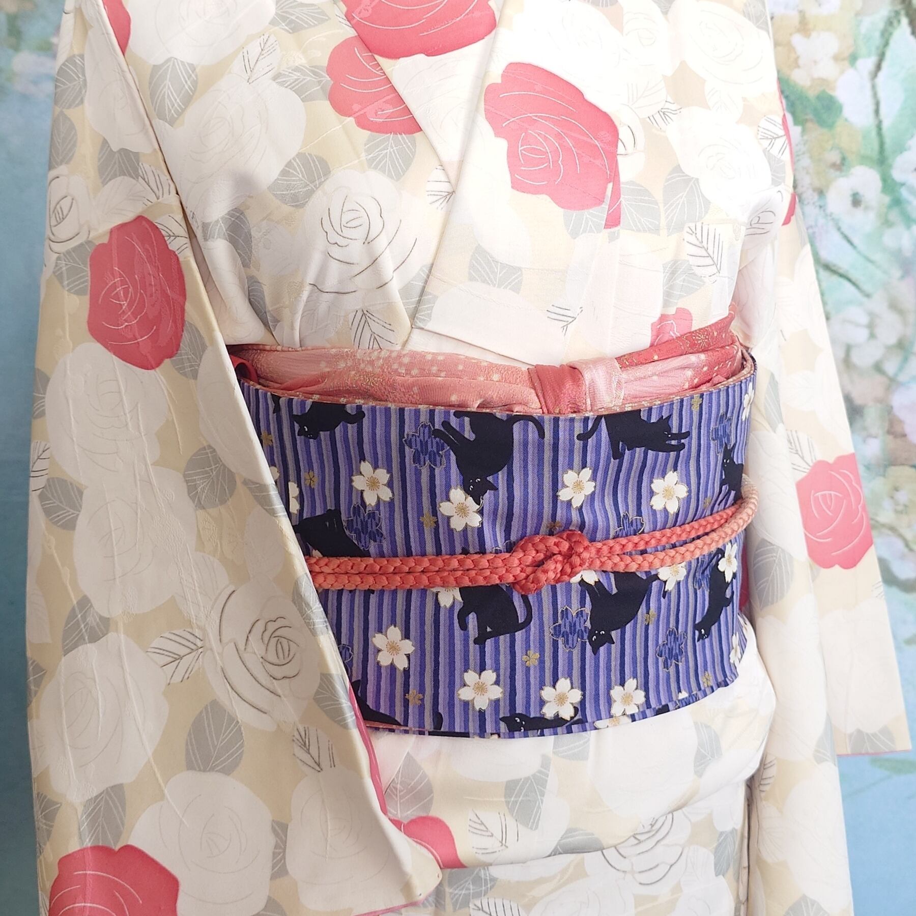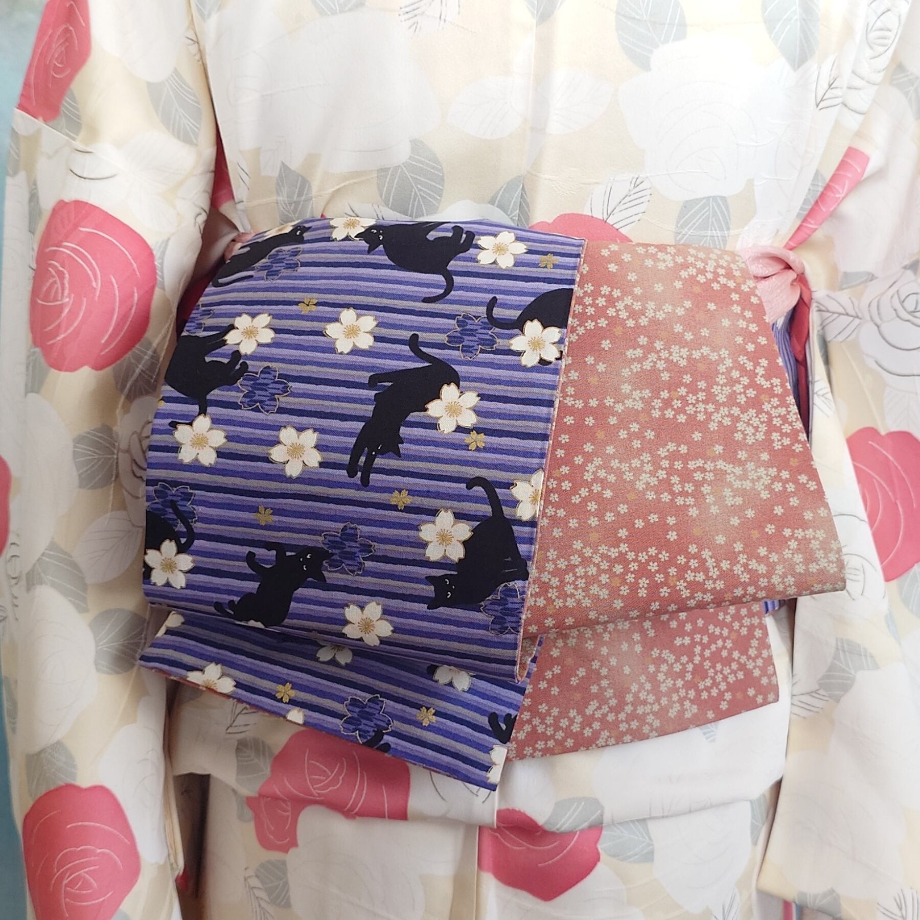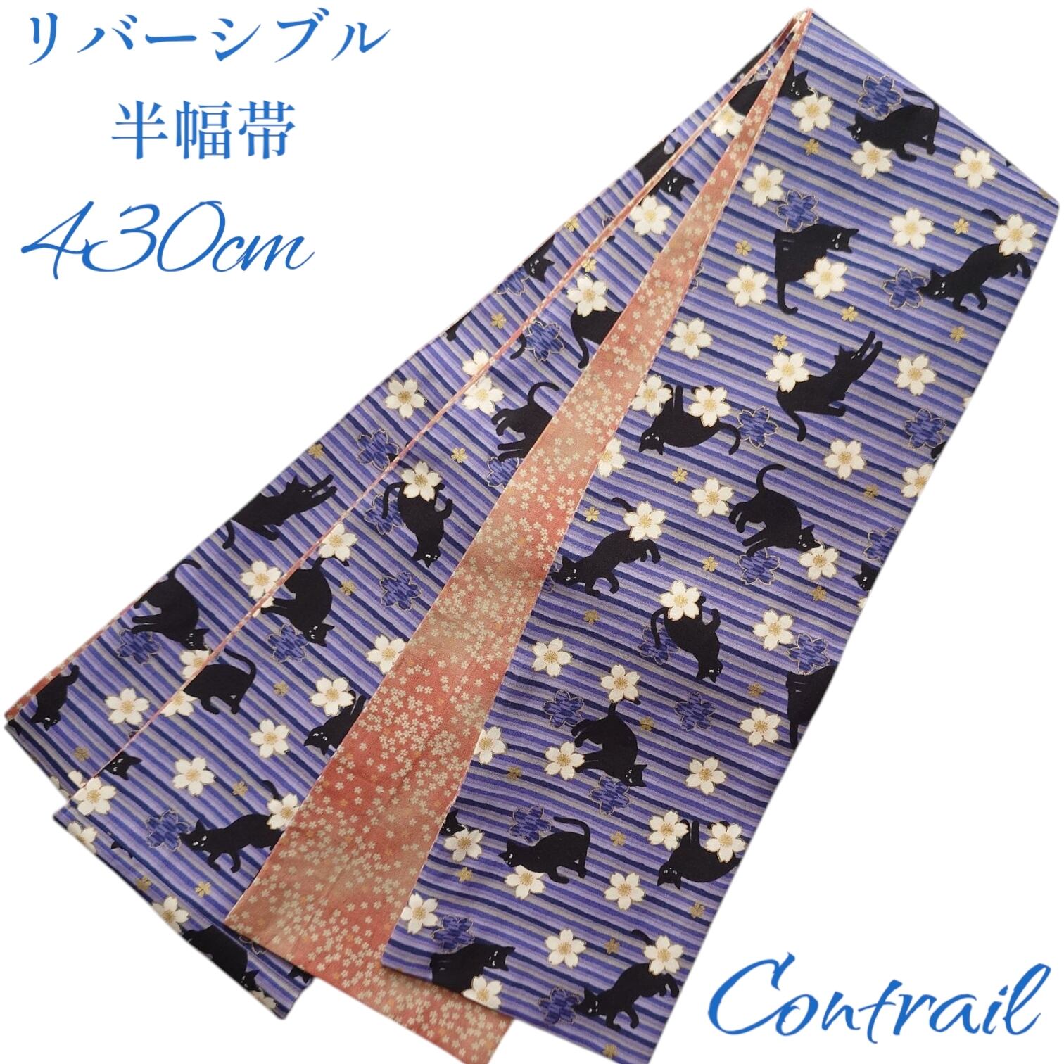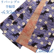 hob168 長尺 4.3m 大人の半幅帯 細帯 リバーシブル ハンドメイド 浴衣 着物 和風 猫