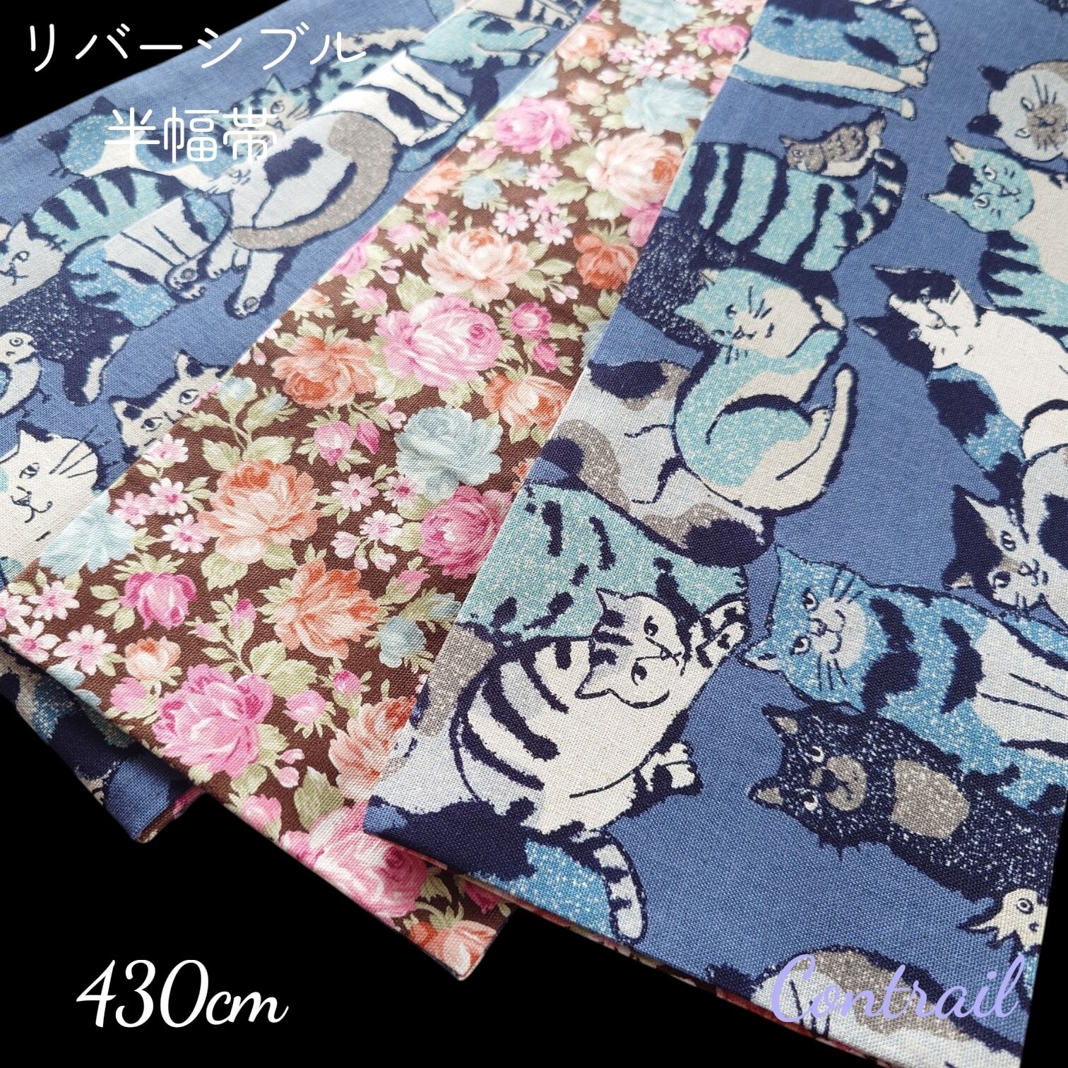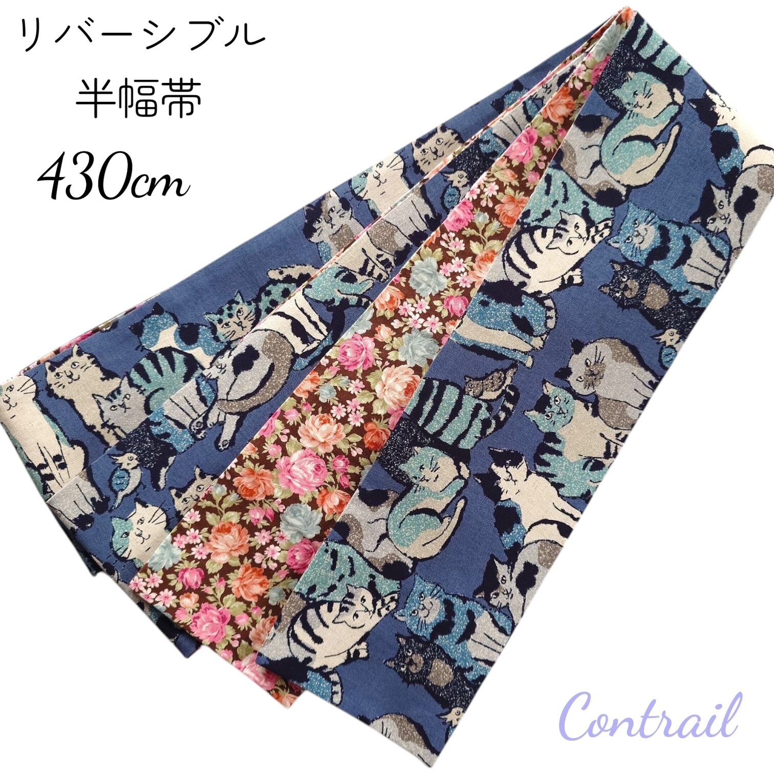 hob182 長尺 4.3m 大人の半幅帯 細帯 リバーシブル 浴衣 着物 猫 猫好き