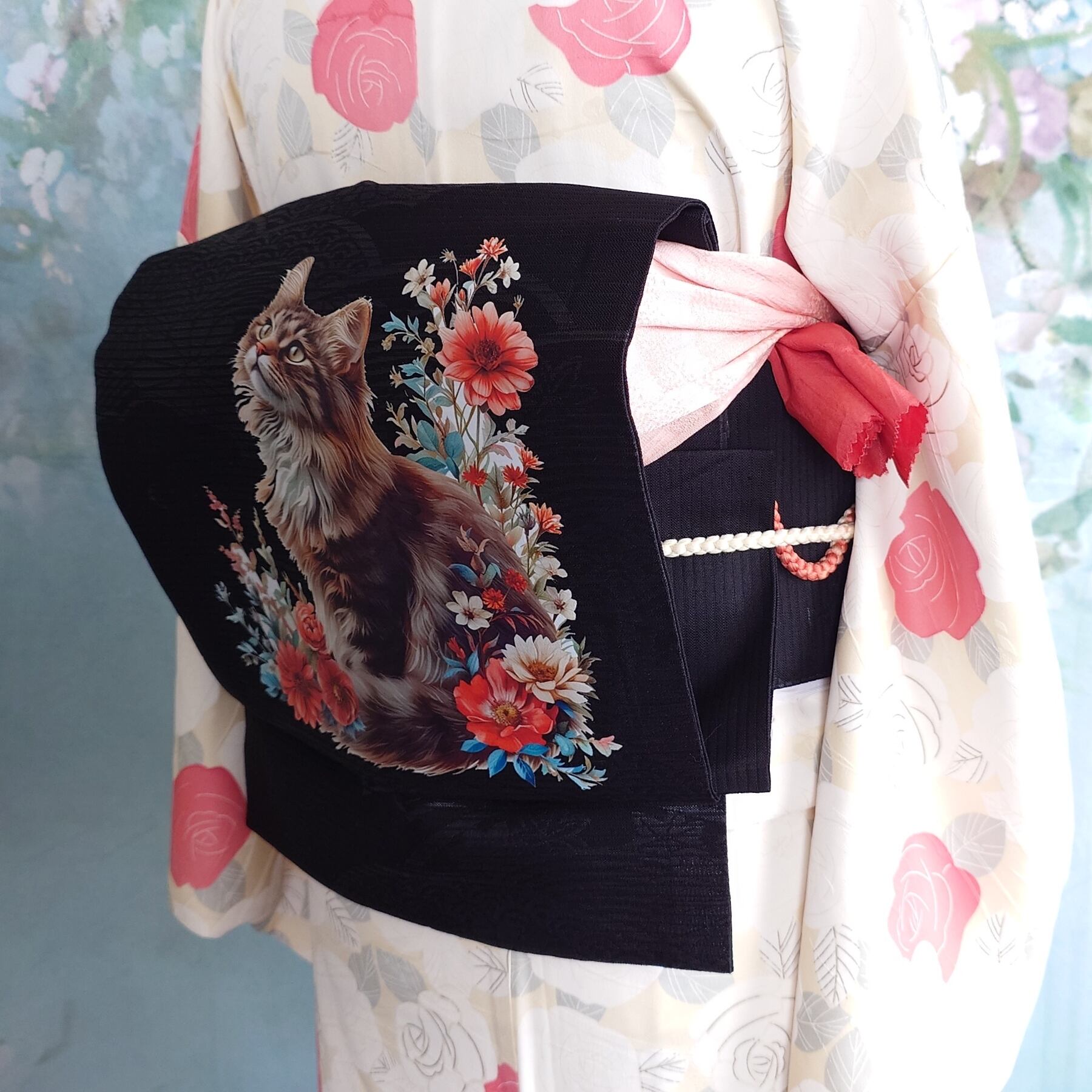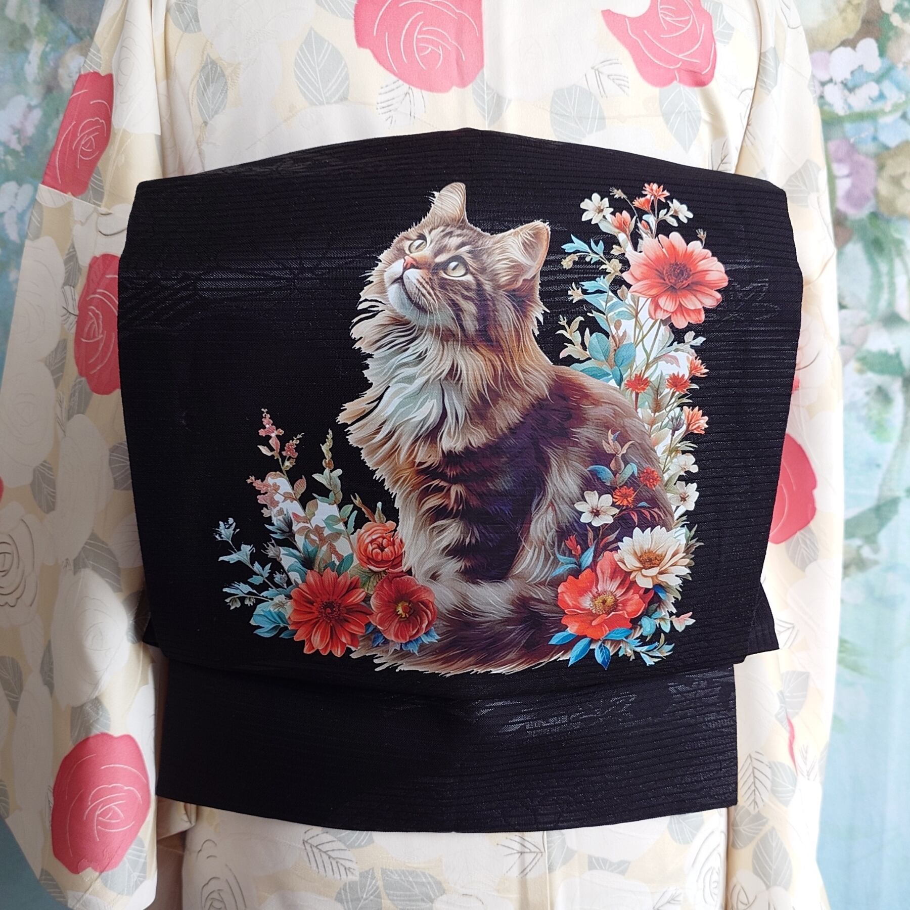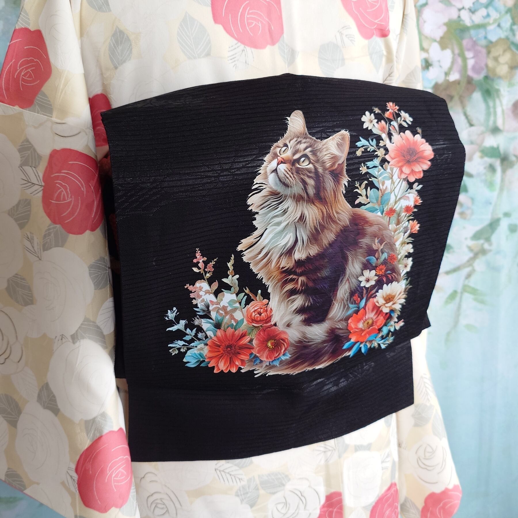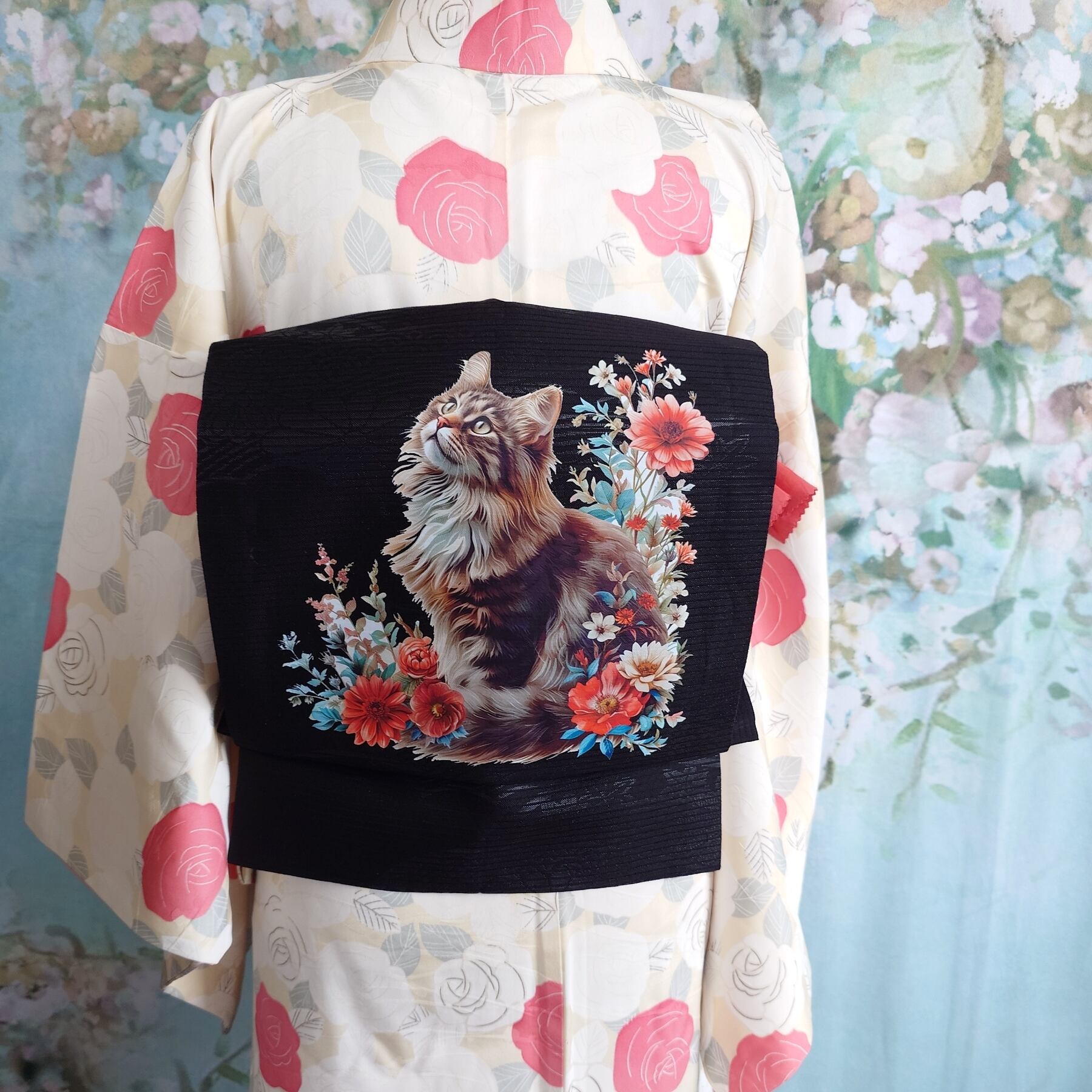 ob187 夏帯 フック付 二部式作り帯 一重太鼓結び 名古屋帯 簡単帯 着物 浴衣 猫