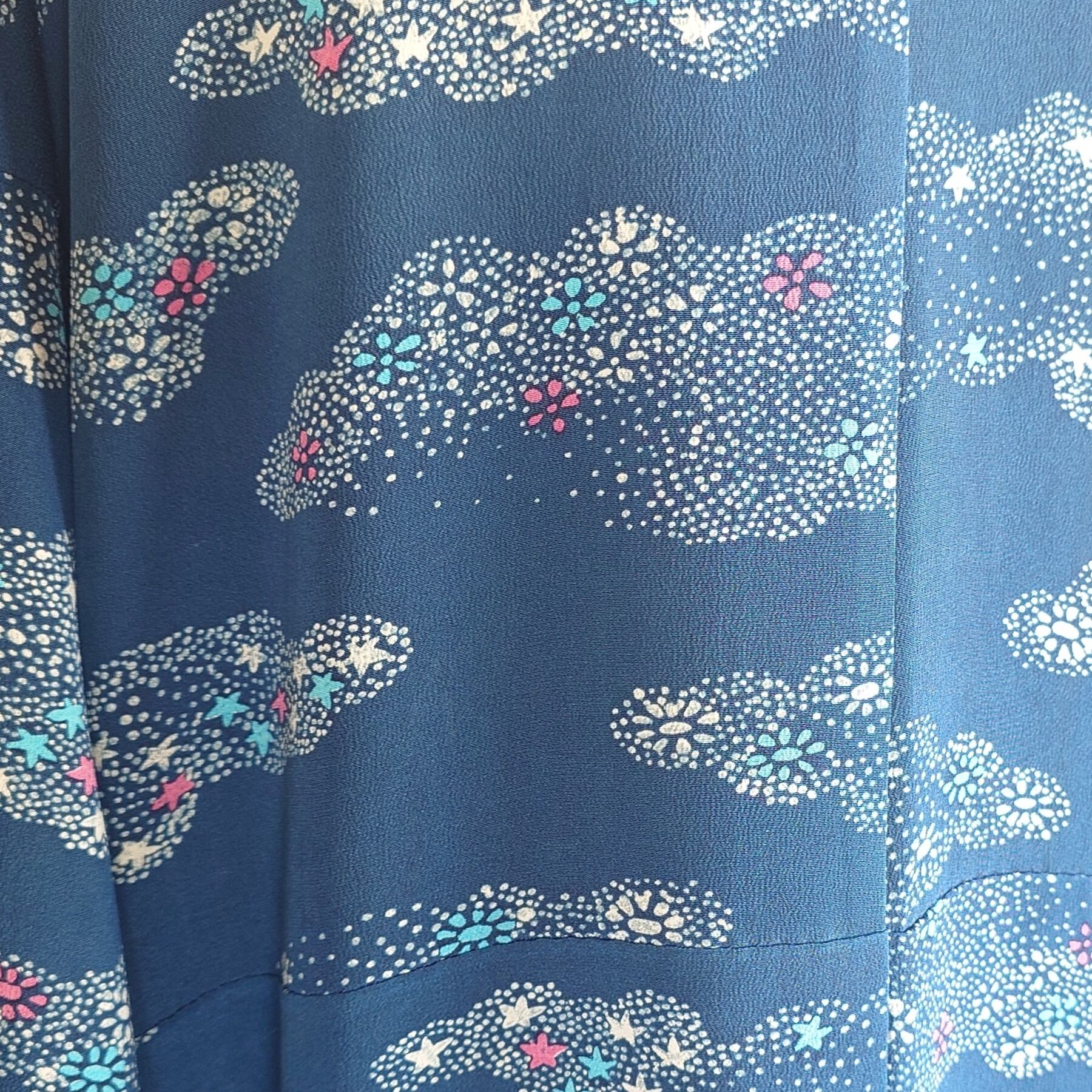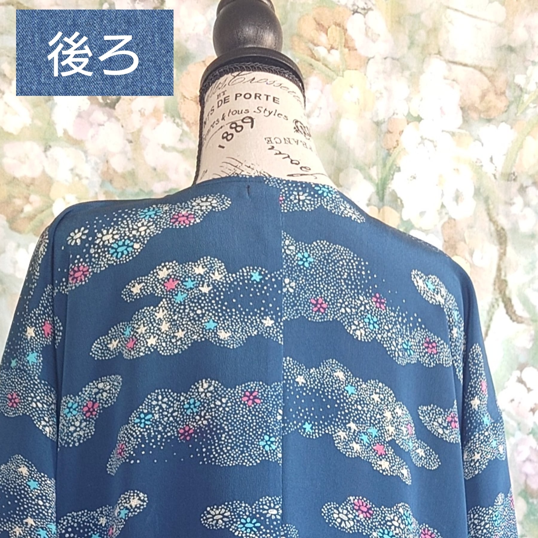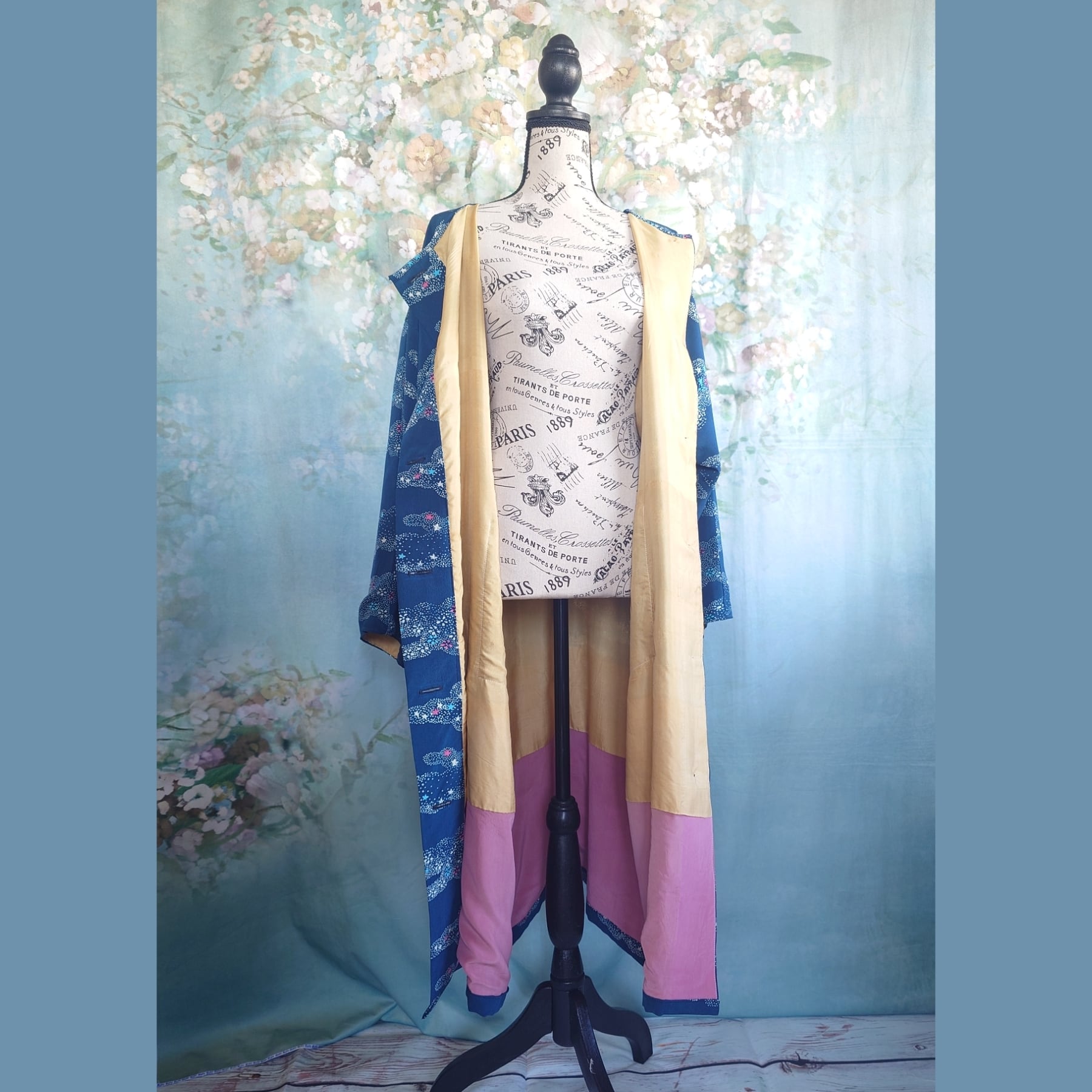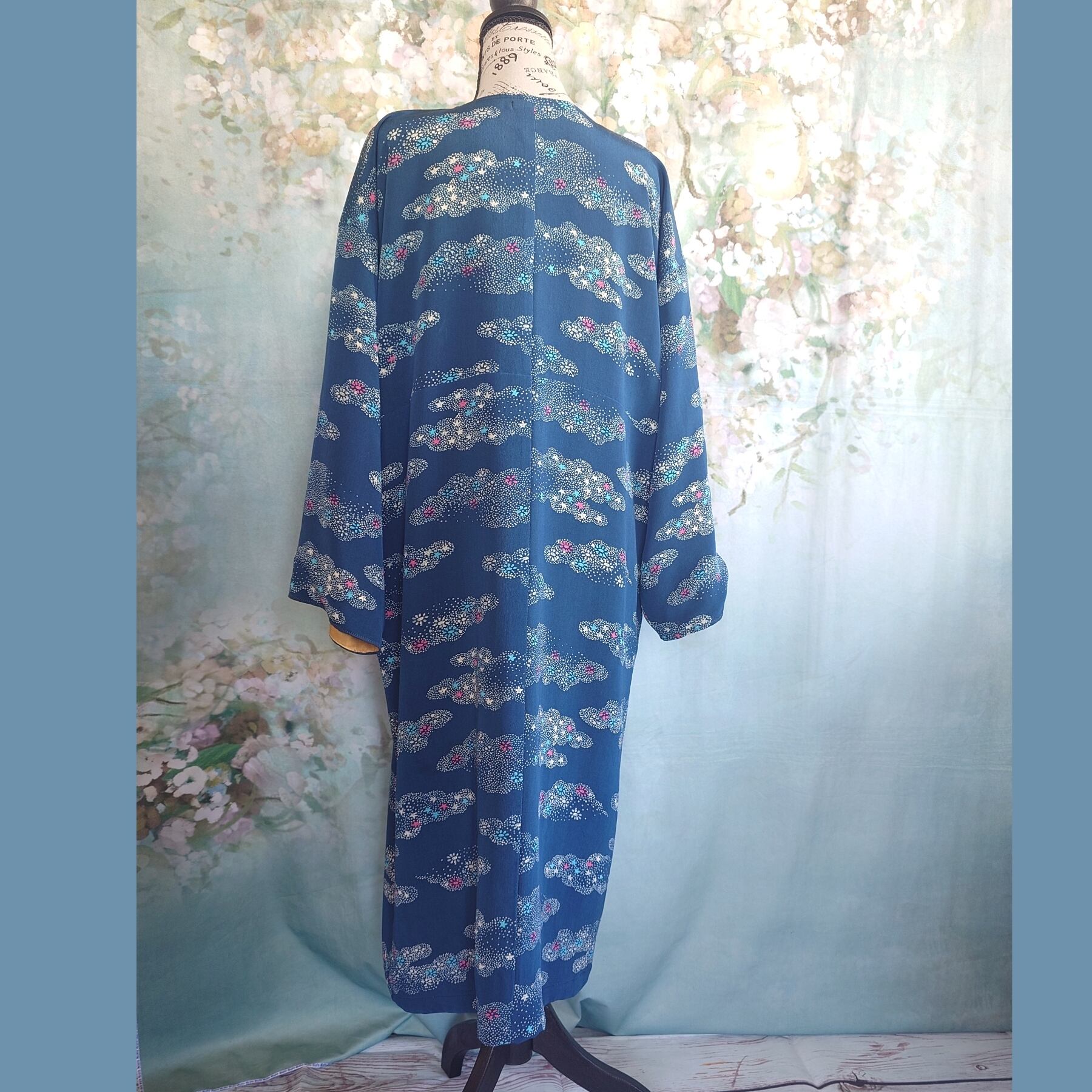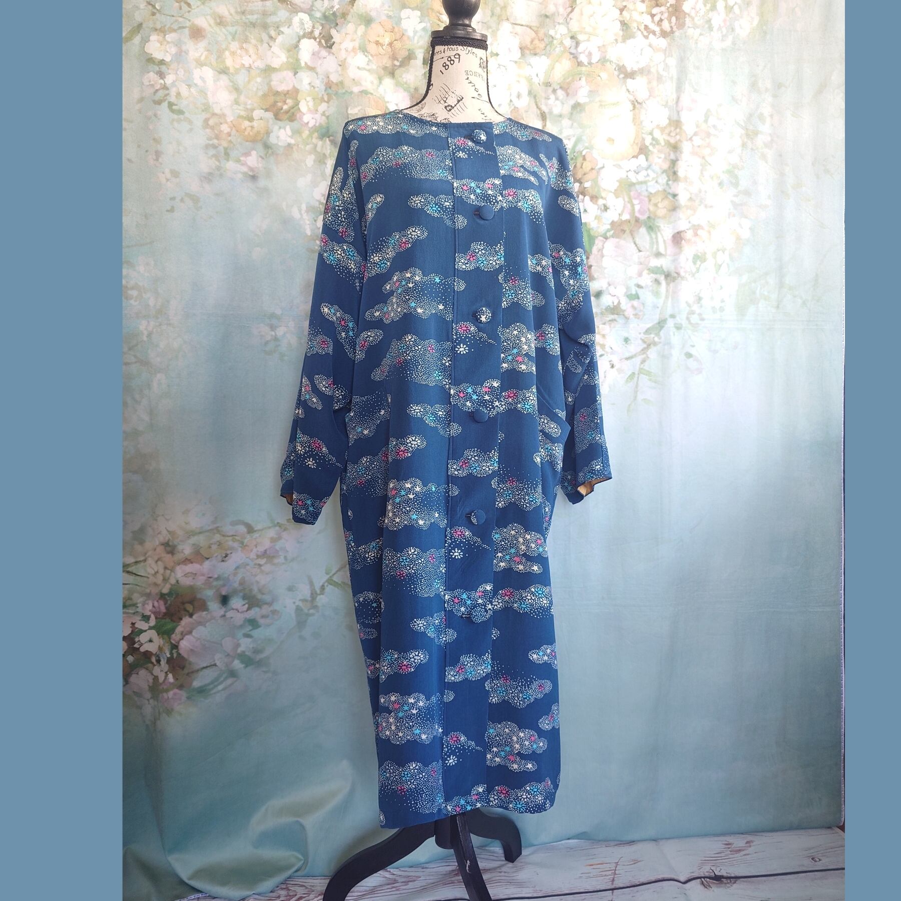 まるで星屑をまとったような、深みのある青の小紋着物が、優雅なロングコートへと生まれ変わりました。