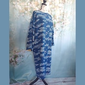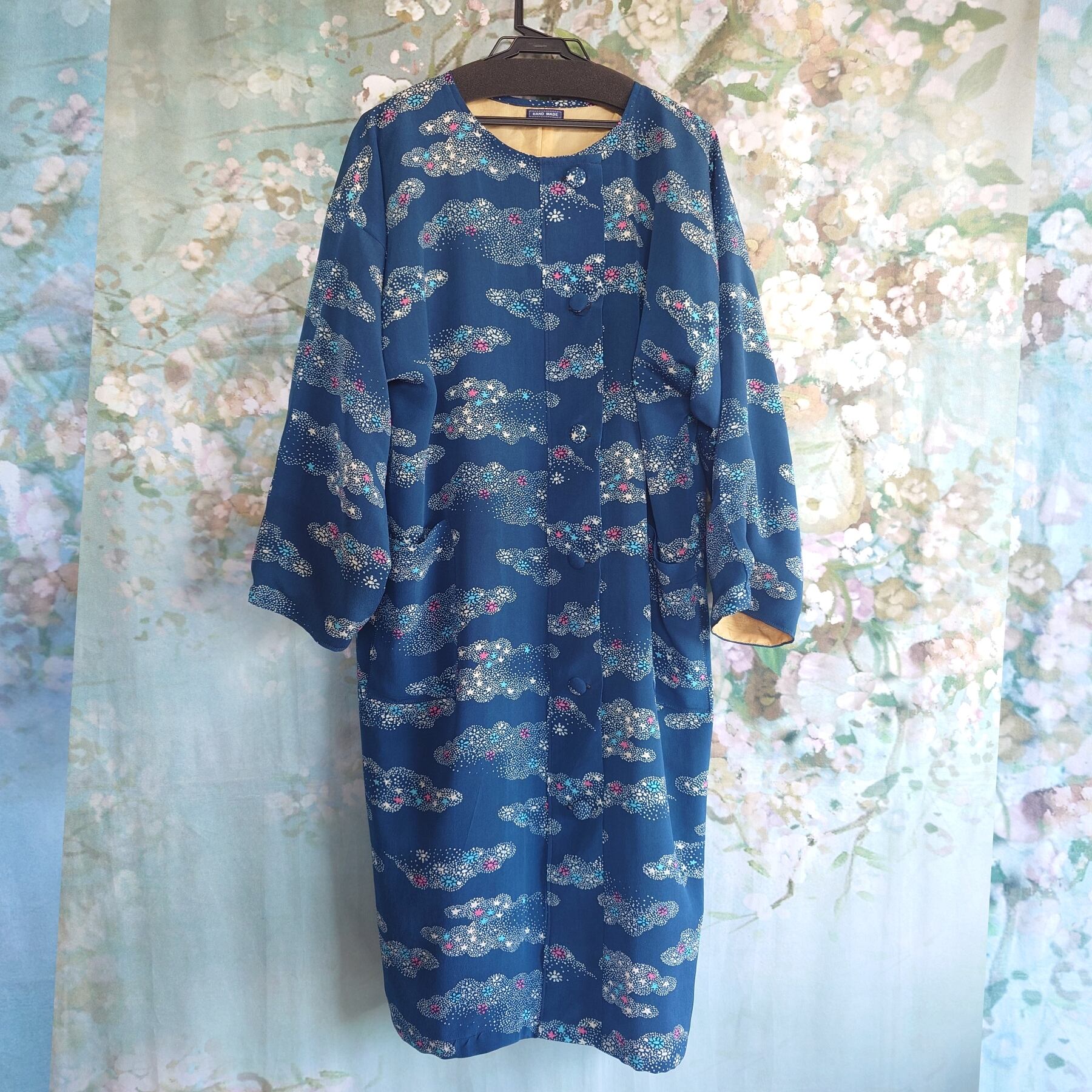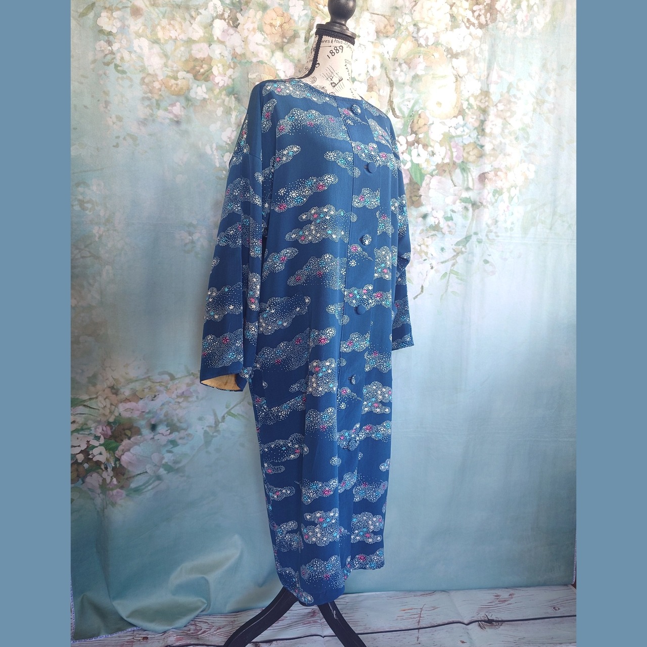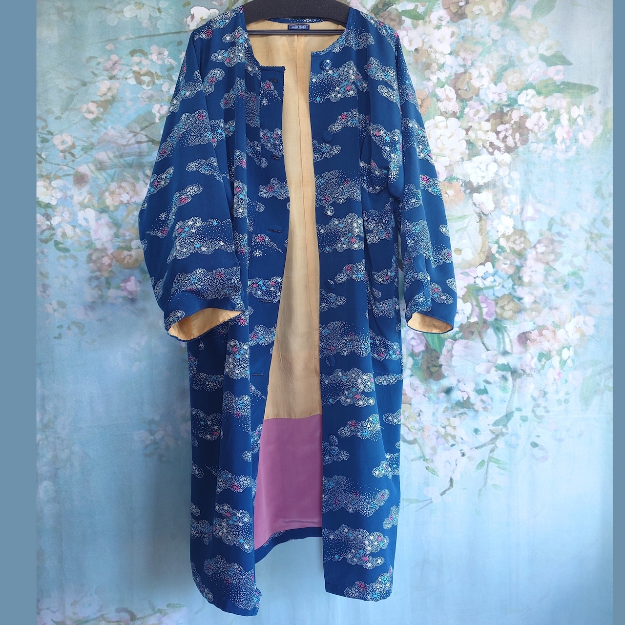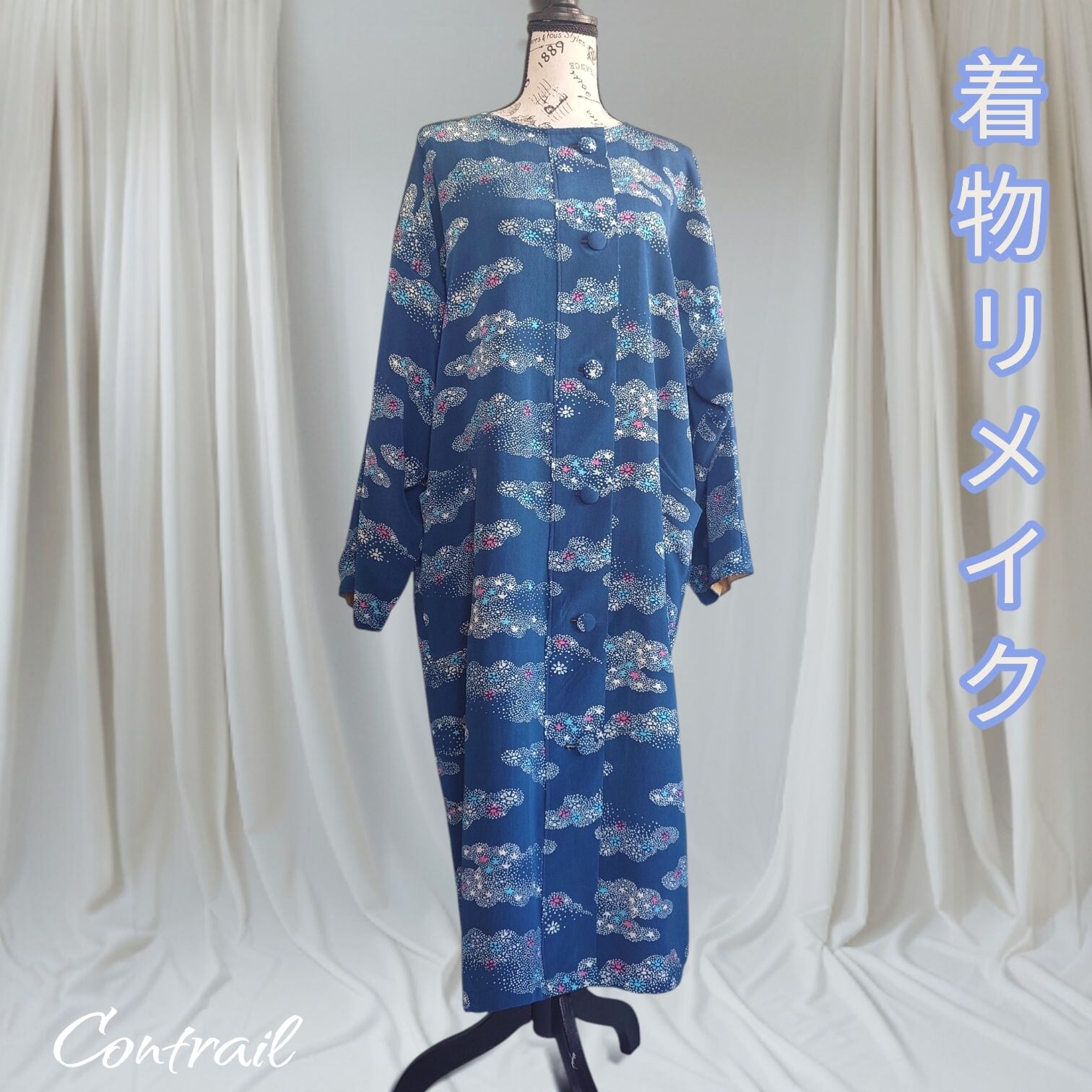 ### 青の小紋から生まれた 着物リメイク 総裏付きロングコート