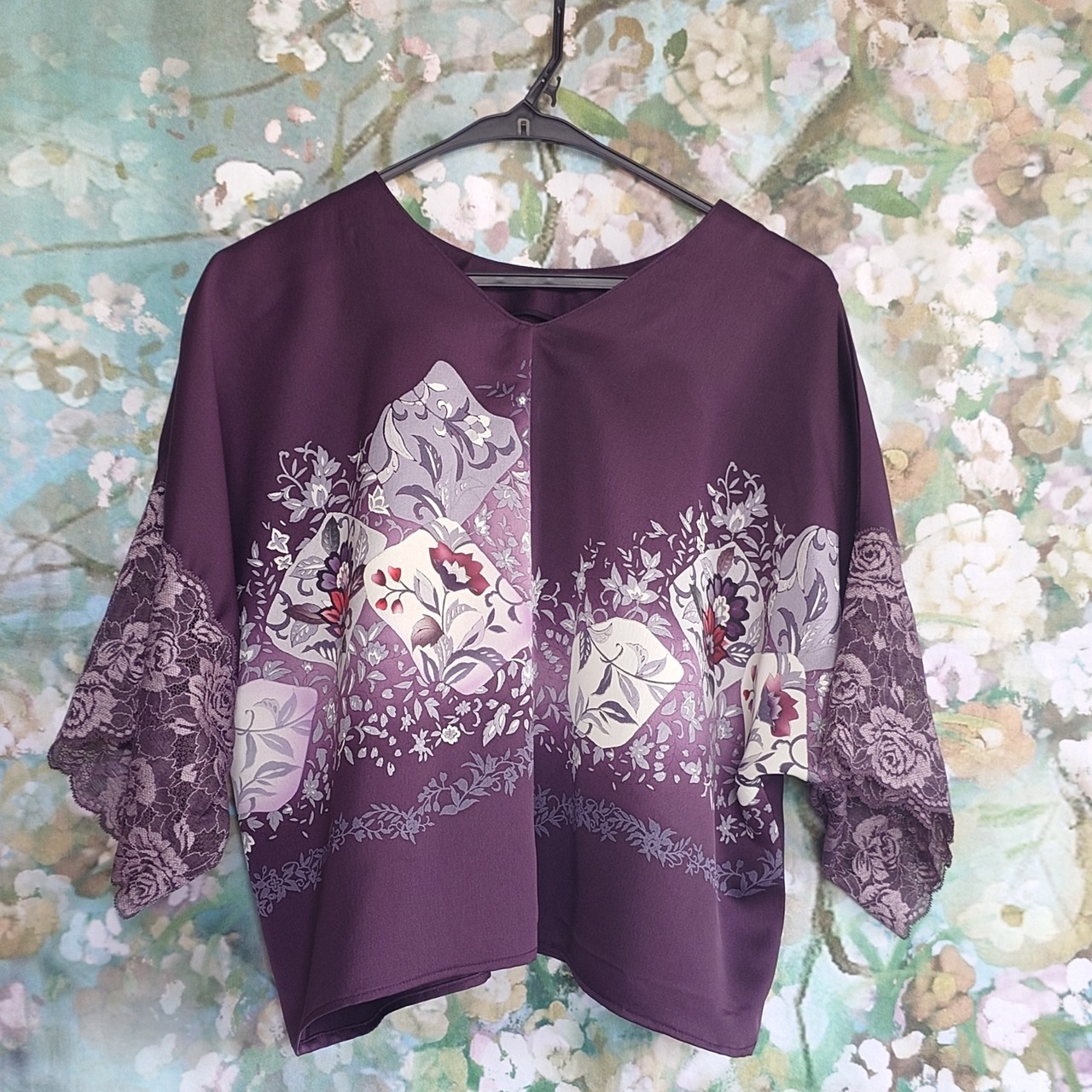 袖口には豪華なレースをあしらい、動くたびに優雅に揺れる袖が女性らしさを際立たせます。ゆったりとしたシルエットは体型を選ばず、着心地も抜群。