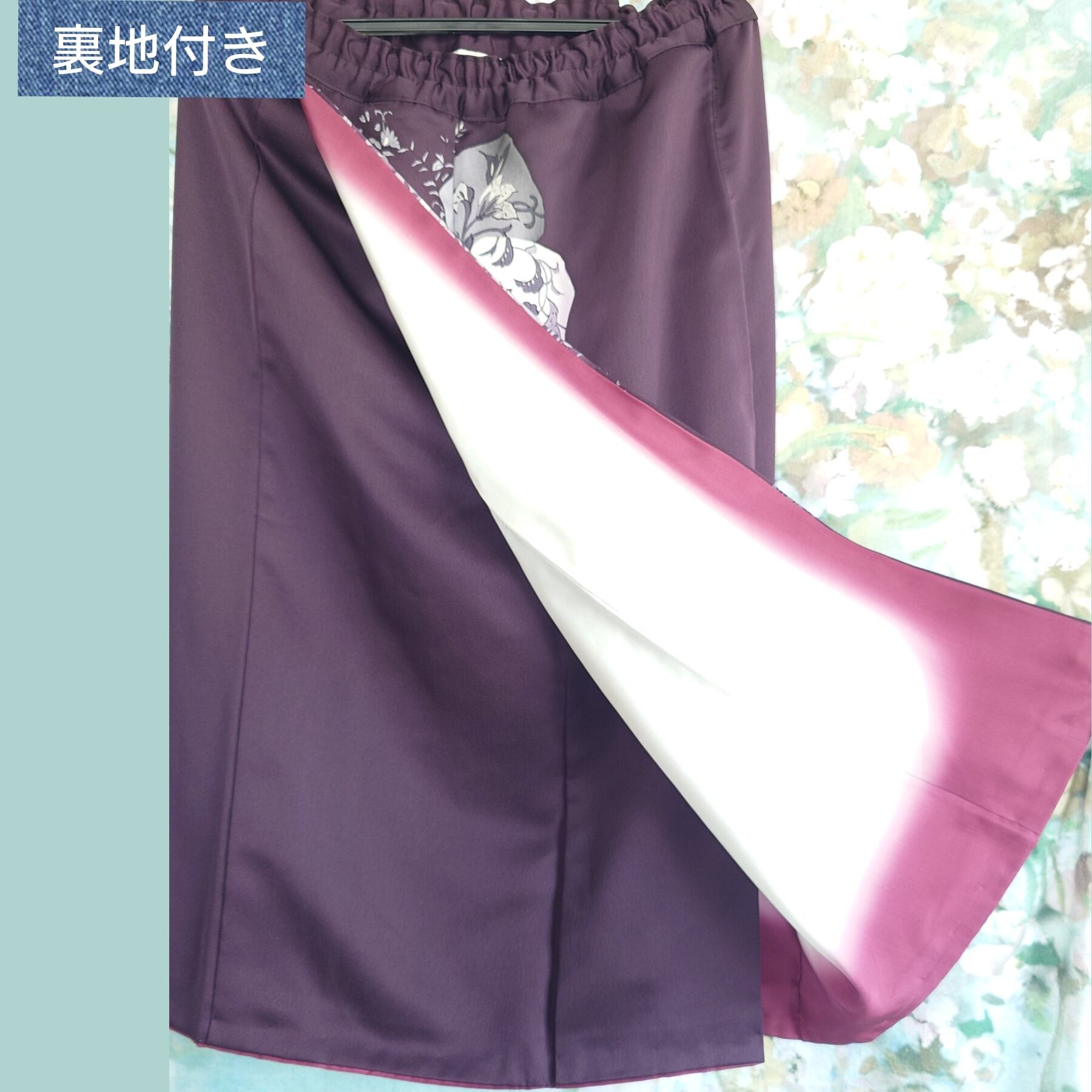 総ゴム仕様でストレスフリー、裾に向かって流れる花柄が縦長効果を発揮し、スタイルを美しく見せてくれます。