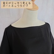 ボートネックでデコルテを美しく見せ、ゆったりとしたワイドスリーブが優雅な動きを添えるデザイン。