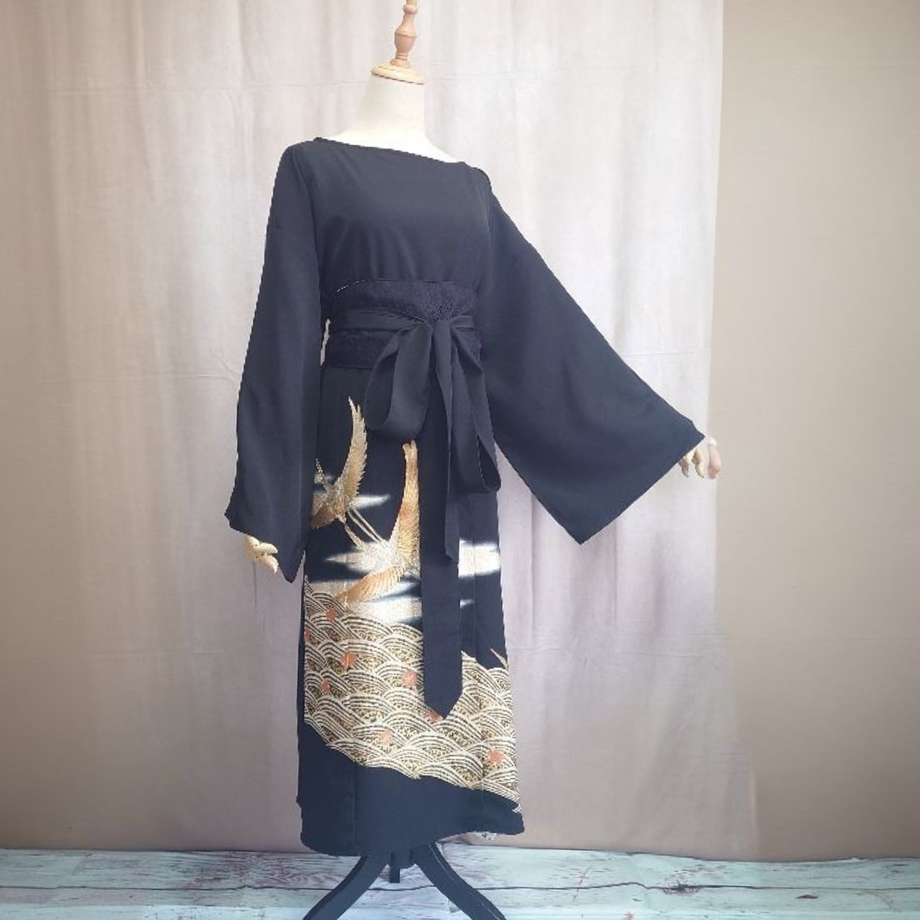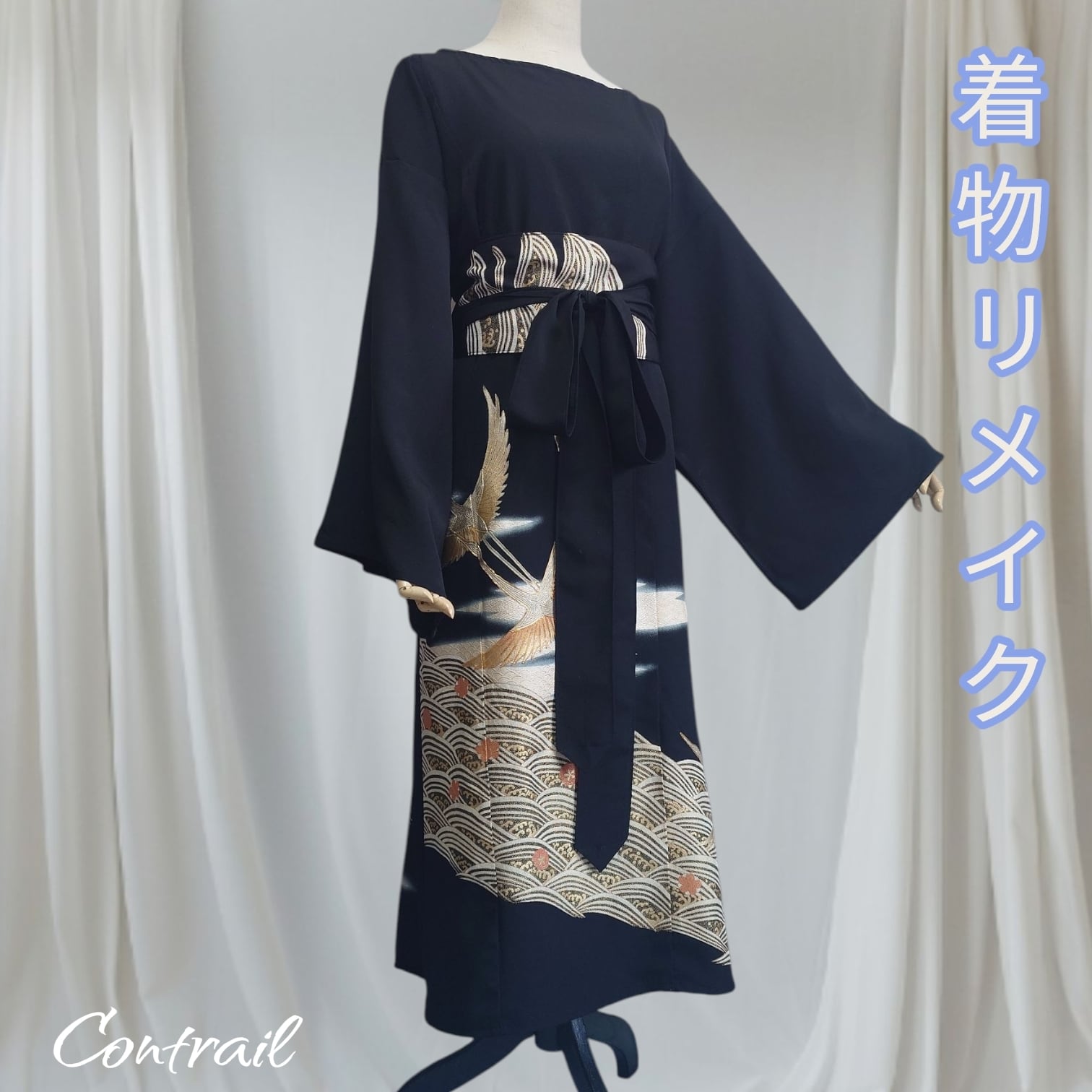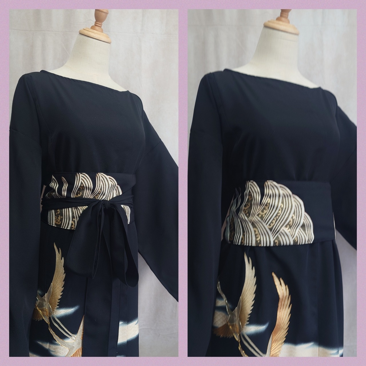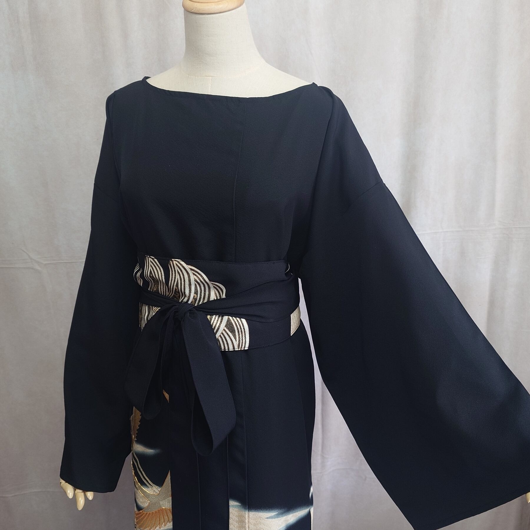 d92 3Lサイズ 着物ワンピース サッシュベルト付き 黒留袖 着物リメイク 着物ドレス マキシ丈ドレス
