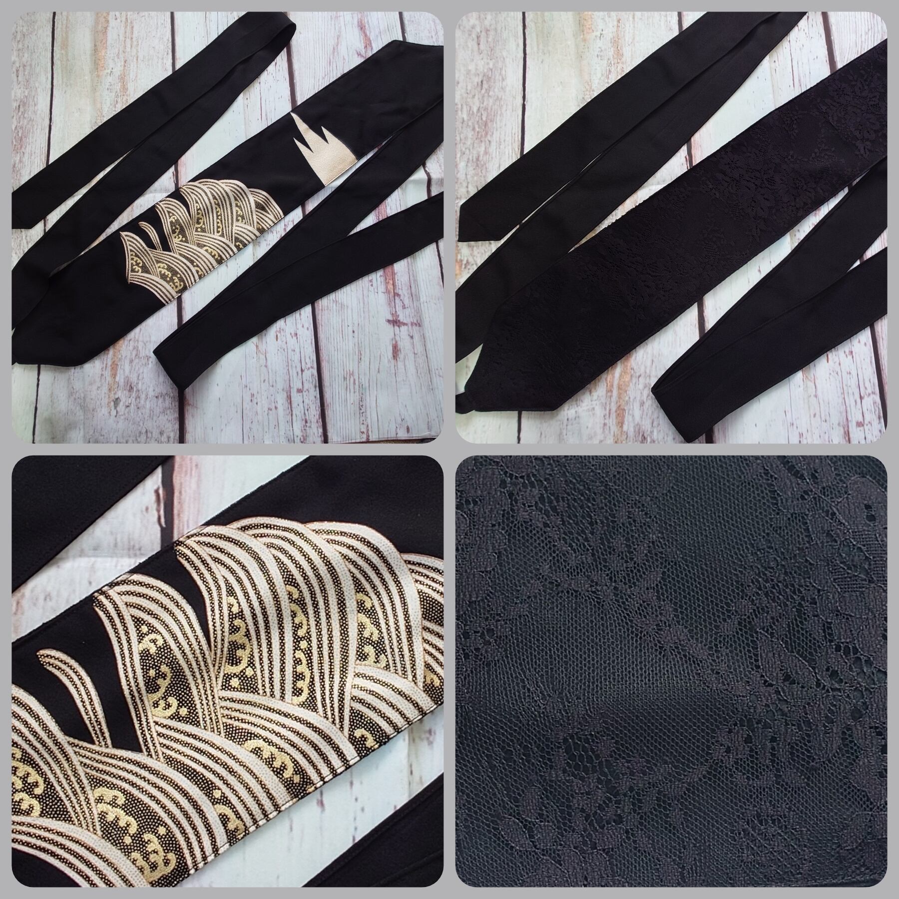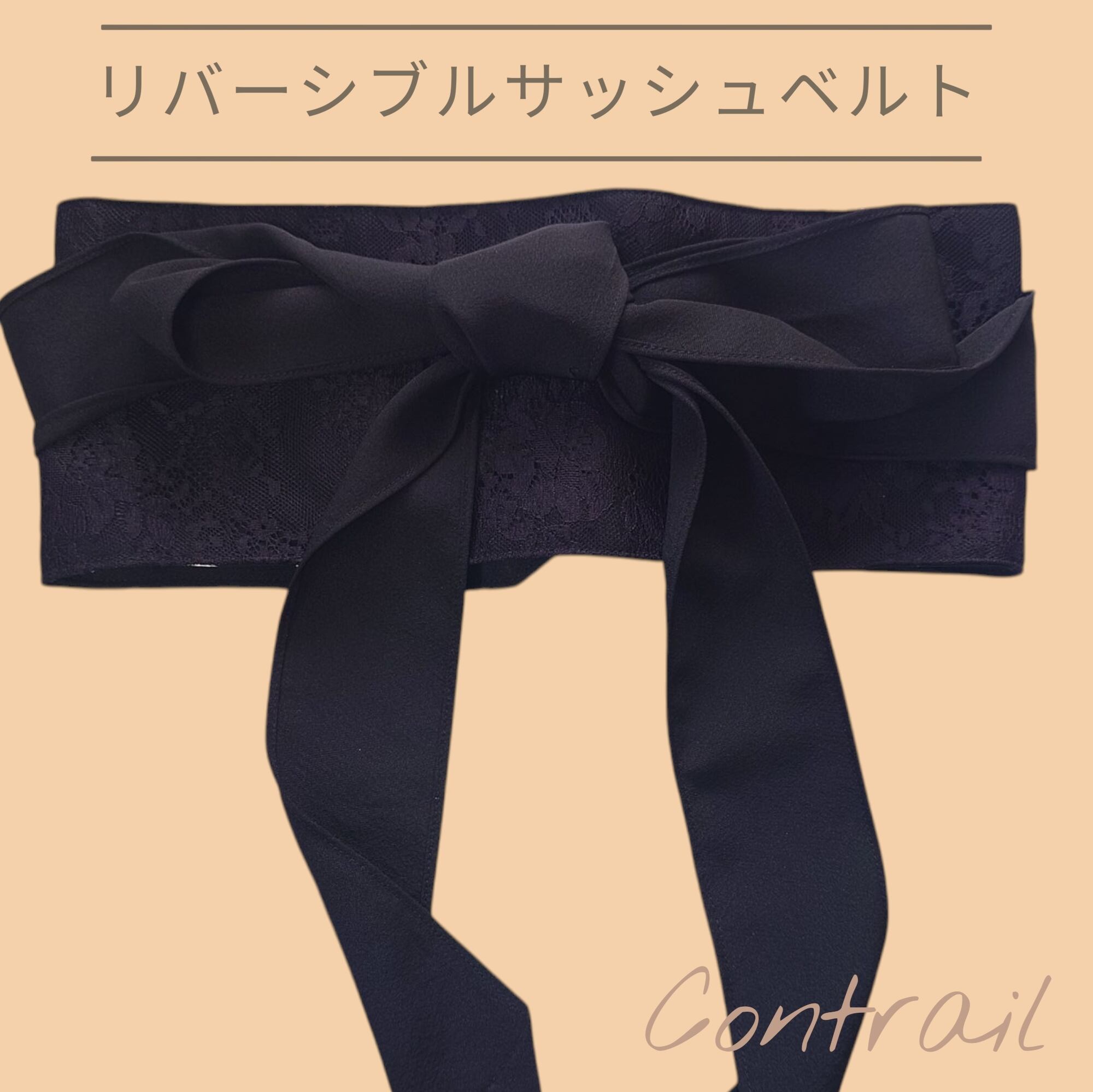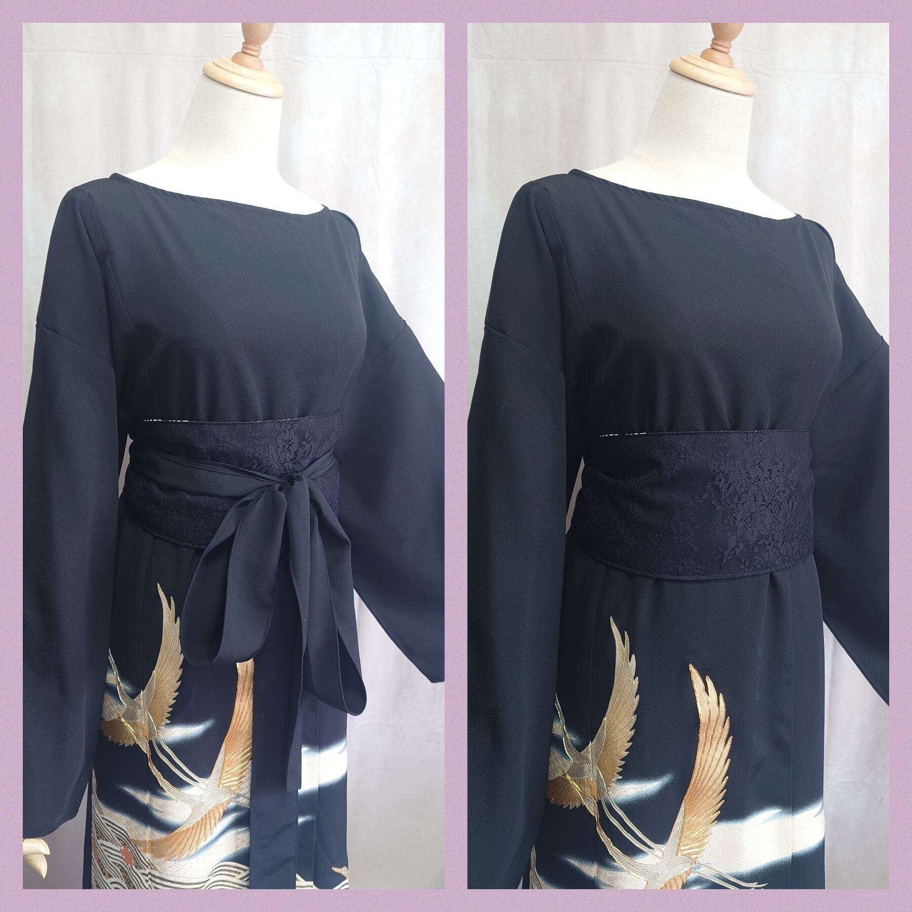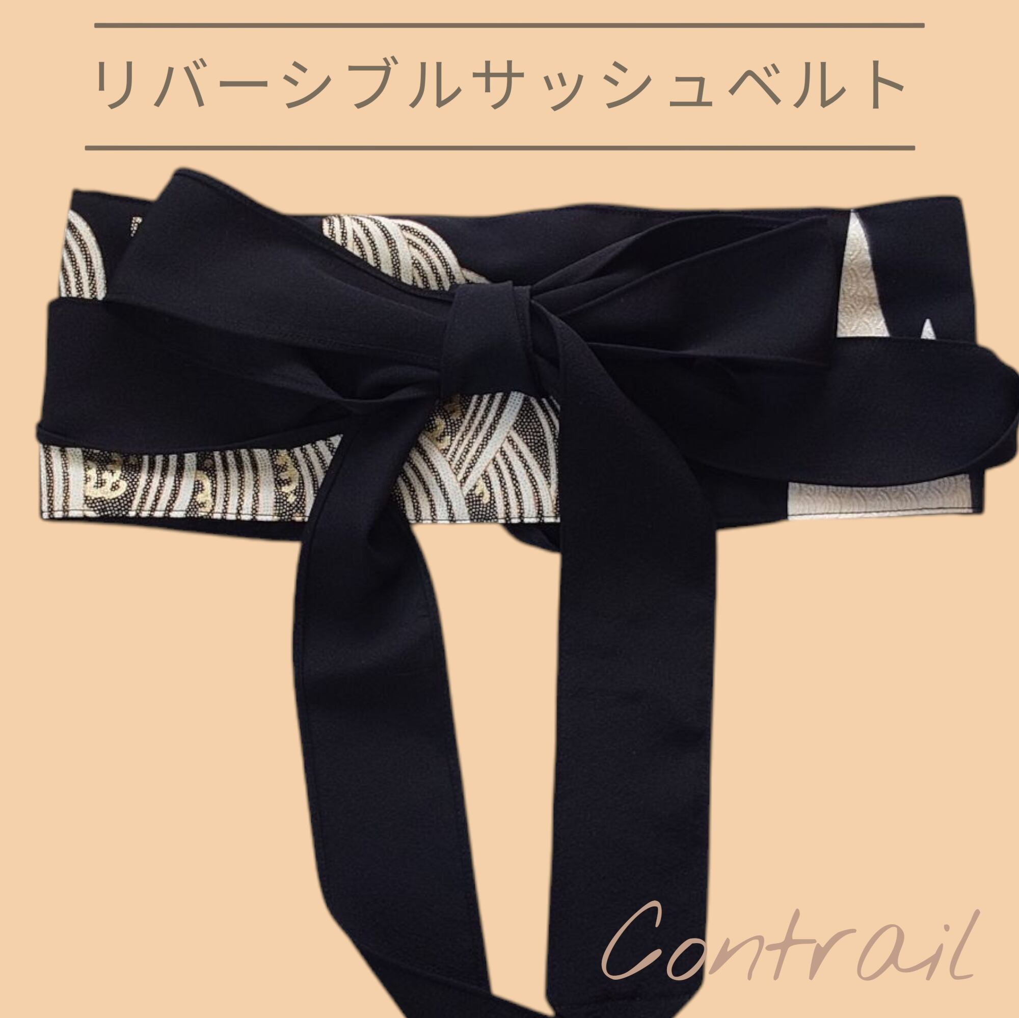 付属のリバーシブルサッシュベルトは、表側に鶴と波濤の柄を効かせ、裏側はシンプルな黒レース。