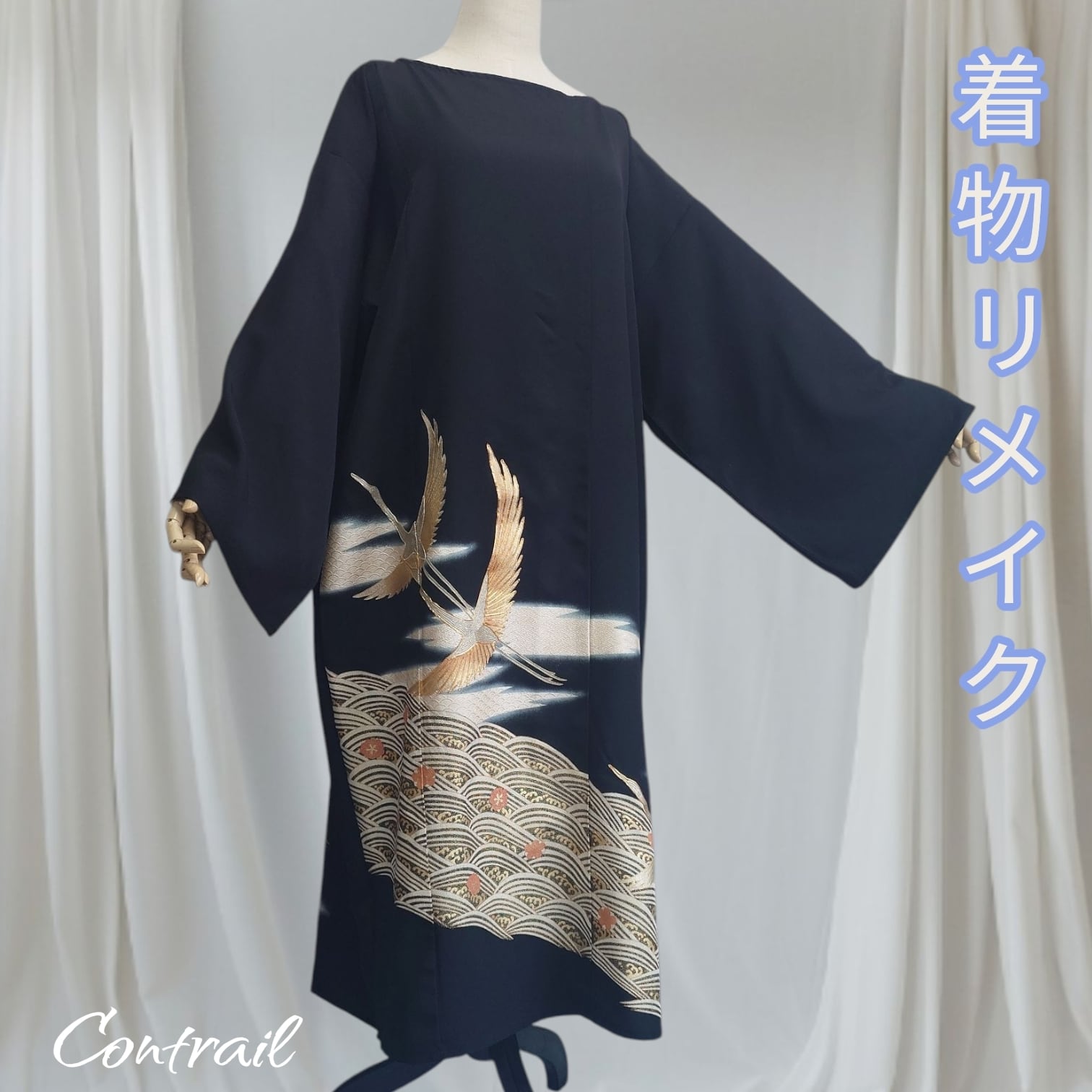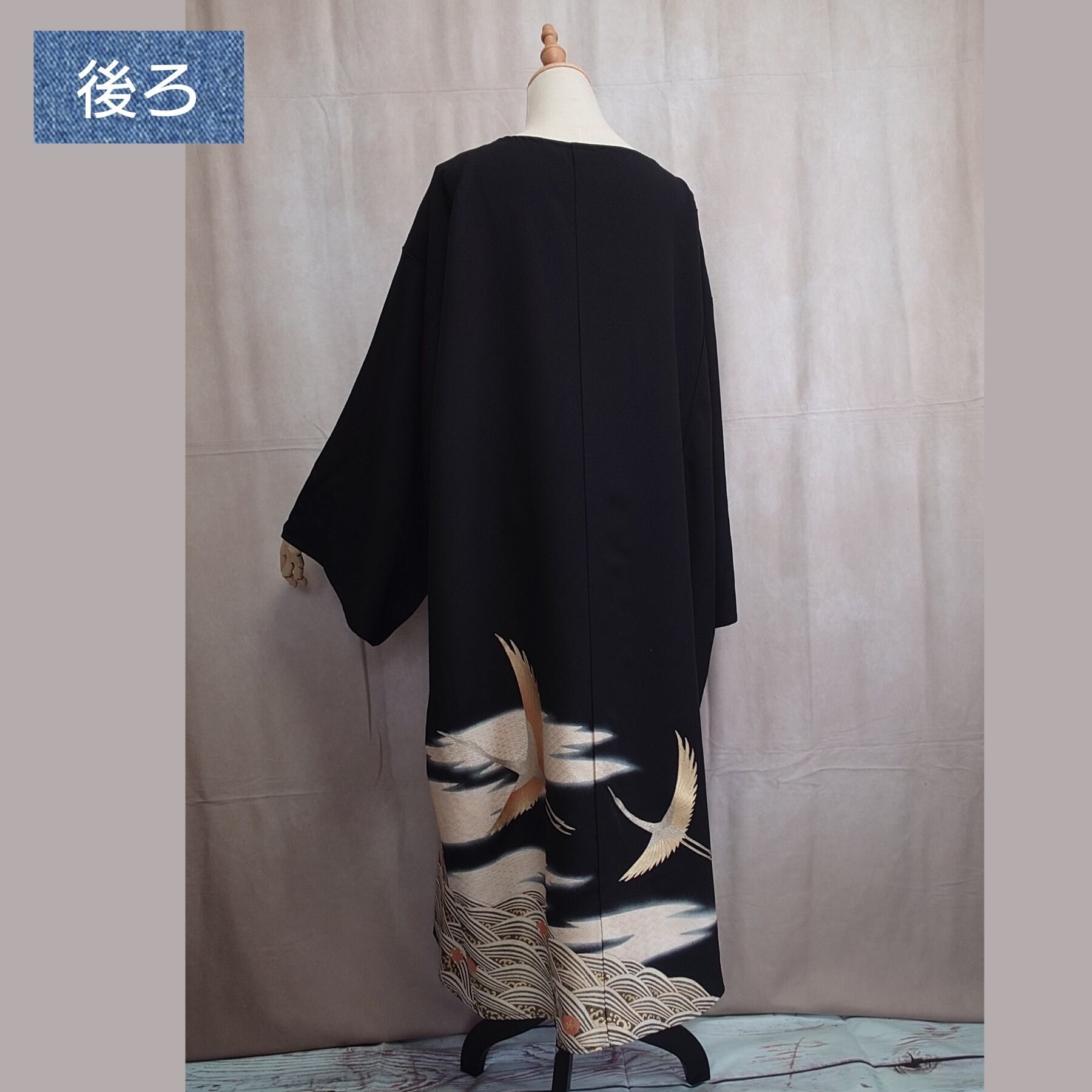 正絹黒留袖を丁寧に解き、2羽の鶴が空に向かって力強く羽ばたく豪華な金駱駝・刺繍の柄を最大限に活かして仕立てたロングドレスです。