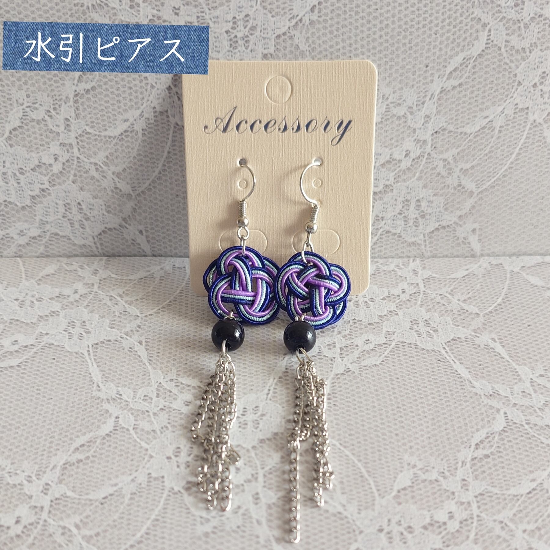 特徴:濃紫の美しい色合いが魅力の水引ピアスです。和装にぴったりのアイテムで、特別な日や普段のおしゃれにも華やかさを添えてくれます。