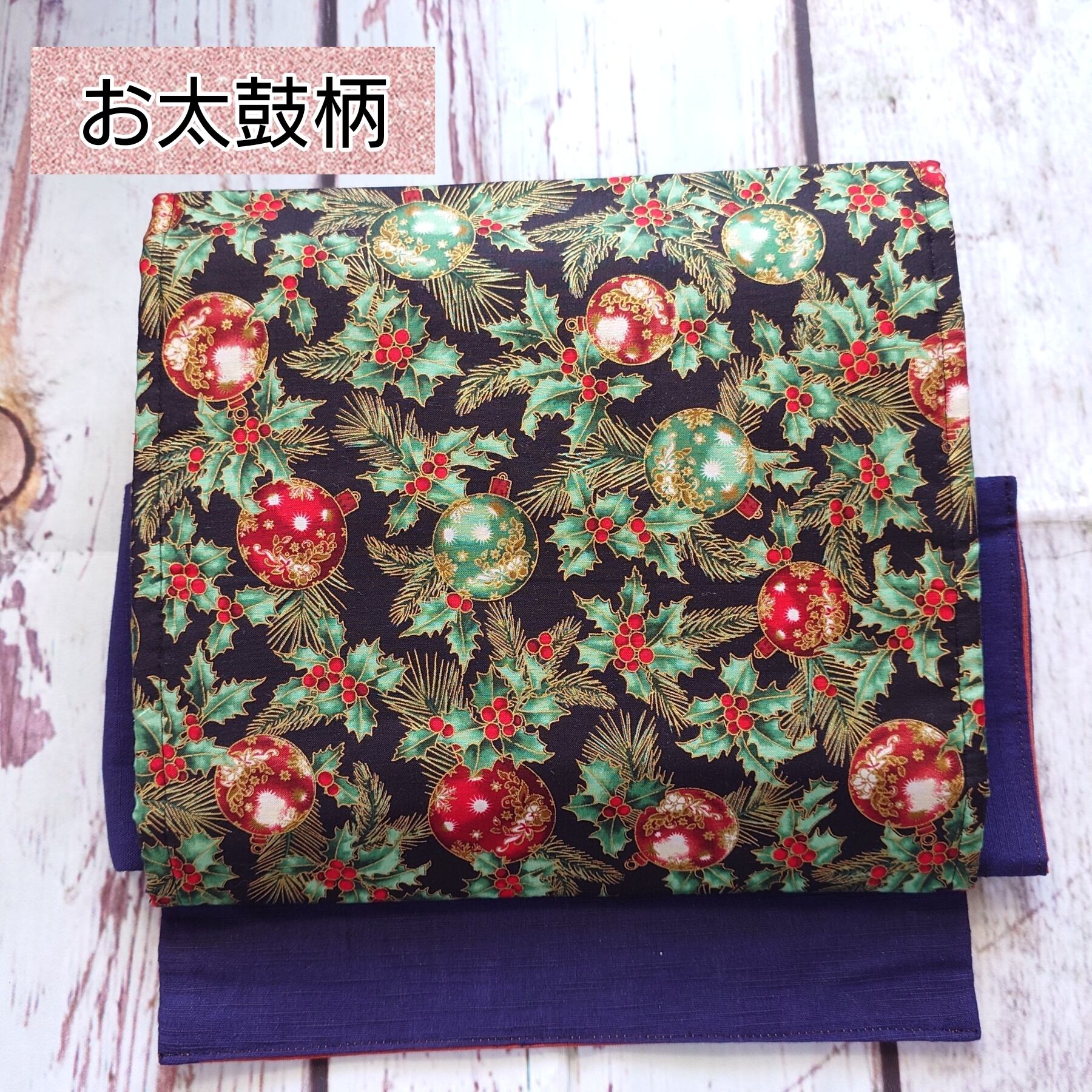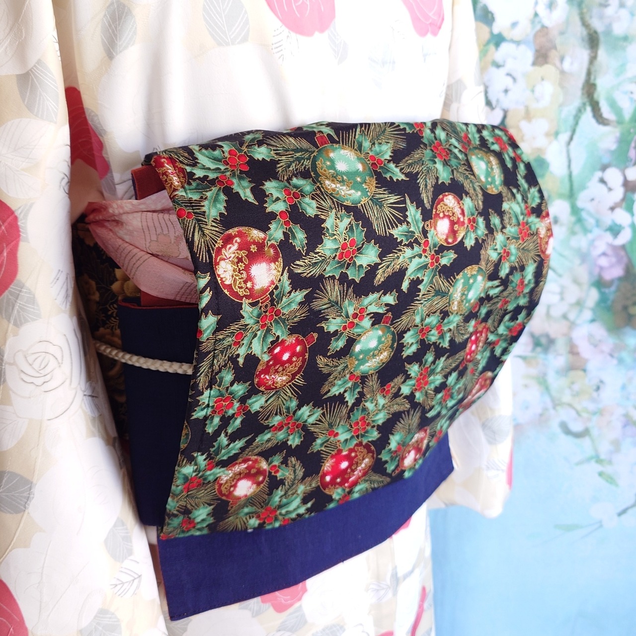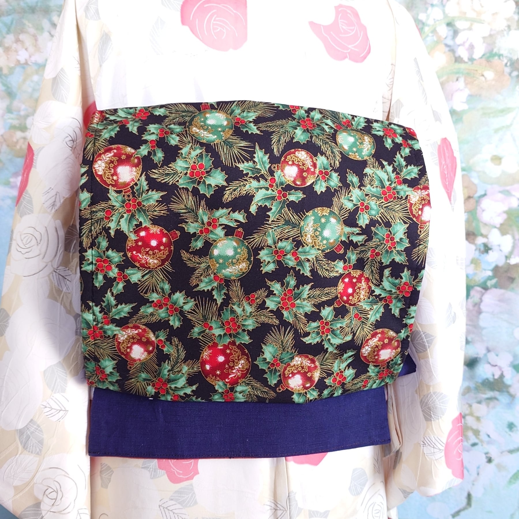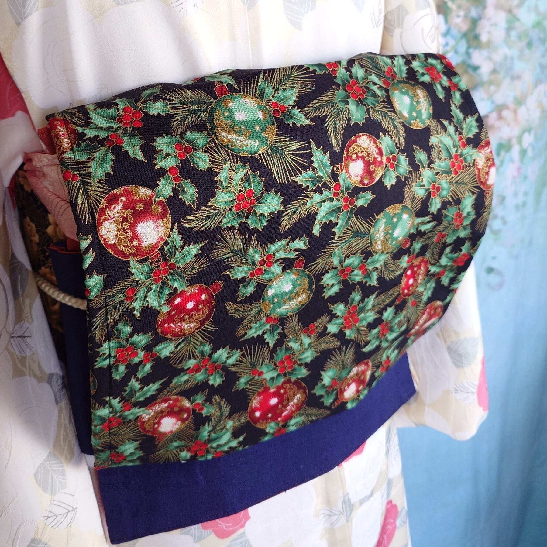 薄い帯の上に可愛らしい綿のクリスマス柄布を縫い、リメイクした簡単装着の