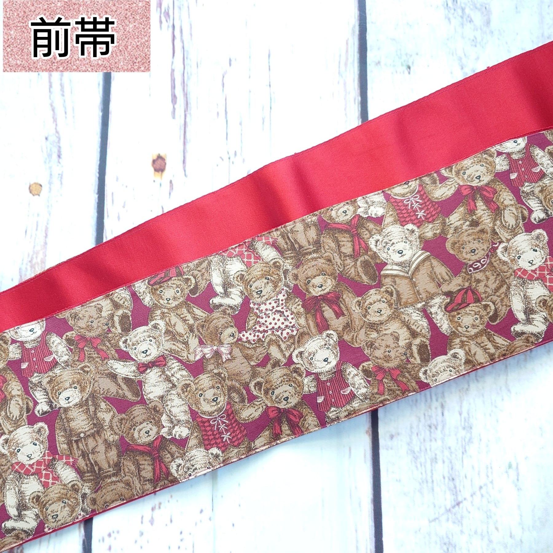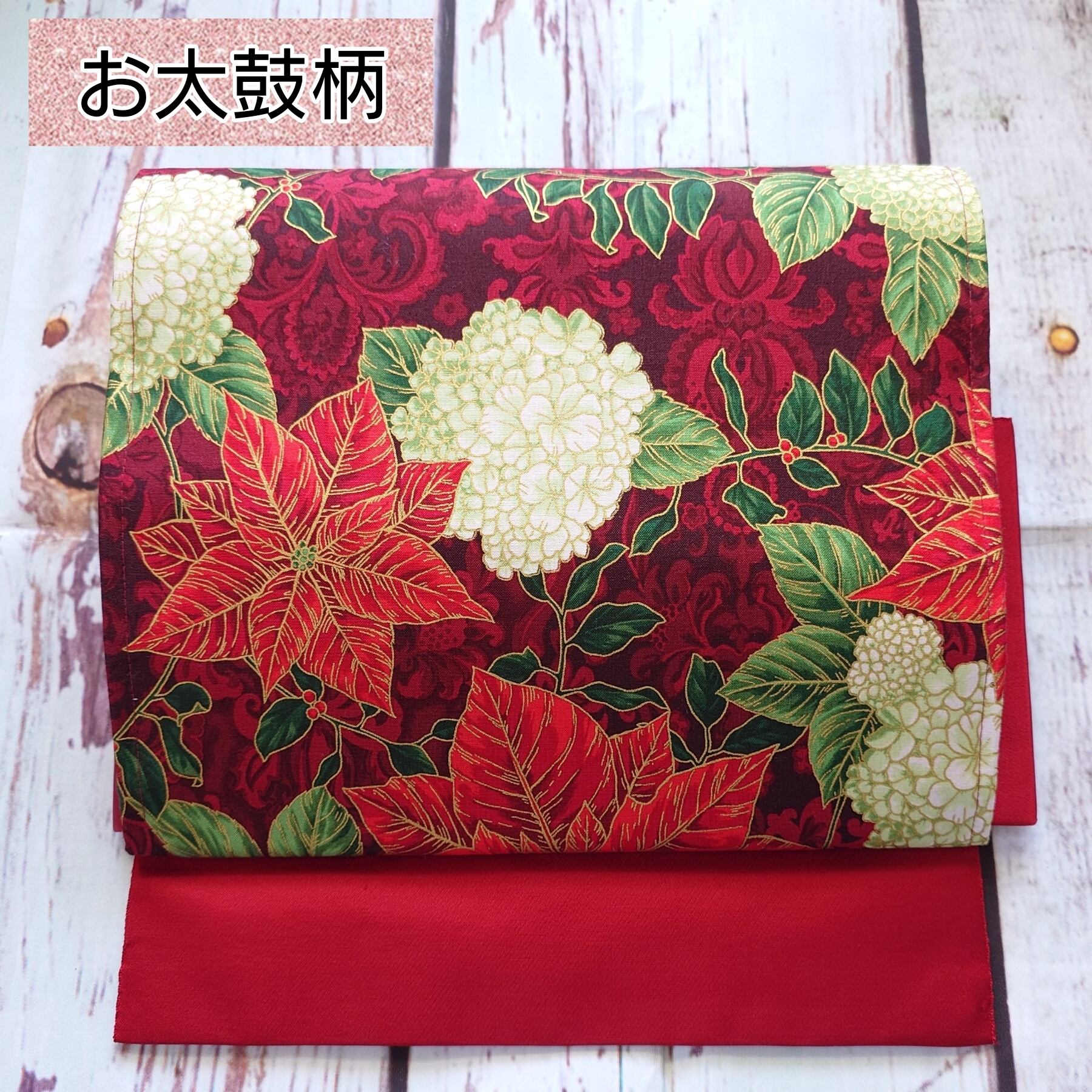 固めの帯の上に可愛らしい綿のクリスマス柄布を縫い、リメイクした簡単装着の