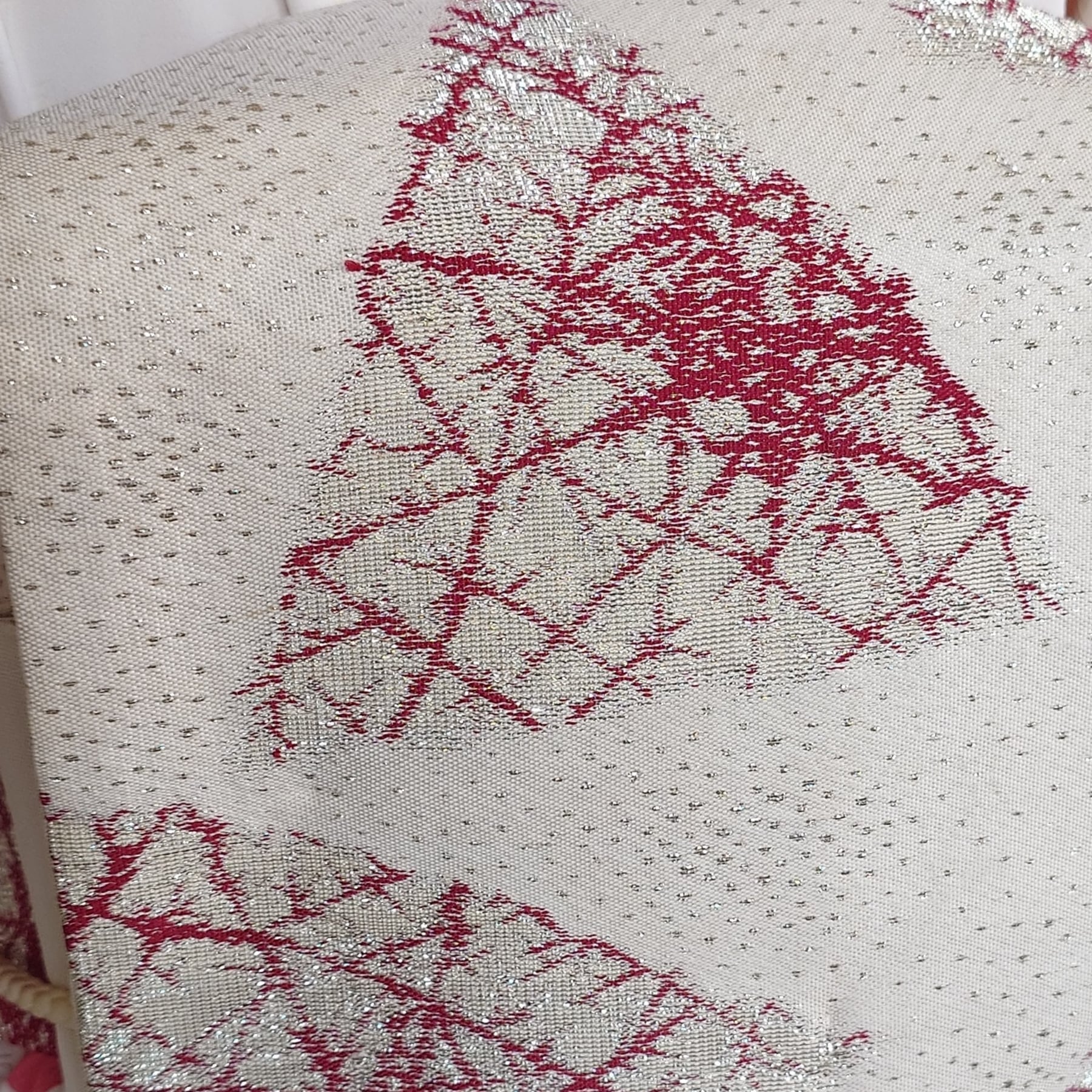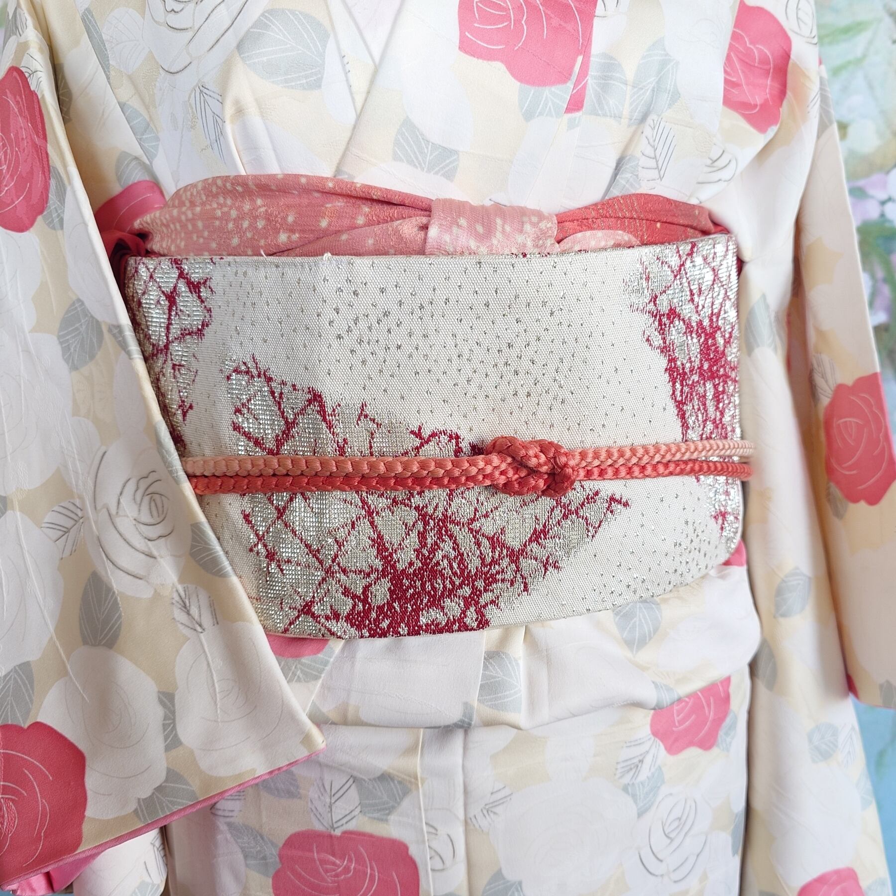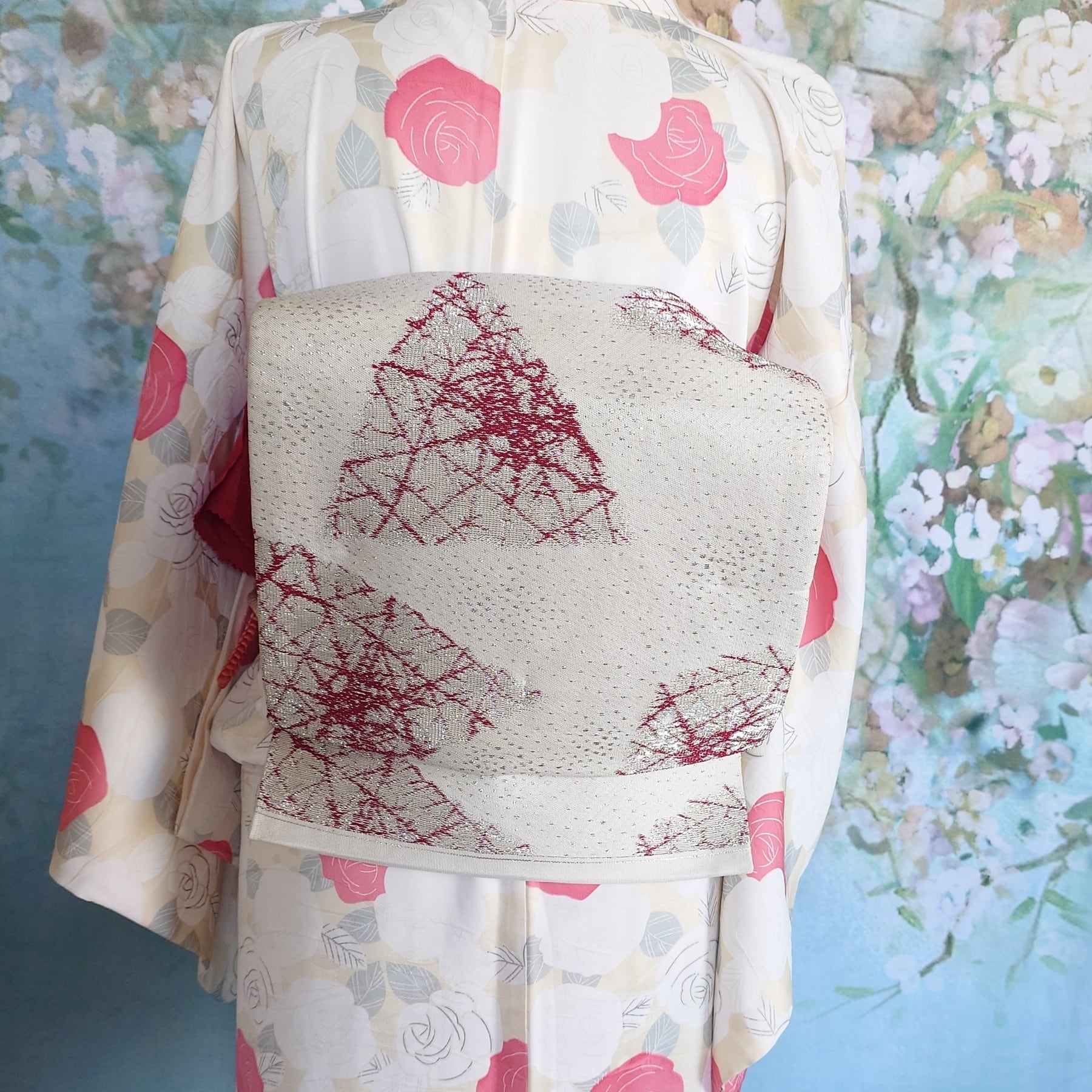 艶やかな白帯にクリスマスみたいな刺繍が素敵な柄です。
