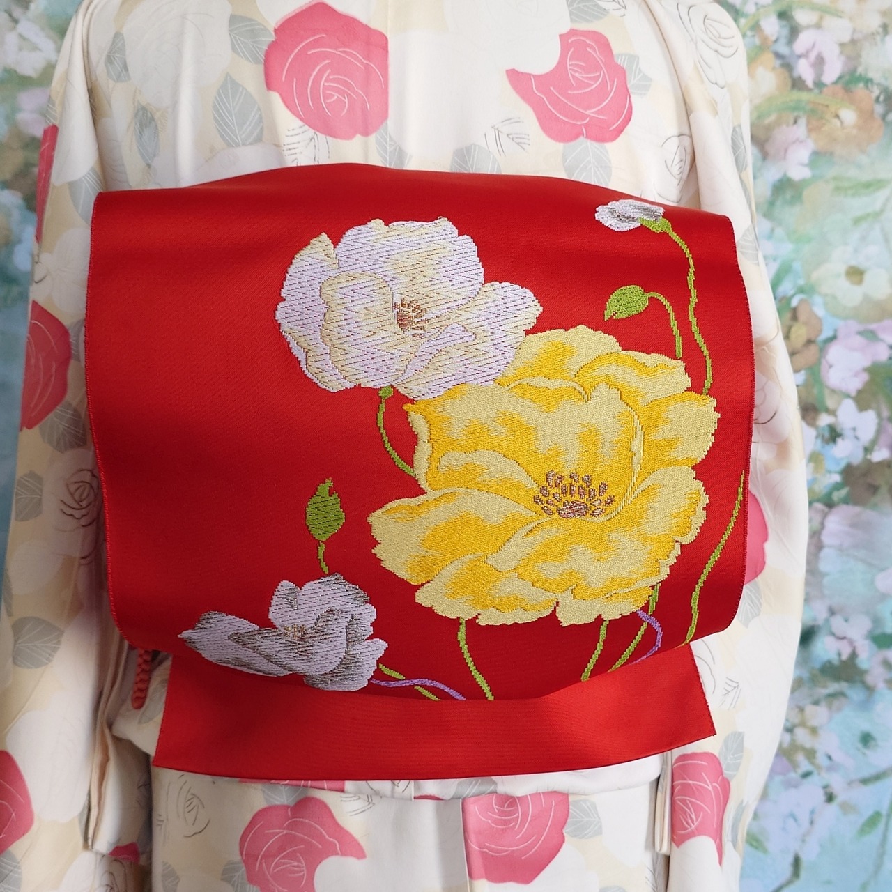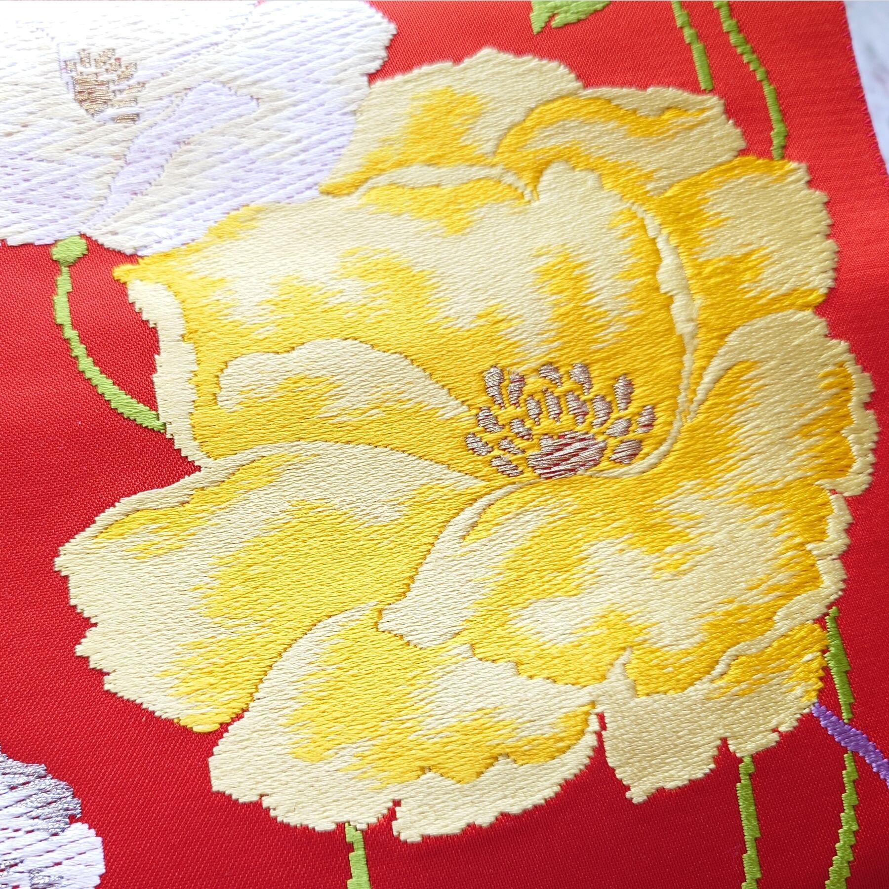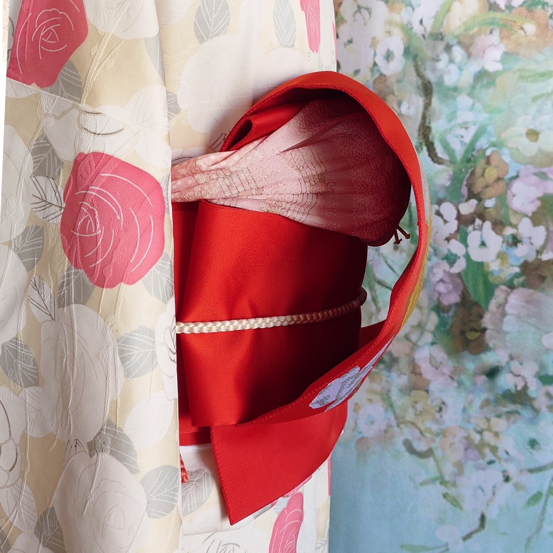 艶やかな朱色の帯に刺繍が素敵な柄です。