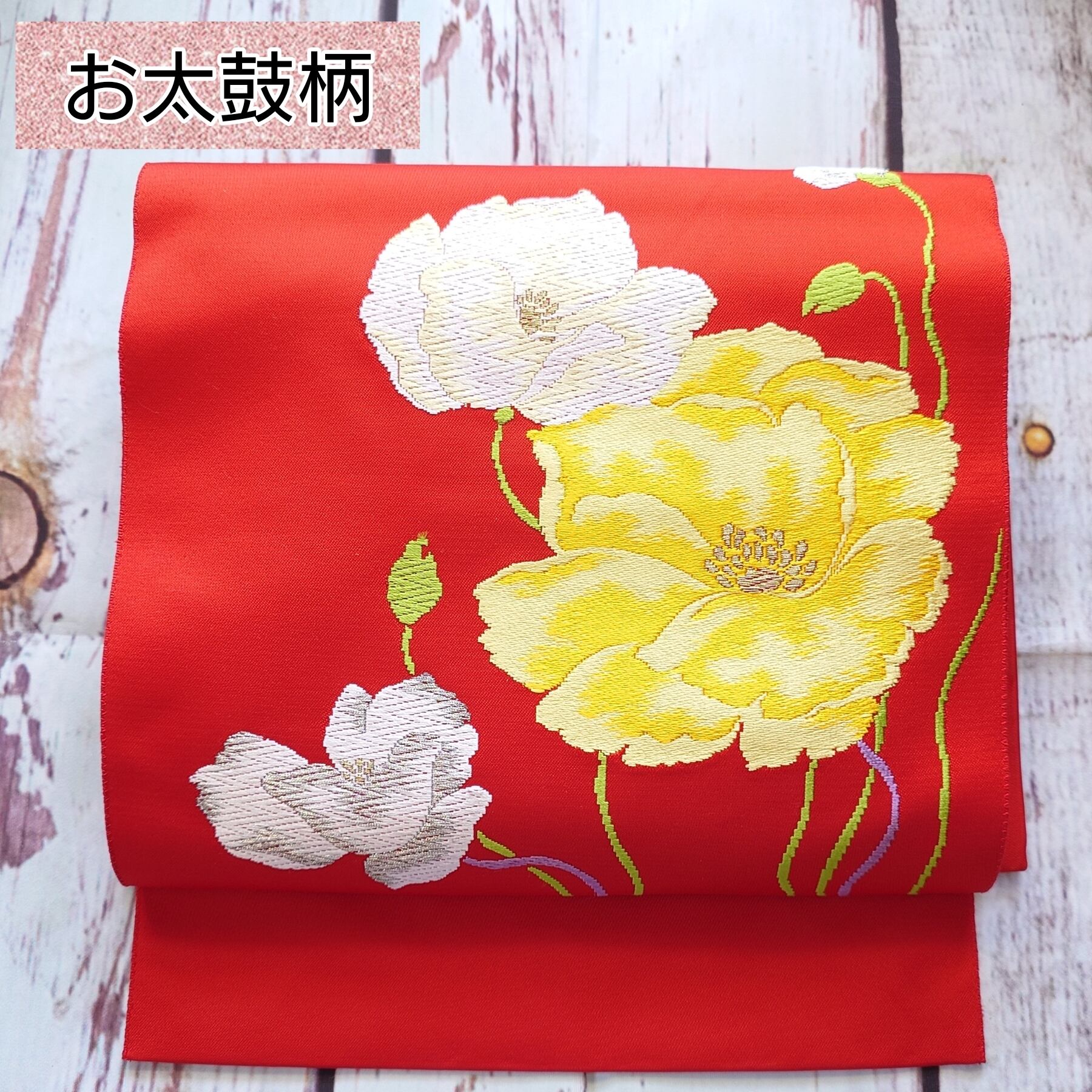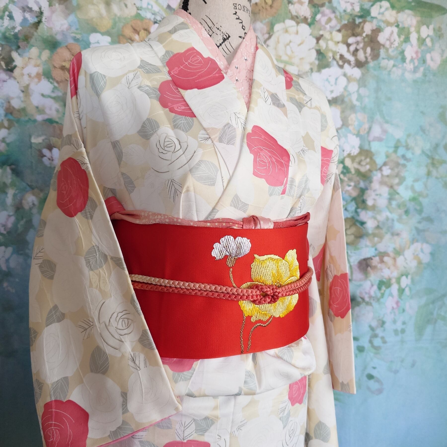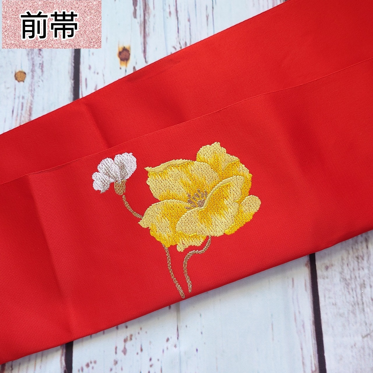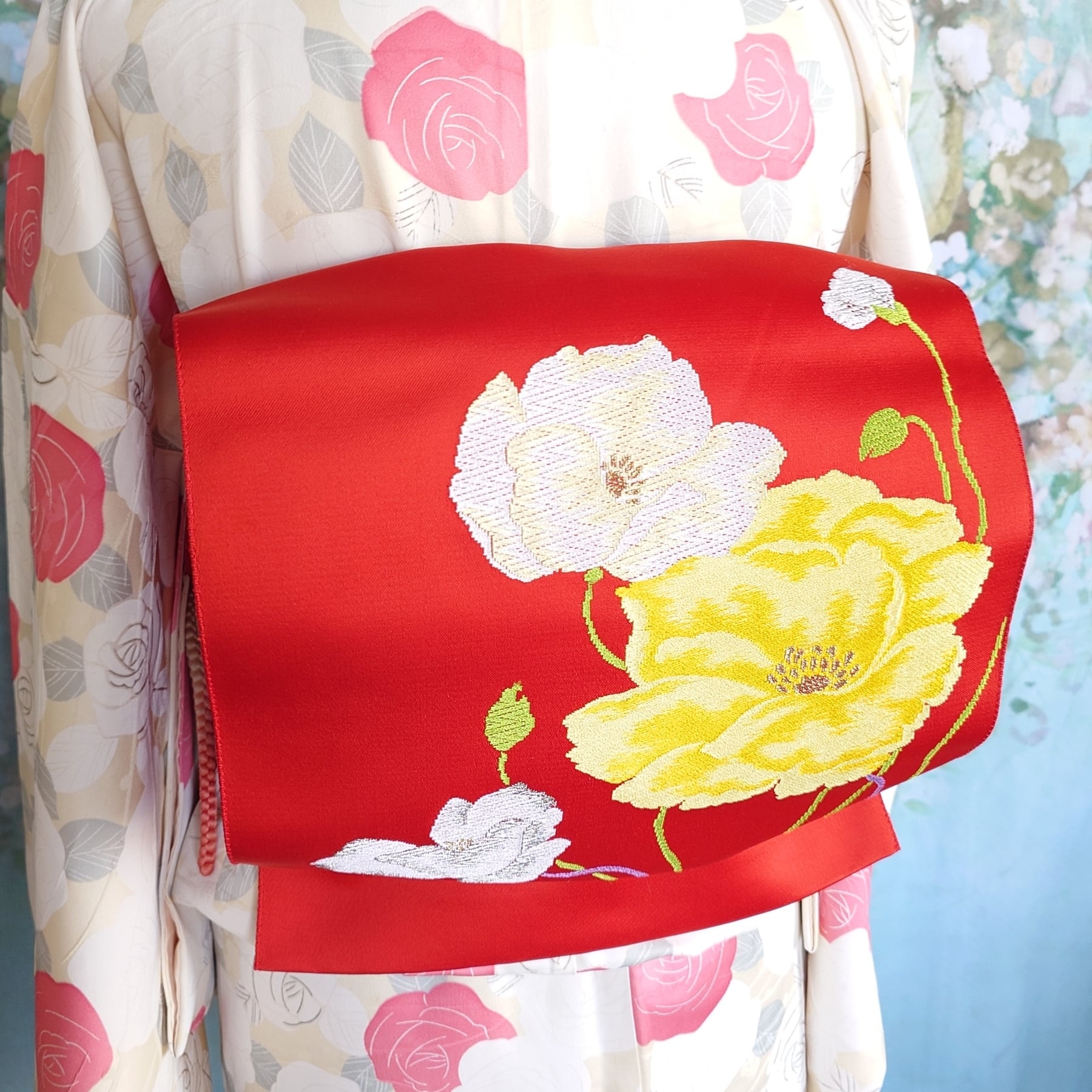 艶やかな朱色の帯に刺繍が素敵な柄です。