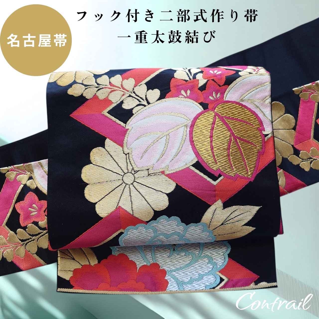 ob195 フック付 ワンタッチ二部式作り帯 一重太鼓結び 名古屋帯 刺繍