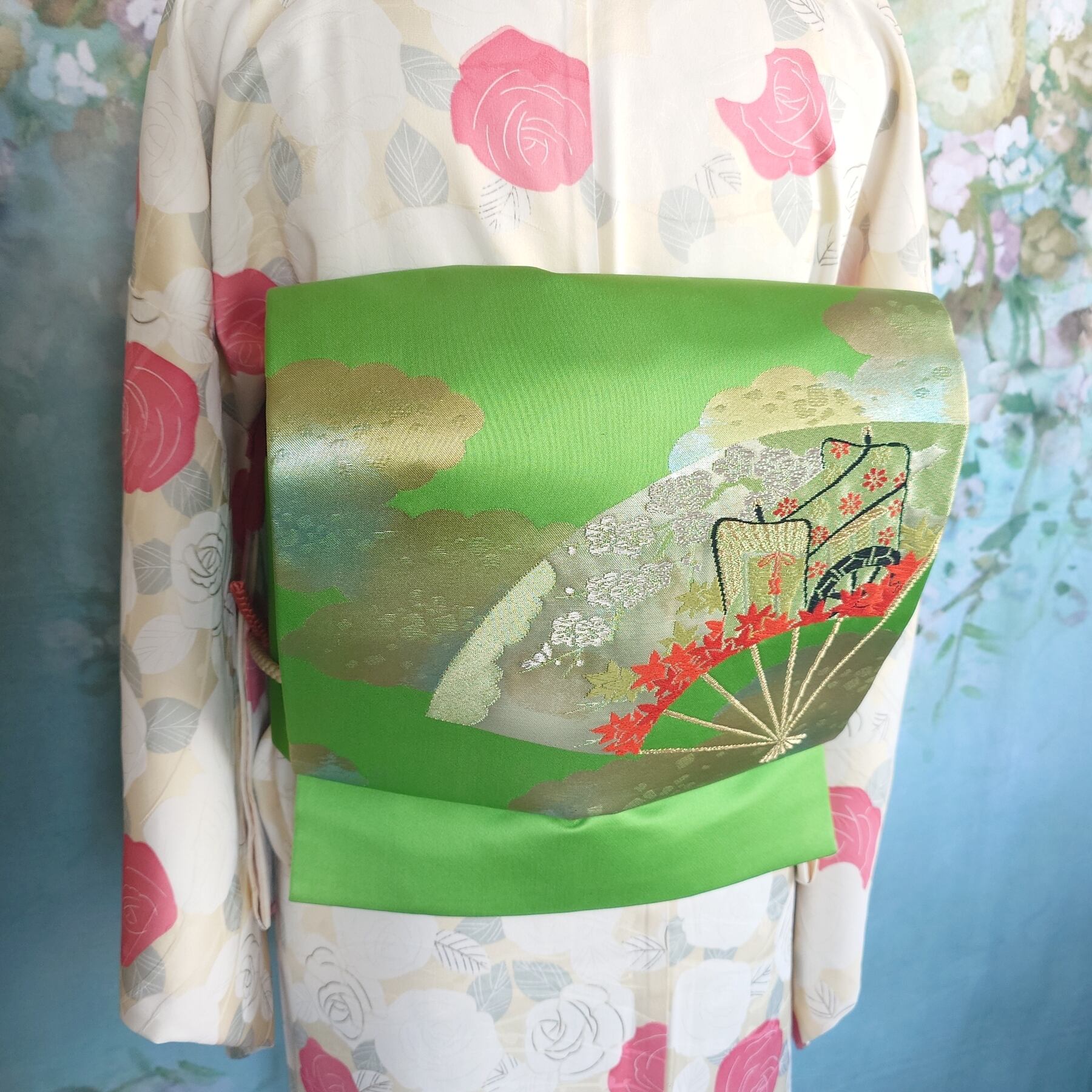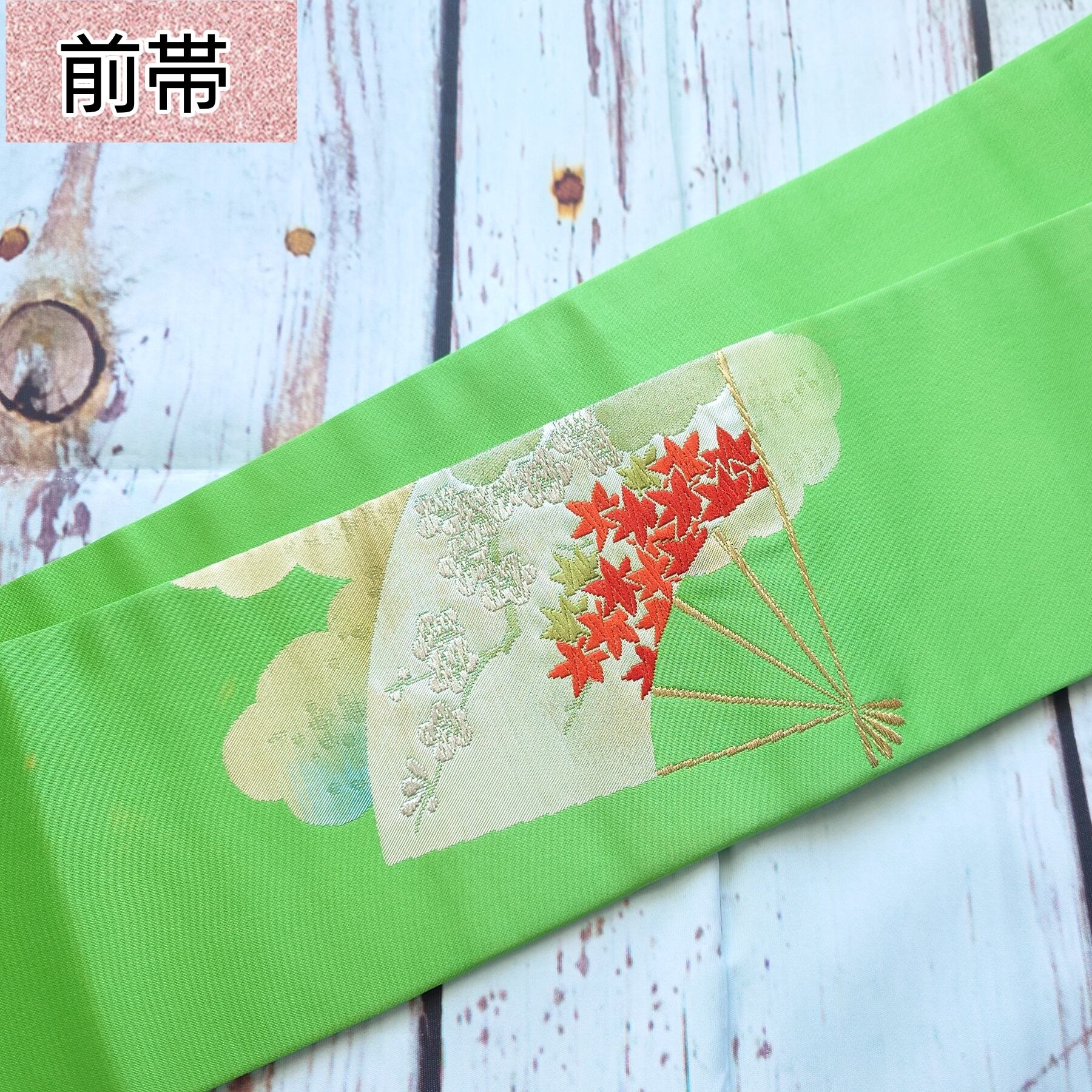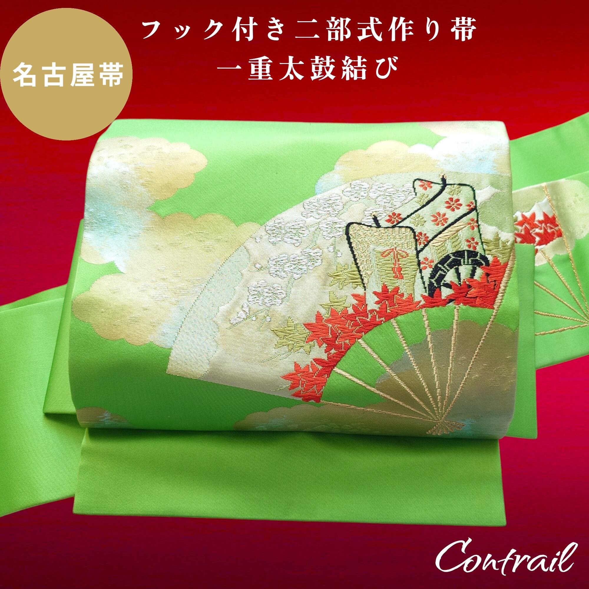 ob197 フック付 ワンタッチ二部式作り帯 一重太鼓結び 名古屋帯 萌黄色