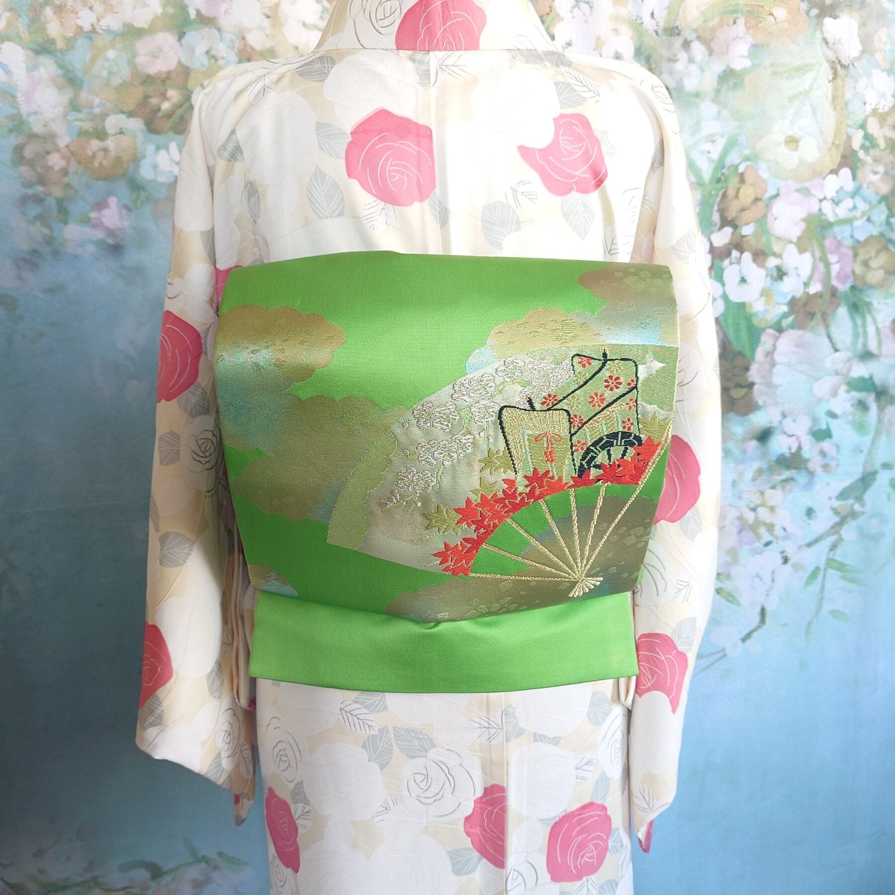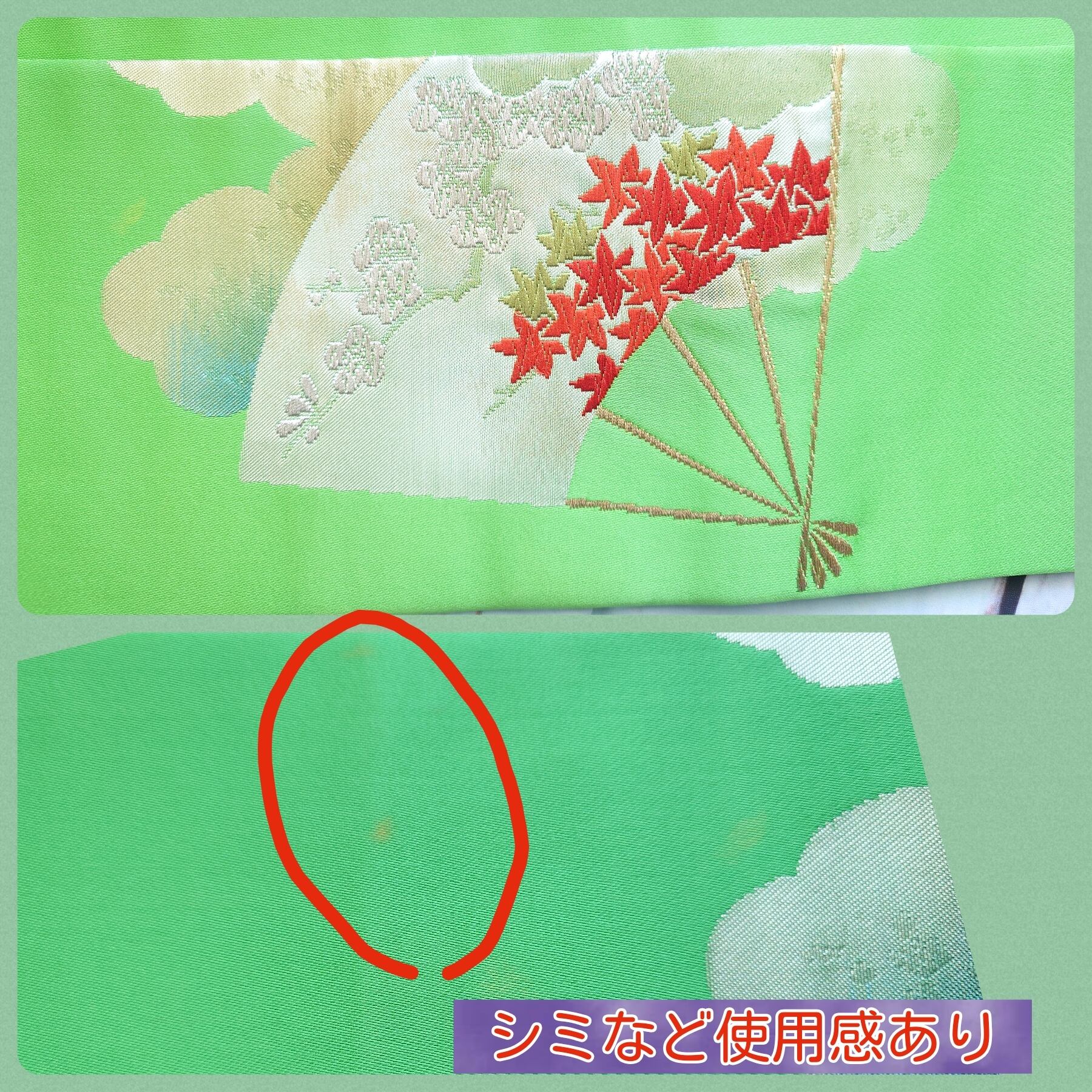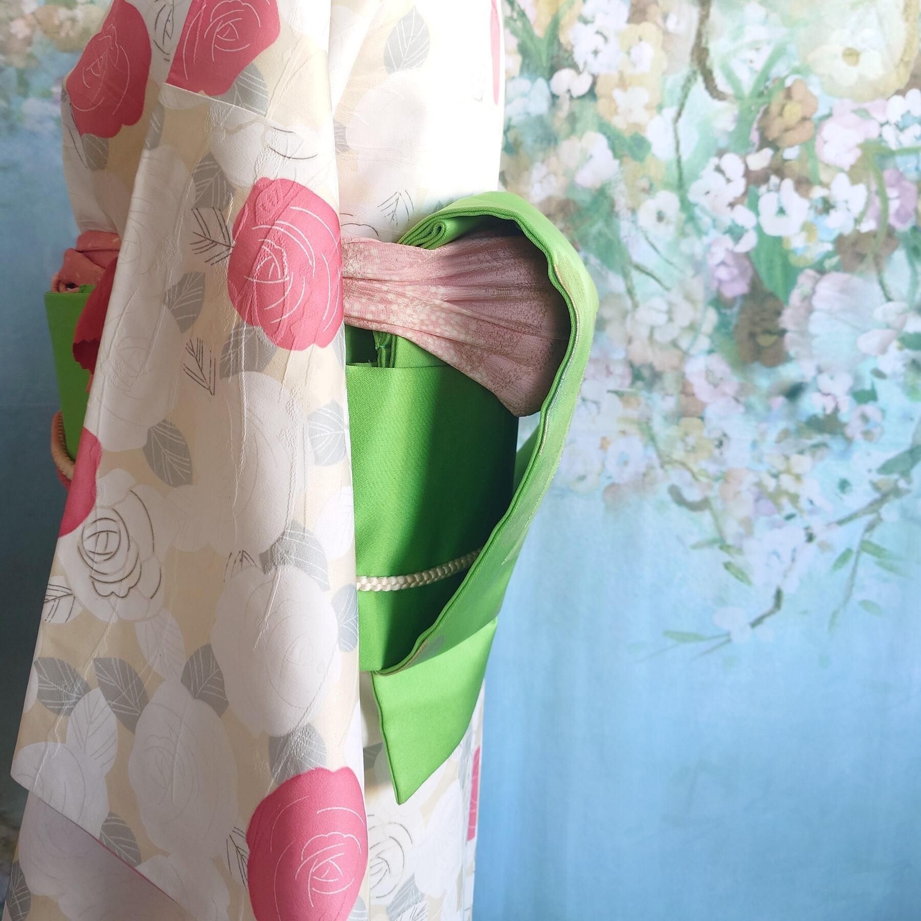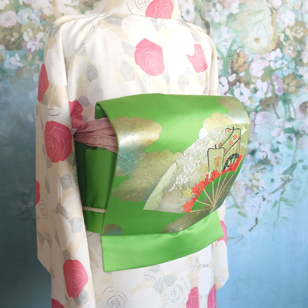 ob197 フック付 ワンタッチ二部式作り帯 一重太鼓結び 名古屋帯 萌黄色