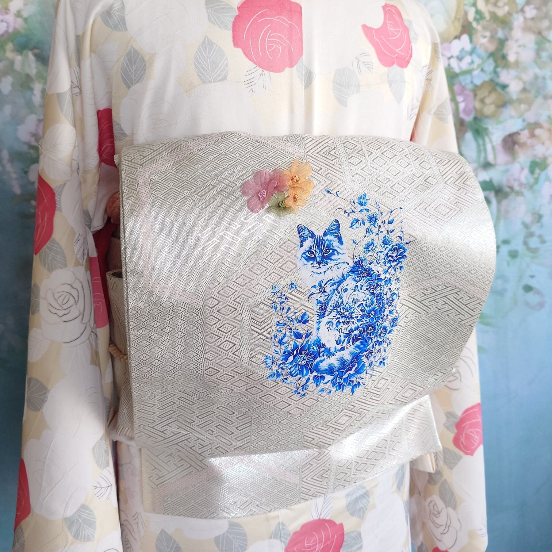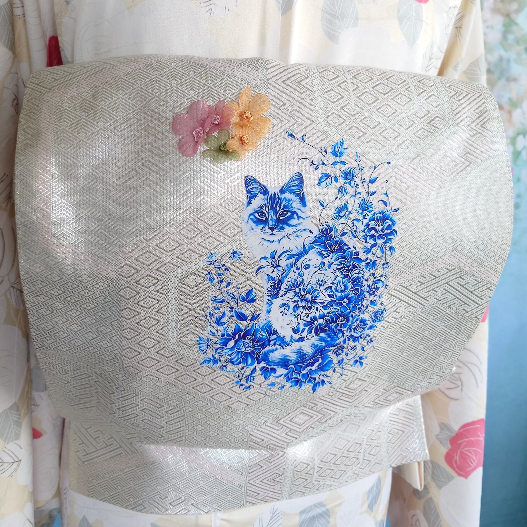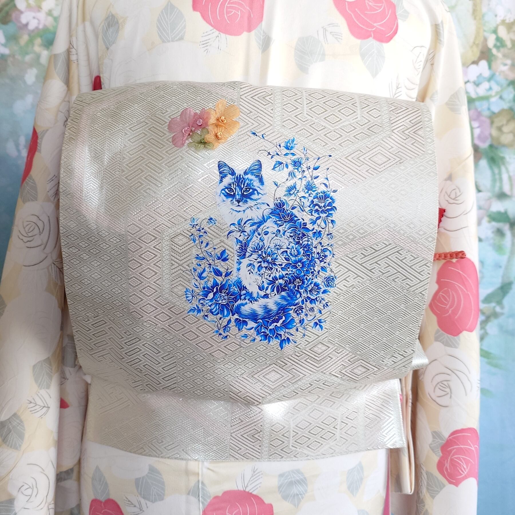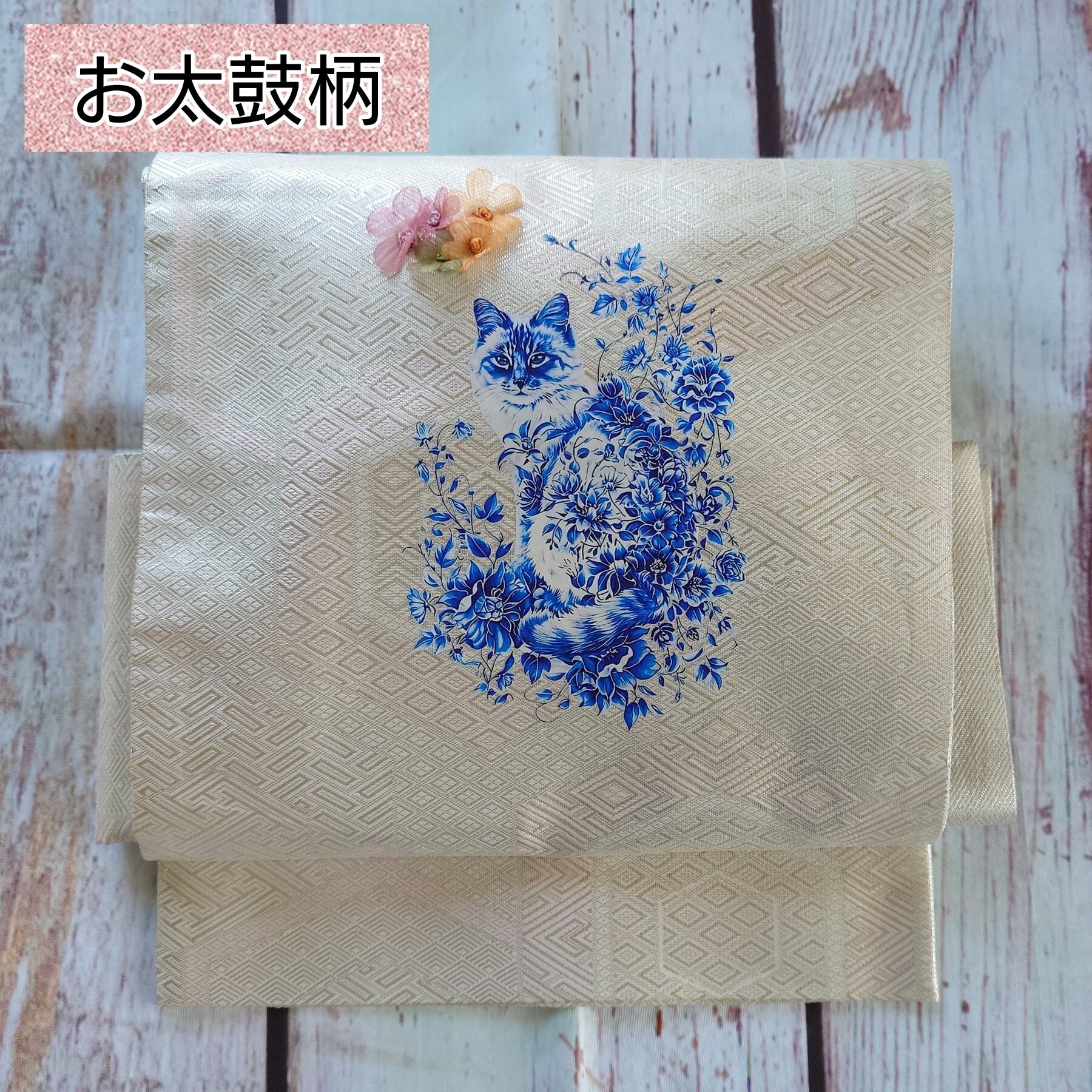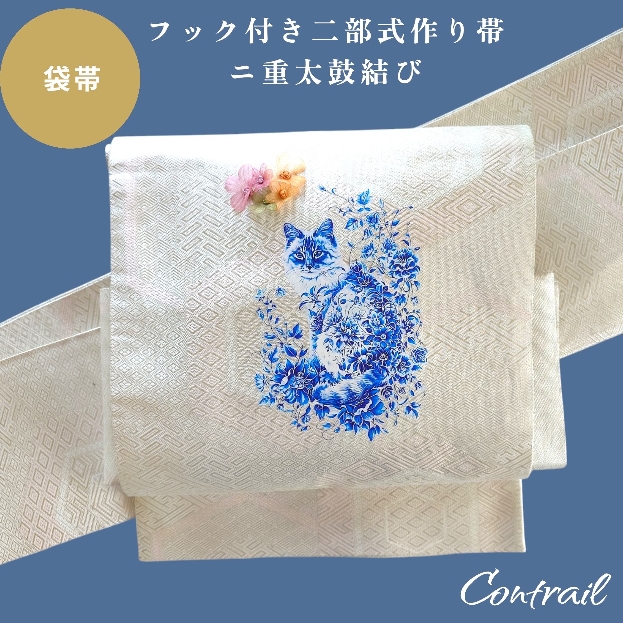 ob200 フック付 ワンタッチ二部式作り帯 ニ重太鼓結び袋帯 猫と華