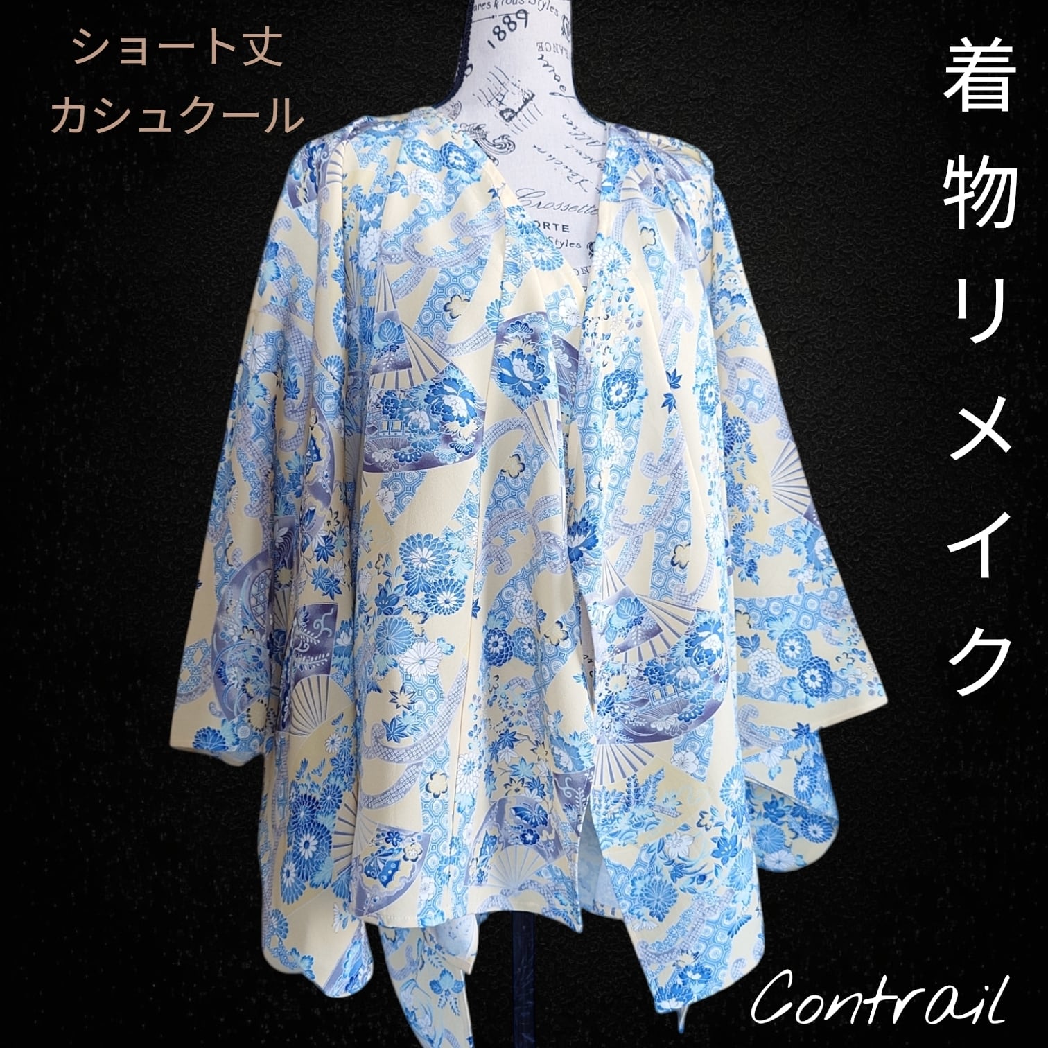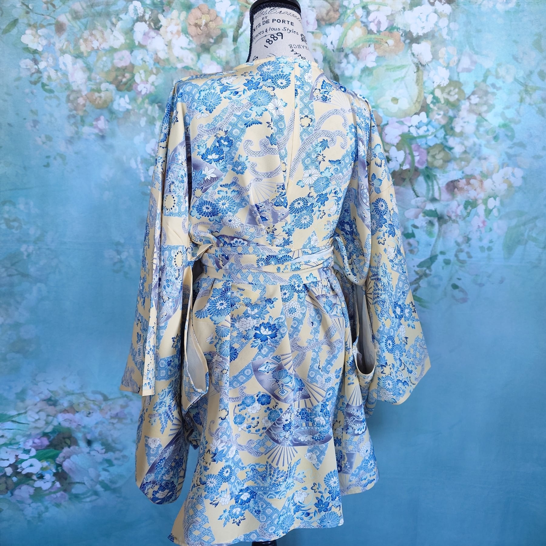 hc16 ショート丈 カシュクールガウン 幅広リボン付き 着物リメイク 小紋