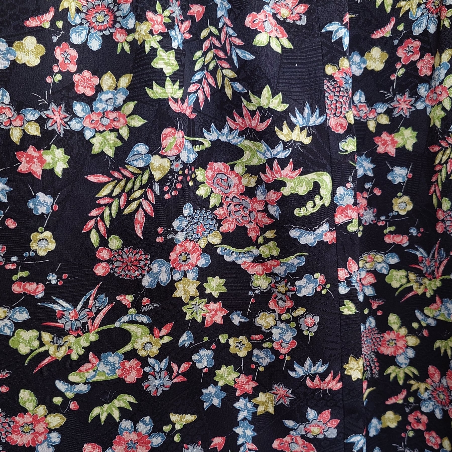 とても素敵な黒地にカラフルな花柄が特徴で、華やかでありながら落ち着いた印象のアイテムに生まれ変わっています。