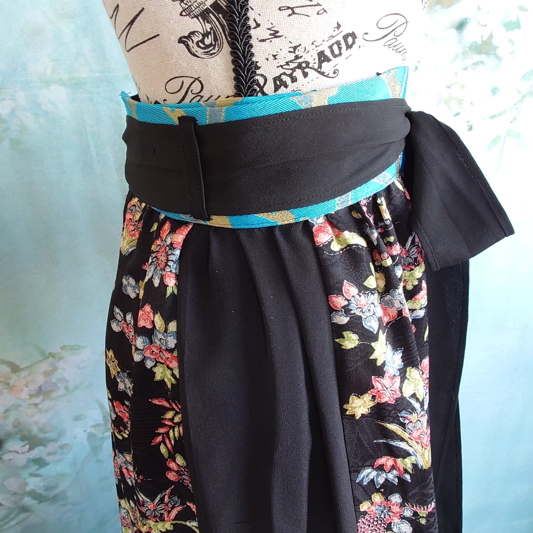 ●ボトムス:巻きスカート(ラップスカート)タイプ。黒留め袖(黒いフォーマル着物の袖部分)を一部取り入れて、ゆったりとしたギャザーを寄せたデザインに仕上げています。ウエストは紐で調整可能で、着心地が良く、シルエットも美しく出せます。