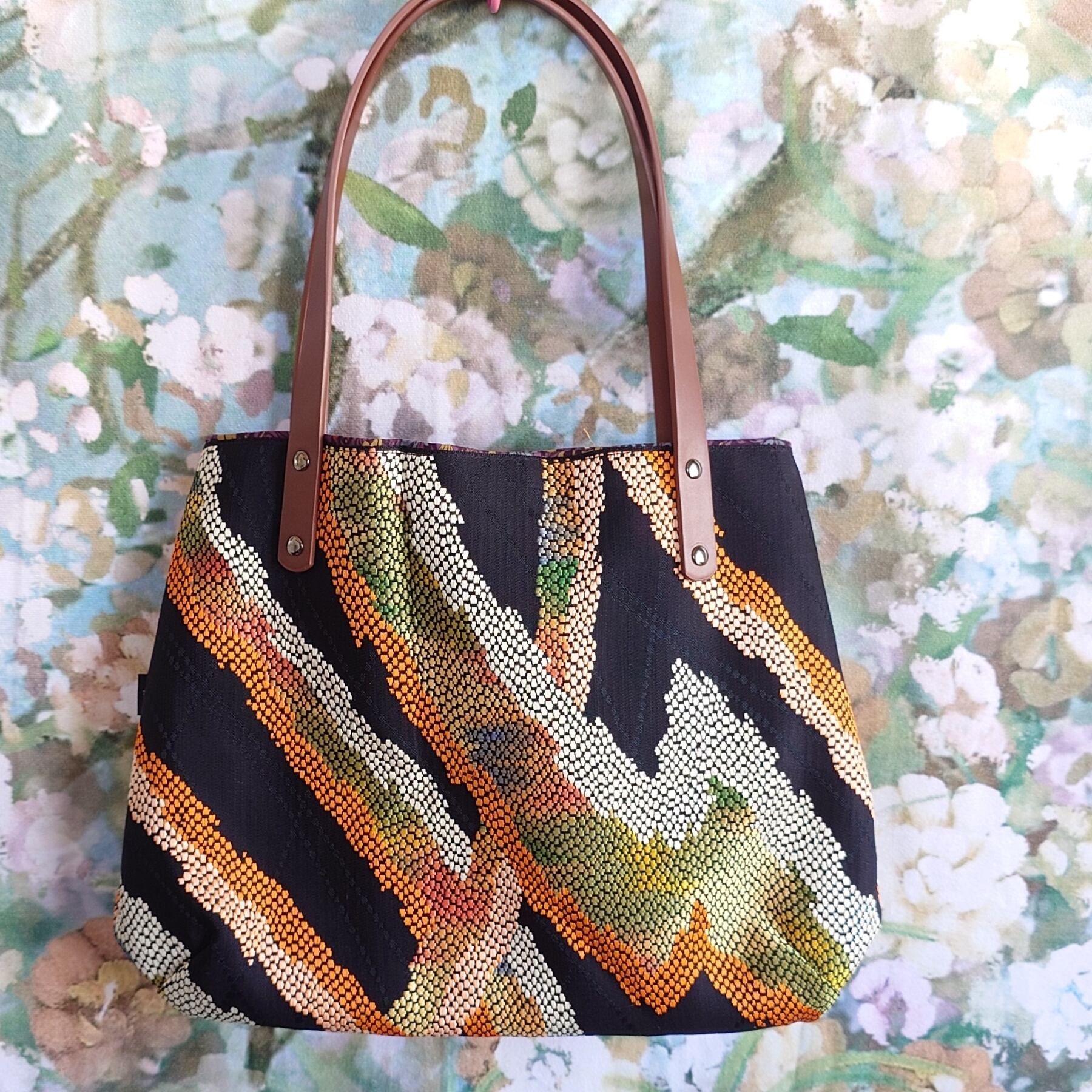 鮮やかな幾何学模様が大胆に配された帯地を贅沢に使用し、黒地にオレンジ・黄・緑のグラデーションが映えるモダンで存在感のあるデザインに仕上げました。伝統的な名古屋帯のしっかりとした張りと上質な質感が、そのままバッグの品格を高めています。
