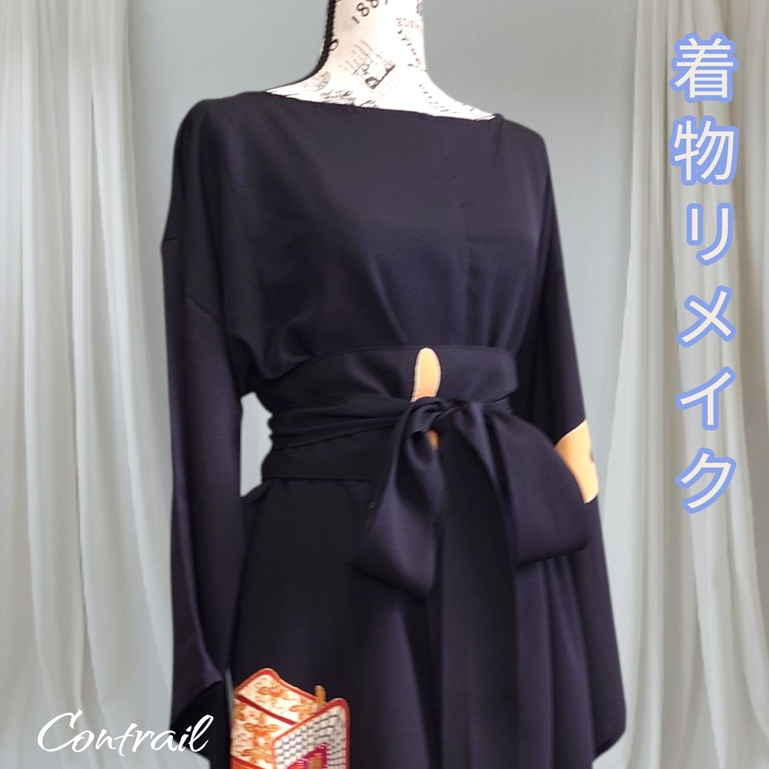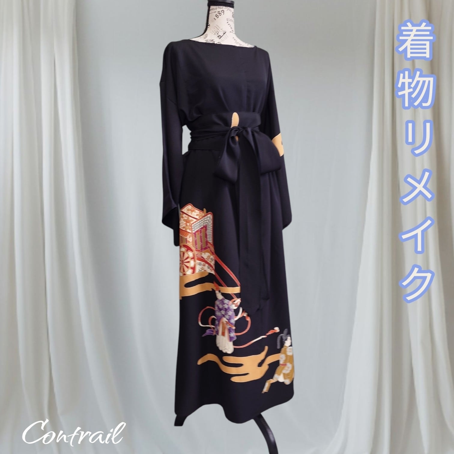d113 3Lサイズ【一点もの】黒留袖リメイク サッシュベルト付きパーティードレス 着物ドレス ワンピース 貴族