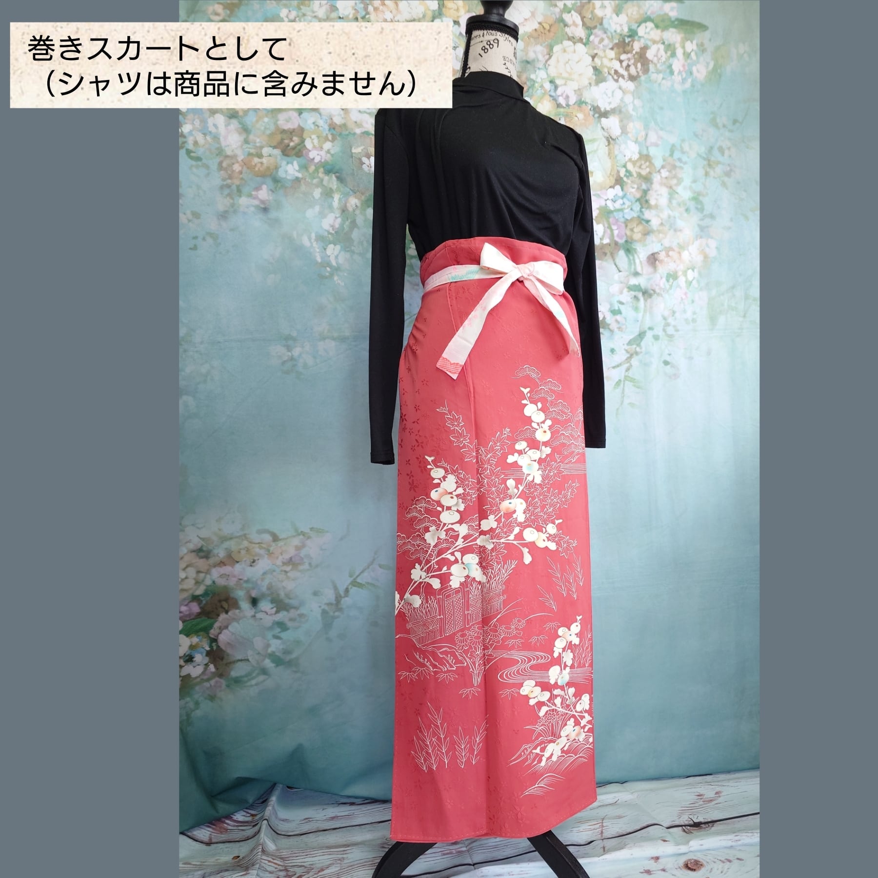 美しい赤(朱赤)の地に、白抜きの梅や松・川の風景が優雅に描かれたアンティーク調の生地を使用。