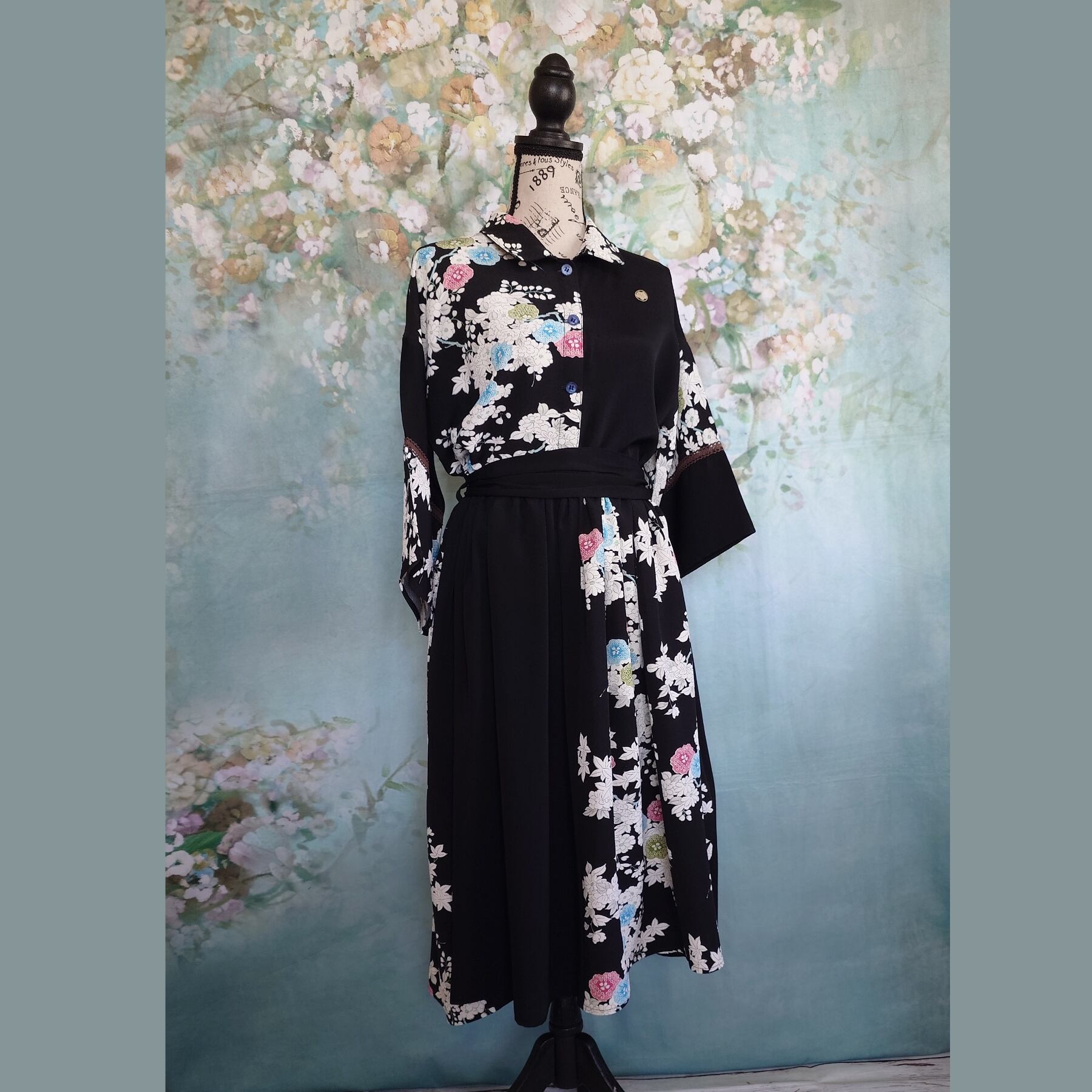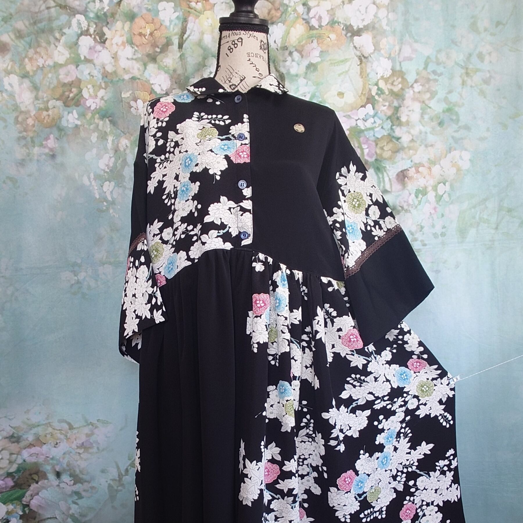 黒留袖の落ち着いた黒地に、華やかな小紋の花柄を左右対称(シンメトリー)に配置した、一点物のロングワンピースです。