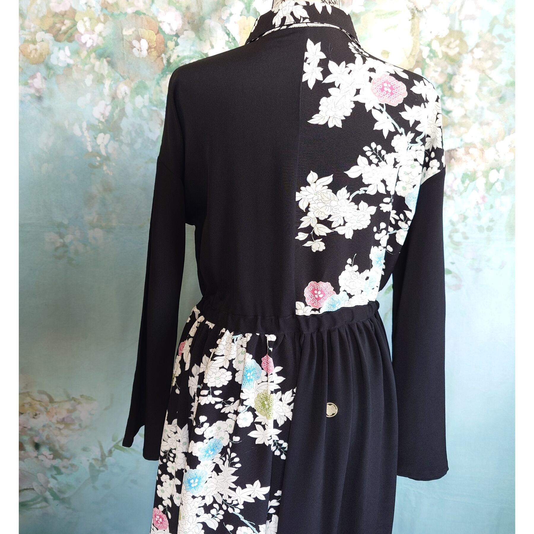 黒留袖の落ち着いた黒地に、華やかな小紋の花柄を左右対称(シンメトリー)に配置した、一点物のマキシ丈ワンピースです。