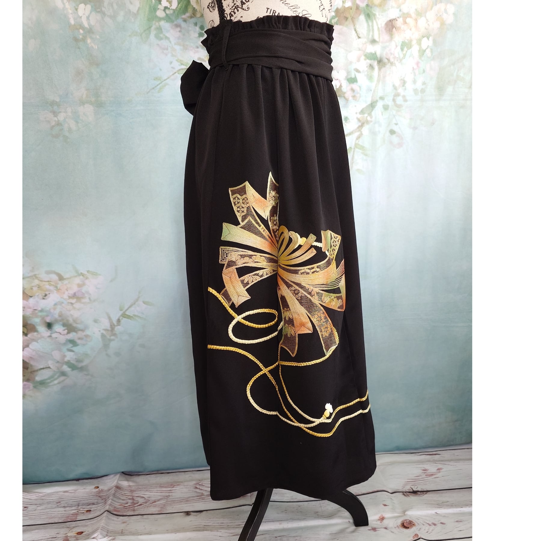 黒の落ち着いた生地に、金糸と色糸で織りなされた豪華な刺繍がアクセント。