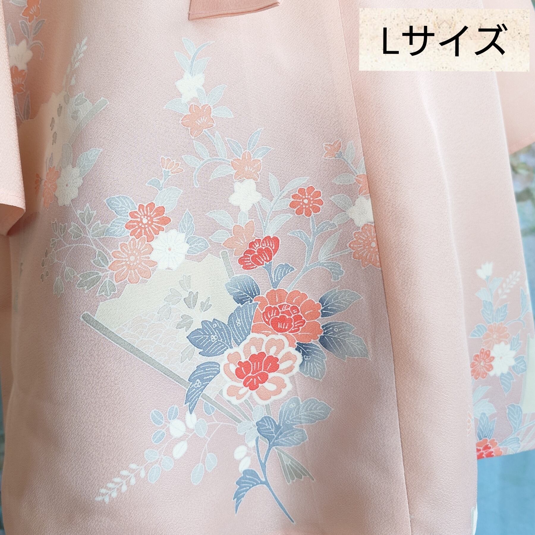 ●和柄プリント:淡いピンクのベースに、赤・白・青系の花々と扇のモチーフが散りばめられた上品なデザイン。