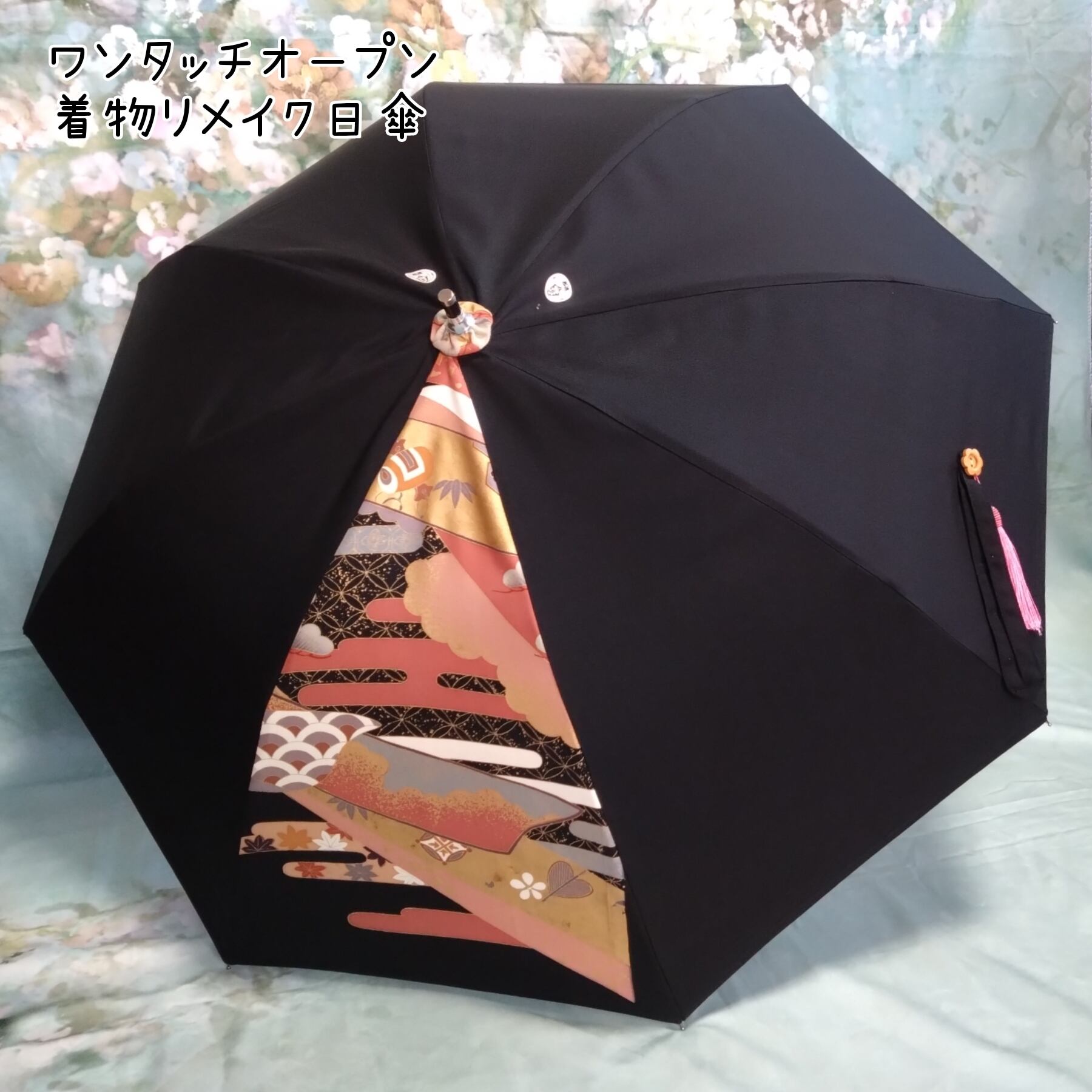 No.21 ワンタッチオープン日傘 タッセル付き 着物リメイク 黒留袖リメイク