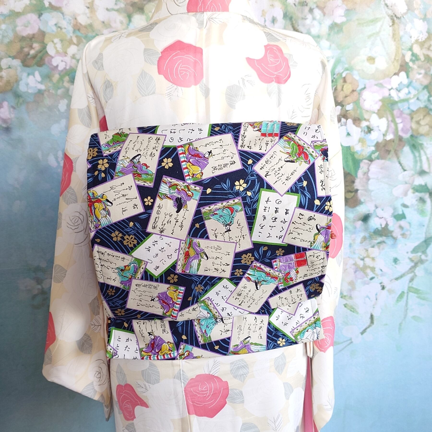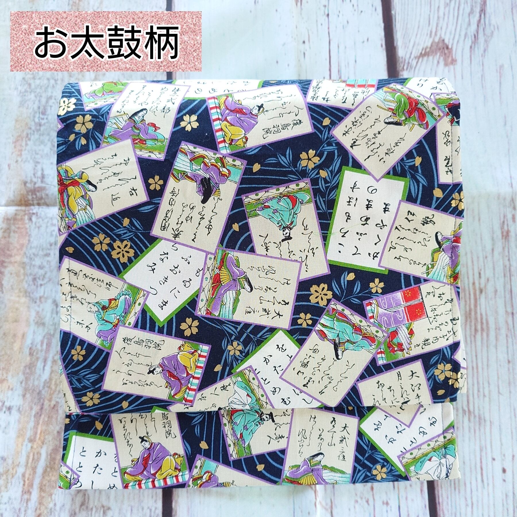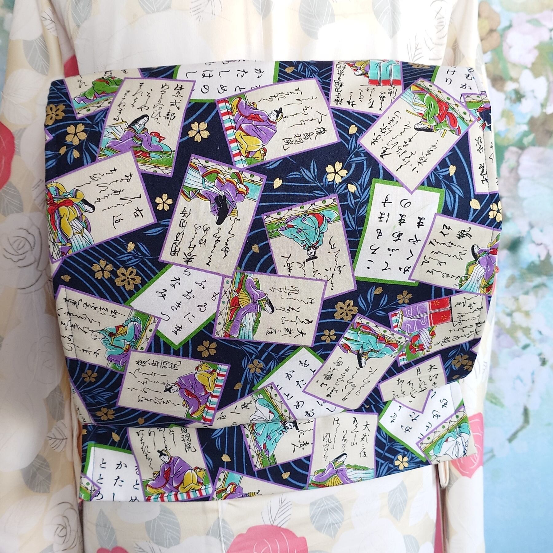 新品の名古屋帯の上に百人一首柄の布を