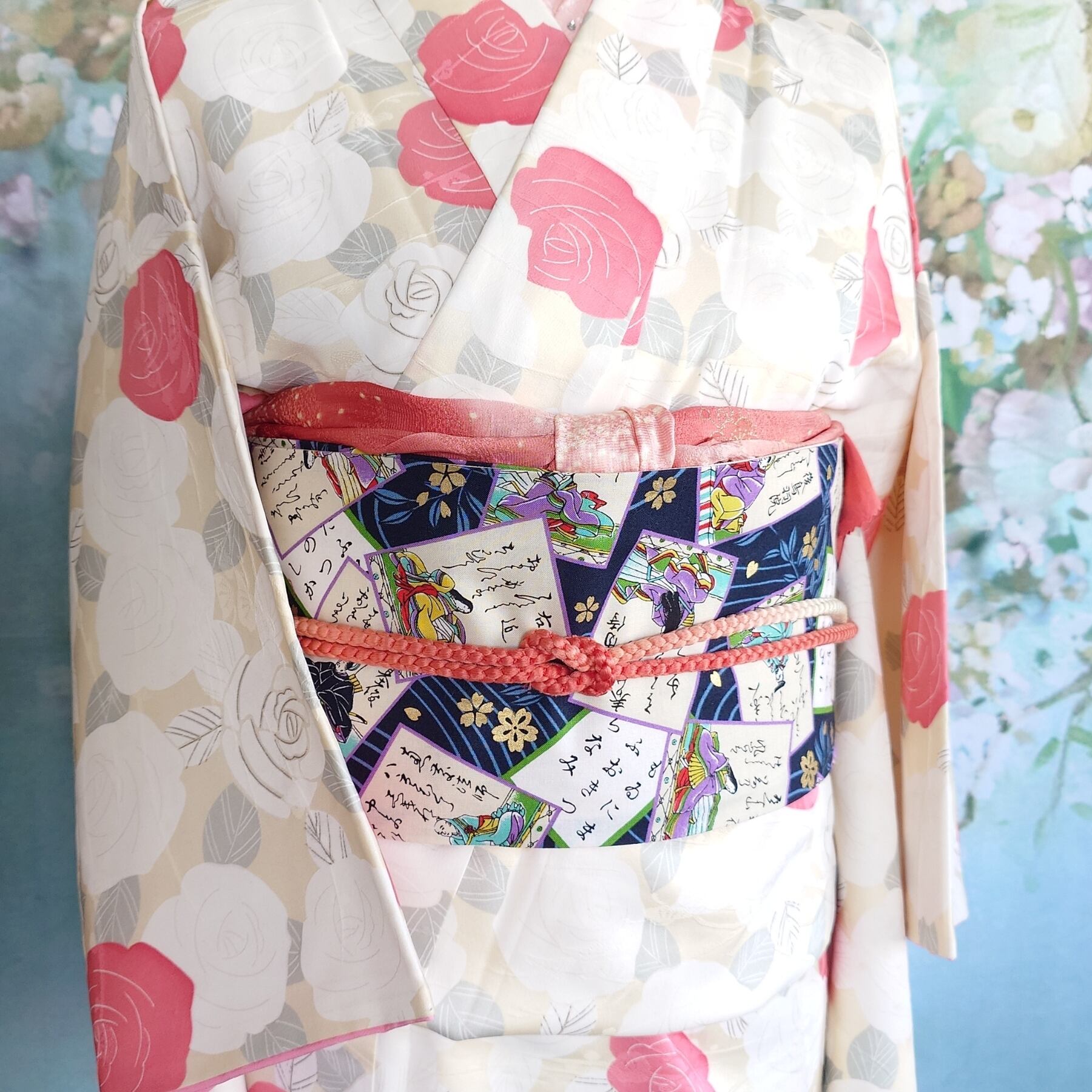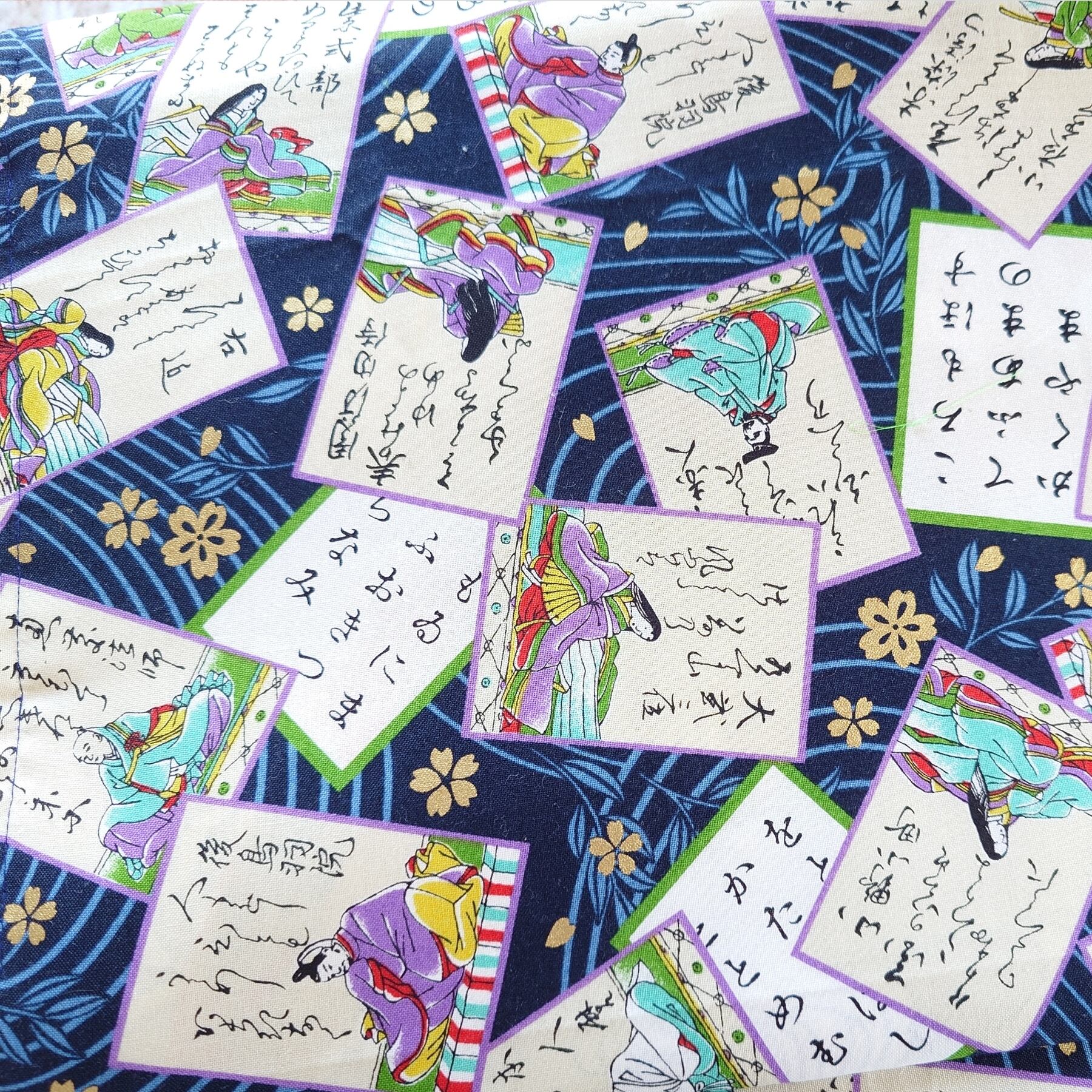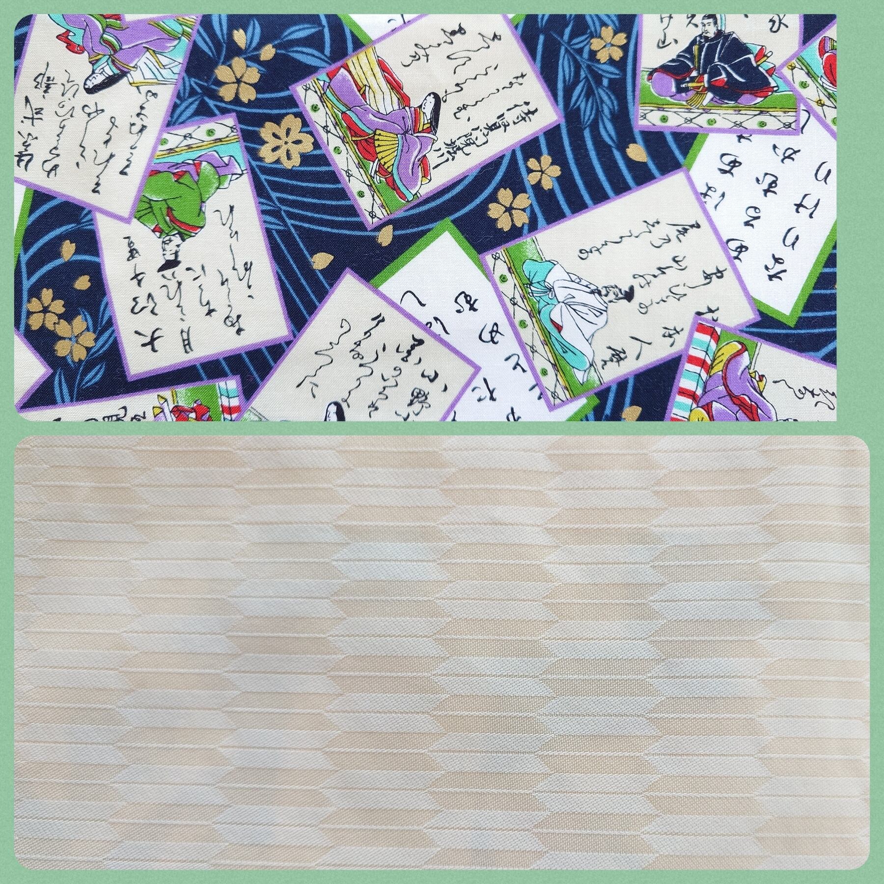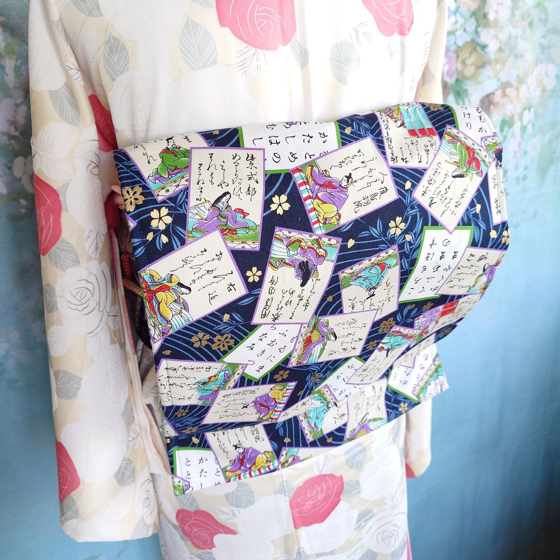 新品の名古屋帯の上に百人一首柄の布を