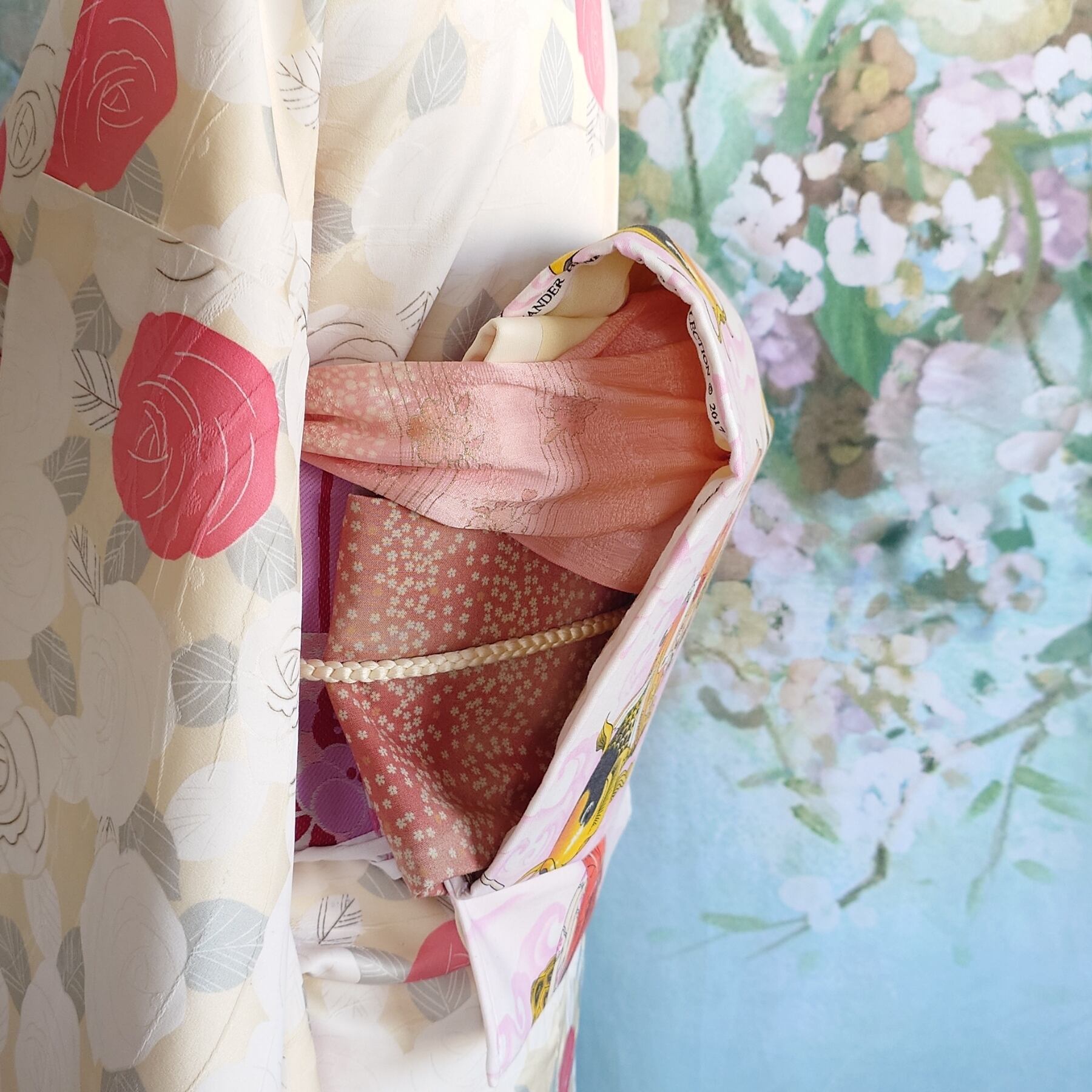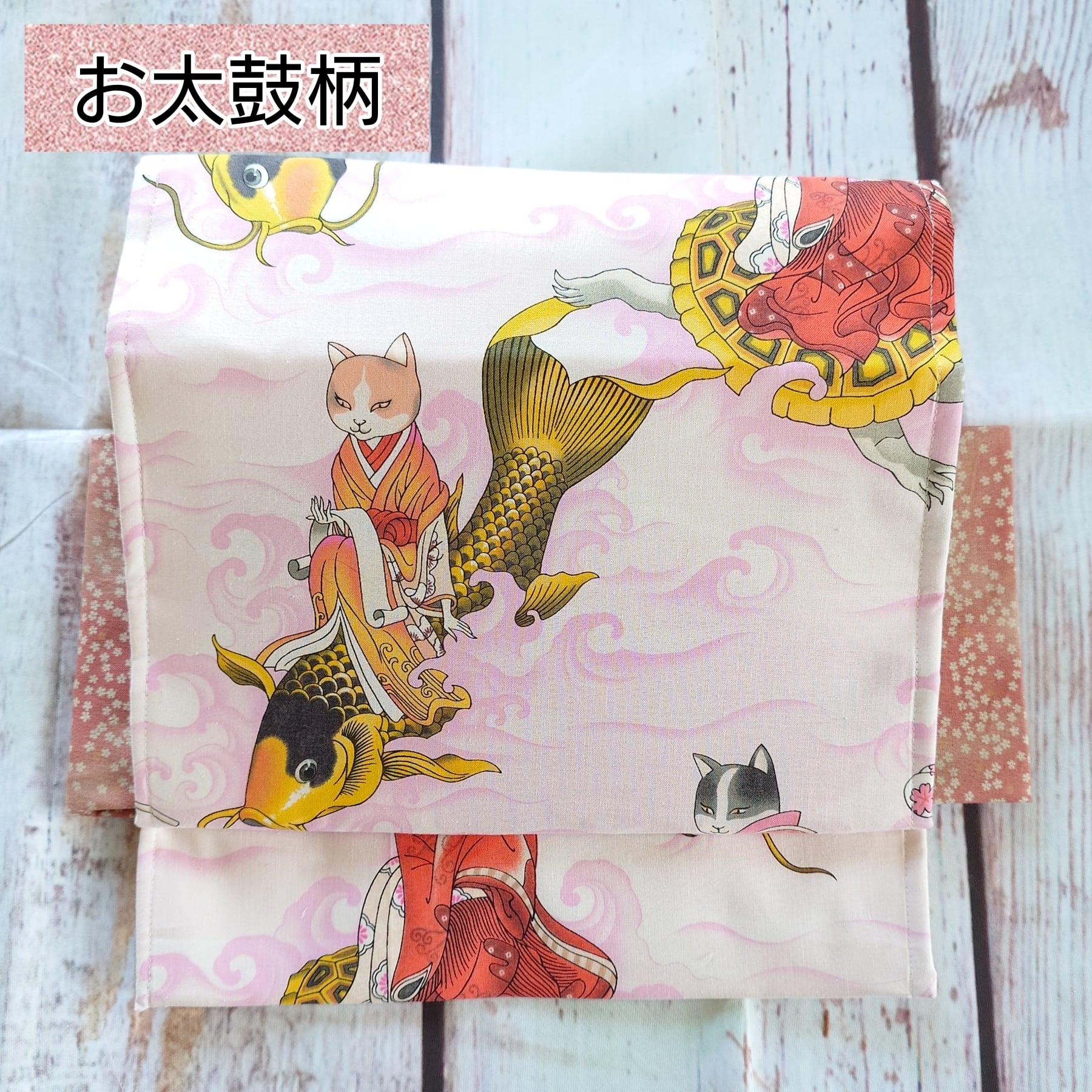 名古屋帯の上にALEXANDER HENRY(アレキサンダーヘンリー)の布を使用して縫い、