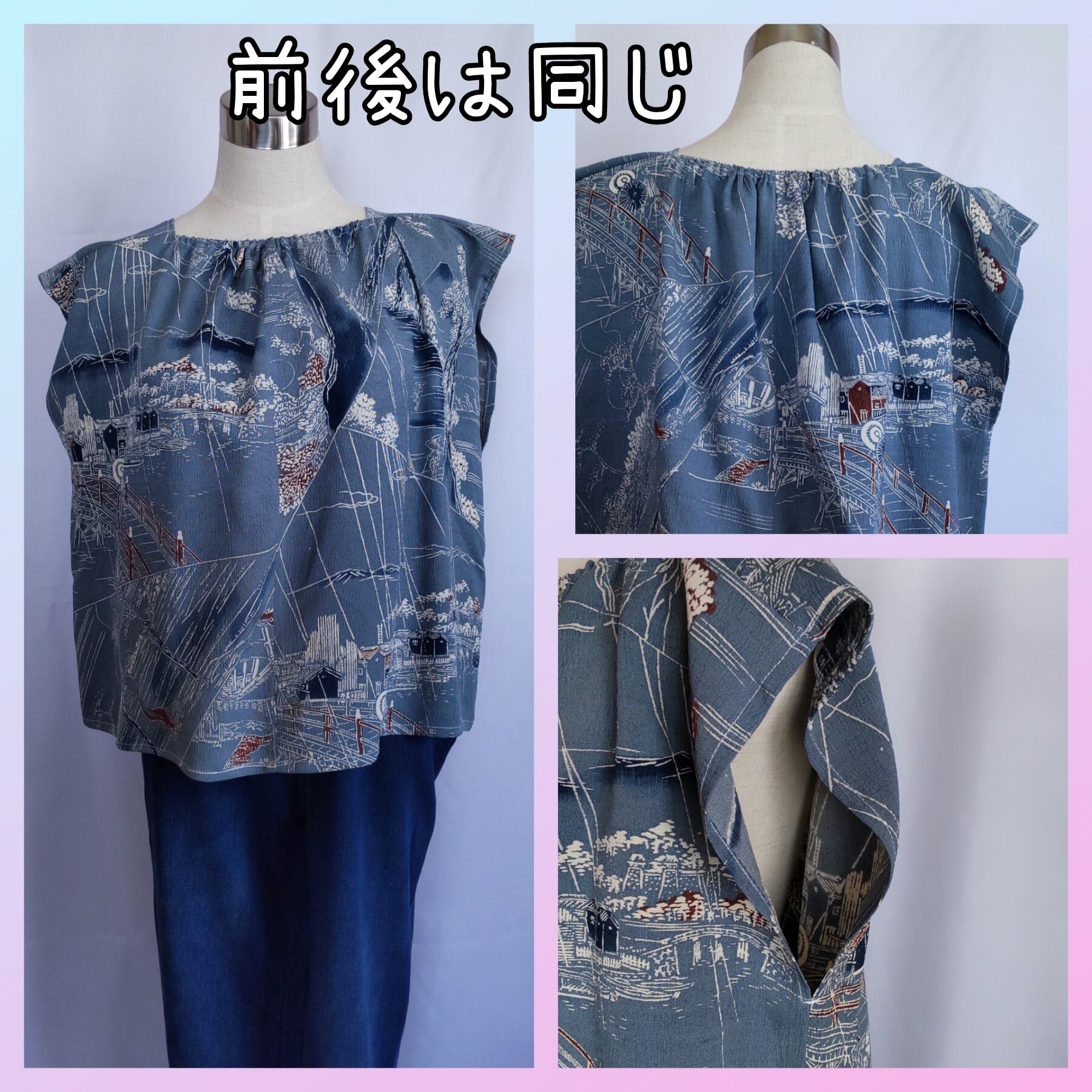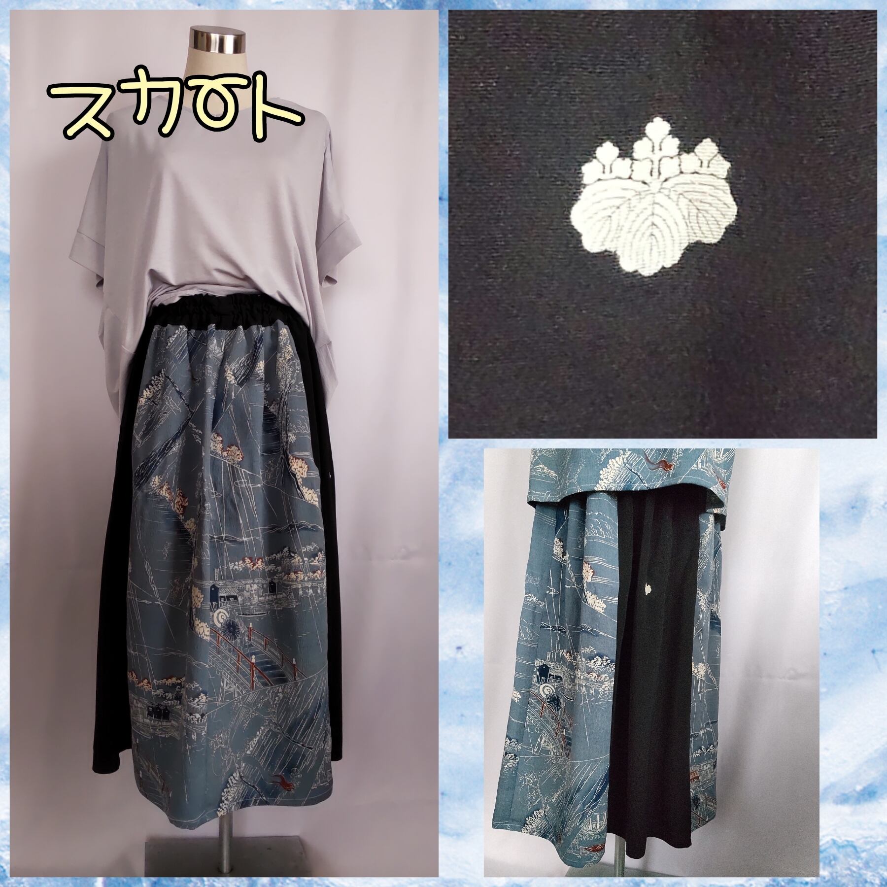 着物をほどいて私的に一番素敵に見える配置を考え裁断、縫製しました。